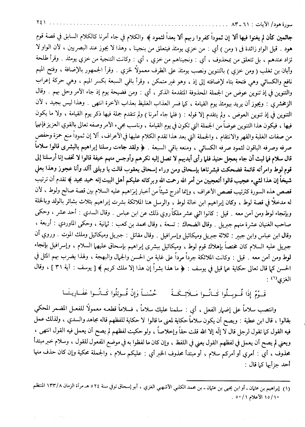 ( وَلَقَدْ جَاءتْ رُسُلُنَا إِبْراهِيمَ بِالْبُشْرَى قَالُواْ سَلَاماً قَالَ سَلَامٌ فَمَا لَبِثَ أَن جَاء بِعِجْلٍ حَنِيذٍ فَلَمَّا رَأَى أَيْدِيَهُمْ لاَ تَصِلُ إِلَيْهِ نَكِرَهُمْ وَأَوْجَسَ مِنْهُمْ خِيفَةً قَالُواْ لاَ تَخَفْ إِنَّنَا أُرْسِلْنَا إِلَى قَوْمِ لُوطٍ وَامْرَأَتُهُ قَائِمَةٌ فَضَحِكَتْ فَبَشَّرْنَاهَا بِإِسْحَاقَ وَمِن وَرَاء إِسْحَاقَ يَعْقُوبَ قَالَتْ ياأَيُّهَا ياوَيْلَتَا ءأَلِدُ وَأَنَاْ عَجُوزٌ وَهَاذَا بَعْلِى شَيْخًا إِنَّ هَاذَا لَشَىْء عَجِيبٌ قَالُواْ أَتَعْجَبِينَ مِنْ أَمْرِ اللَّهِ رَحْمَتُ اللَّهِ وَبَرَكَاتُهُ عَلَيْكُمْ أَهْلَ الْبَيْتِ إِنَّهُ حَمِيدٌ مَّجِيدٌ ( : تقدم أن ترتيب قصص هذه السورة كترتيب قصص الأعراف ، وإنما أدرج شيئاً من أخبار إبراهيم عليه السلام بين قصة صالح ولوط ، لأنّ له مدخلاً في قصة لوط ، وكان إبراهيم بن خالة لوط . والرسل هنا الملائكة ، بشرت إبراهيم بثلاث بشائر : بالولد ، وبالخلة ، وبإنجاء لوط ومن آمن معه . قيل : كانوا اثنى عشر ملكاً ، روى ذلك عن ابن عباس . وقال السدي : أحد عشر ، وحكى صاحب الغنيان عشرة منهم جبريل . وقال الضحاك : تسعة ، وقال محمد بن كعب : ثمانية ، وحكى الماوردي : أربعة ، وقال ابن عباس وابن جبير : ثلاثة جبريل ، وميكائيل ، وإسرافيل . وقال مقاتل : جبريل ، وميكائيل ، وملك الموت . وروي : أن جبريل عليه السلام كان مختصاً بإهلاك قوم لوط ، وميكائيل ببشرى إبراهيم بإسحاق عليهما السلام ، وإسرافيل بإنجاء لوط ومن آمن معه . قيل : وكانت الملائكة جرداً مرداً على غاية من الحسن والجمال والبهجة ، ولهذا يضرب بهم المثل في الحسن كما قال تعال حكاية عما قيل في يوسف : ) مَا هَاذَا بَشَرًا إِنْ هَاذَا إِلاَّ مَلَكٌ كَرِيمٌ ( وقال الغزي : قوم إذا قوبلوا كانوا ملائكة