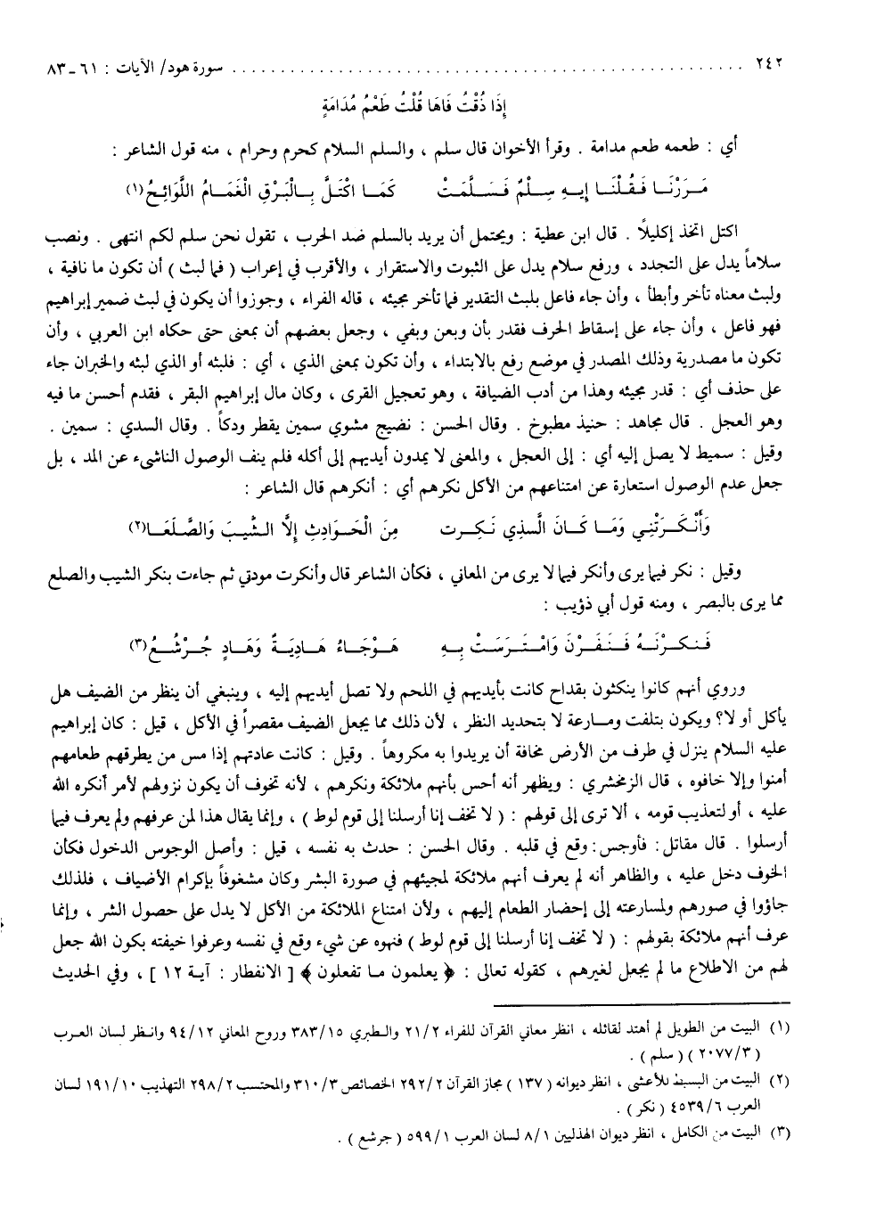 اكتل اتخذ إكليلاً . قال ابن عطية : ويحتمل أن يريد بالسلم ضد الحرب تقول : نحن سلم لكم انتهى . ونصب سلاماً يدل على التجدد ، ورفع سلام يدل على الثبوت والاستقرار ، والأقرب في إعراب فما لبث أن تكون ما نافية ، ولبث معناه تأخر وأبطأ ، وأن جاء فاعل بلبث التقدير فما تأخر مجيئه قاله : الفراء . وجوزوا أن يكون في لبث ضمير إبراهيم فهو فاعل ، وأن جاء على إسقاط الحرف فقدر بأن وبعن ، وبفي ، وجعل بعضهم أن بمعنى حتى حكاه ابن العربي . وأن تكون ما مصدرية ، وذلك المصدر في موضع رفع بالابتداء ، وأن تكون بمعنى الذي أي : فلبثه ، أو الذي لبثه ، أو الذي لبثه ، والخبر أن جاء على حذف أي : قدر مجيئه ، وهذا من أدب الضيافة ، وهو تعجيل القرى . وكان مال إبراهيم البقر ، فقدم أحسن ما فيه وهو العجل . قال مجاهد : حنيذ مطبوخ ، وقال الحسن : نضج مشوي سمين يقطر ودكا . وقال السدي : سمين ، وقيل : سميط لا يصل إليه ، أي إلى العجل . والمعنى : لا يمدون أيديهم إلى أكله ، فلم ينف الوصول الناشىء عن المدبل ، جعل عدم الوصول استعارة عن امتناعهم من الأكل . نكرهم أي أنكرهم قال الشاعر : وأنكرتني وما كان الذي نكرت