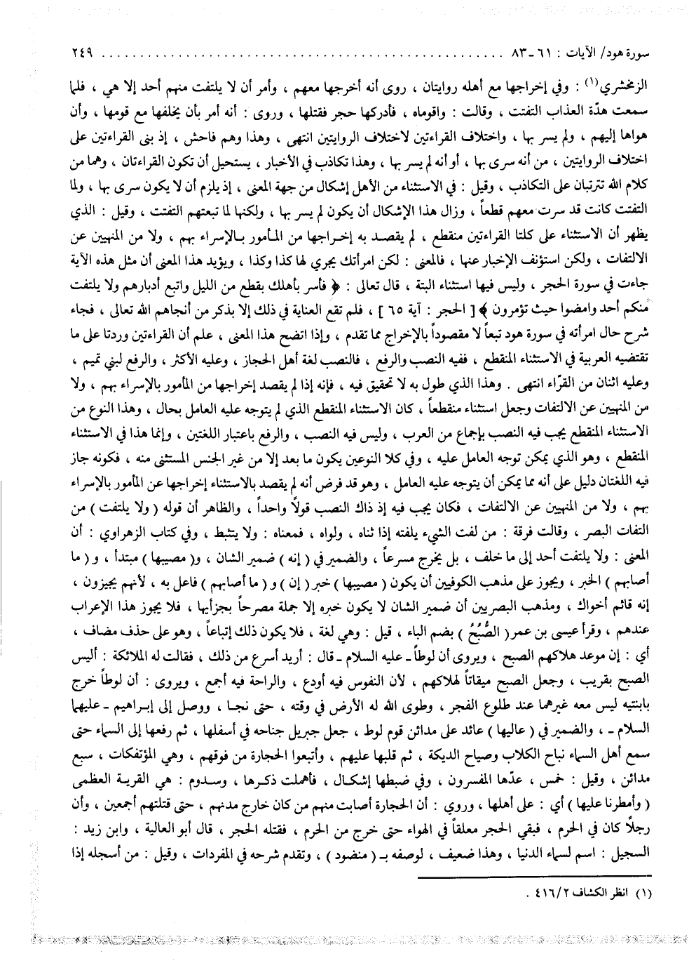الزمخشري : وفي إخراجها مع أهله روايتان : روي أنه أخرجها معهم وأمر أن لا يلتفت منهم أحد إلا هي ، فلما سمعت هدّة العذاب التفتت وقالت : واقوماه ، فأدركها حجر فقتلها . وروي أنه أمر بأن يخلفها مع قومها ، وأن هواها إليهم ، ولم يسر بها . واختلاف القراءتين لاختلاف الروايتين انتهى . وهذا وهم فاحش إذ بنى القراءتين على اختلاف الروايتين من أنه سري بها ، أو أنه لم يسر بها ، وهذا تكاذب في الأخبار يستحيل أن تكون الفراءتان وهما من كلام الله تترتبان على التكاذب . وقيل في الاستثناء من الأهل إشكال من جهة المعنى ، إذ يلزم أن لا يكون سري بها ، ولما التفتت كانت قد سرت معهم قطعاً ، وزال هذا الإشكال أن يكون لم يسر بها ، ولكنها لما تبعتهم التفتت . وقيل : الذي يظهر أن الاستثناء على كلتا القراءتين منقطع ، لم يقصد به إخراجها من المأمور بالإسراء بهم ، ولا من المنهيين عن الالتفات ، ولكن استؤنف الأخبار عنها ، فالمعنى : لكن امرأتك يجري لها كذا وكذا . ويؤيد هذا المعنى أن مثل هذه الآية جاءت في سورة الحجر ، وليس فيها استثناء ألبتة قال تعالى : فاسر بأهلك بقطع من الليل واتبع أدبارهم ولا يلتفت منكم أحد وامضوا حيث تؤمرون ، فم تقع العناية في ذلك إلا بذكر من أنجاهم الله تعالى . فجاء شرح حال امرأته في سورة هود تبعاً لا مقصوداً بالإخراج مما تقدم ، وإذا اتضح هذا المعنى علم أن القراءتين وردتا على ما تقتضيه العربية في الاستثناء المنقطع ، ففيه النصب والرفع . فالنصب لغة أهل الحجاز وعليه الأكثر ، والرفع لبني تميم وعليه اثنان من القرّاء انتهى . وهذا الذي طول به لا تحقيق فيه ، فإنه إذا لم يقصد إخراجها من المأمور بالإسراء بهم ولا من المنهييين عن الالتفات ، وجعل استثناء منقطعاً كان الاستثناء المنقطع الذي لم يتوجه عليه العامل بحال ، وهذا النوع من الاستثناء المنقطع يجب فيه النصب بإجماع من العرب ، وليس فيه النصب والرفع باعتبار اللغتين ، وإنما هذا في الاستثناء المنقطع ، وهو الذي يمكن توجه العامل عليه . وفي كلا النوعين يكون ما بعد إلا من غير الجنس المستثنى منه ، فكونه جاز فيه اللغتان دليل على أنه مما يمكن أن يتوجه عليه العامل ، وهو قد فرض أنه لم يقصد بالاستثناء إخراجها عن المأمور بالإسراء بهم ، ولا من المنهيين عن الالتفات ، فكان يجب فيه إذذاك النصب قولاً واحداً . والظاهر أن قوله ولا يلتفت ، من التفات البصر . وقالت فرقة : من لفت الشيء يلفته إذا ثناه ولواه ، فمعناه : ولا يتثبط . وفي كتاب الزهراوي أنّ المعنى : ولا يلتفت أحد إلى ما خلف بل يخرج مسرعاً . والضمير في أنه ضميرالشأن ، ومصيبها مبتدأ ، وما أصابهم الخبر . ويجوز على مذهب الكوفيين أن يكون مصيبها خبر إن ، وما أصابهم فاعل به ، لأنهم يجيزون أنه قائم أخواك . ومذهب البصريين أنّ ضمير الشان لا يكون خبره إلا جملة مصرحاً بجزءيها ، فلا يجوز هذا الإعراب عندهم .