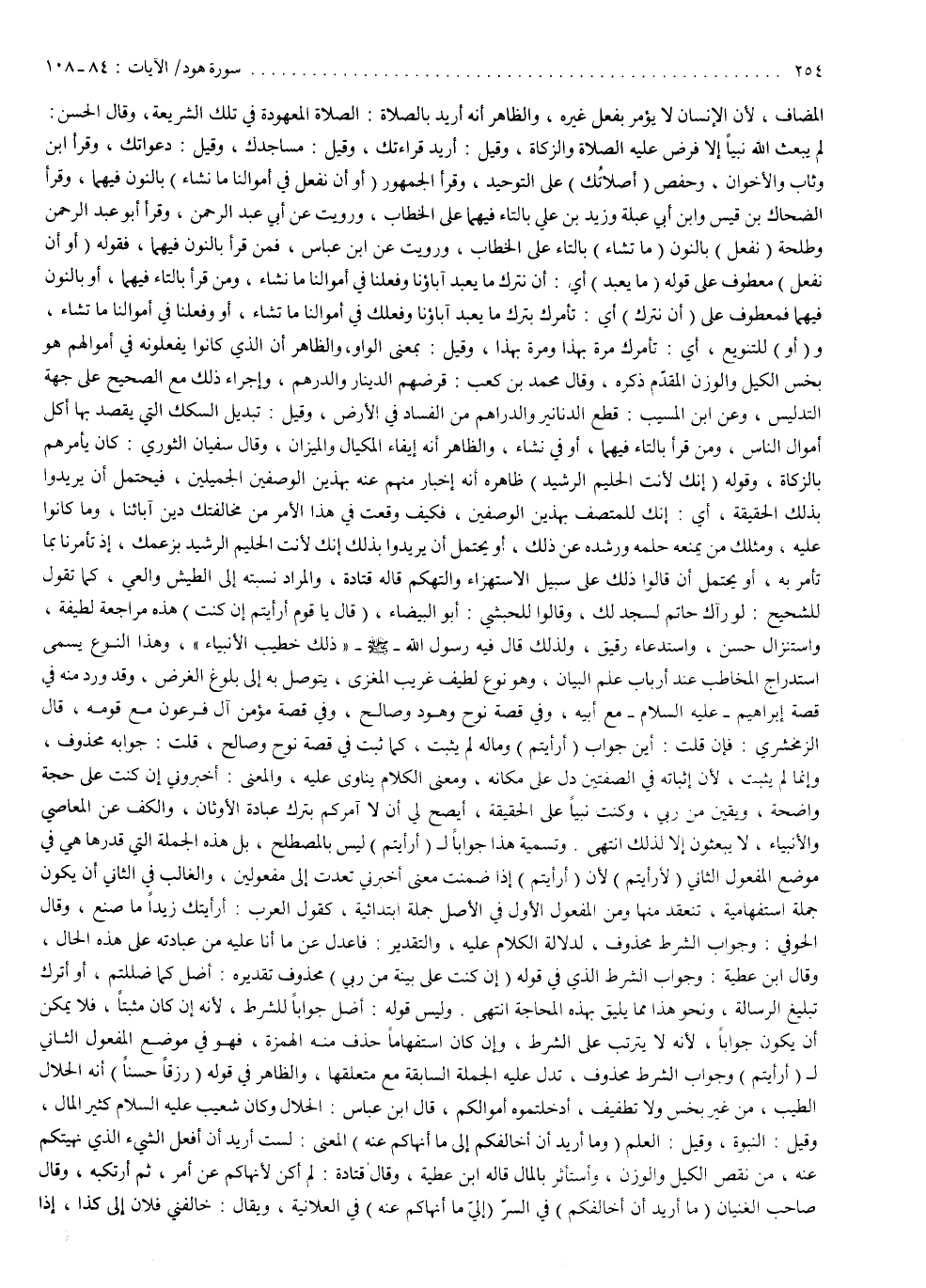 المضاف لأن الإنسان لا يؤمر بفعل غيره . والظاهر أنه أريد بالصلاة الصلاة المعهودة في تلك الشريعة . وقال الحسن : لم يبعث الله نبياً إلى فرض عليه الصلاة والزكاة . وقيل : أريد قراءتك . وقيل : مساجدك . وقيل : دعواتك . وقرأ ابن وثاب والأخوان وحفص : أصلاتك على التوحيد . وقرأ الجمهور : أو أن نفعل في أموالنا ما نشاء بالنون فيهما . وقرأ الضحاك بن قيس ، وابن أبي عبلة ، وزيد بن علي : بالتاء فيهما على الخطاب ، ورويت عن أبي عبد الرحمن . وقرأ أبو عبد الرحمن وطلحة : نفعل بالنون ، ما نشاء بالتاء على الخطاب ، ورويت عن ابن عباس . فمن قرأ بالنون فيهما فقوله : أو أن نفعل معطوف على قوله : ما يعبد أي : أن نترك ما يعبد آباؤنا وفعلنا في أموالنا ما نشاء . ومن قرأ بالتاء فيهما أو بالنون فيهما فمعطوف على أن نترك أي : تأمرك بترك ما يعبد آباؤنا ، وفعلك في أموالنا ما تشاء ، أو وفعلنا في أموالنا ما تشاء . وأو للتنويع أي : تأمرك مرة بهذا ، ومرة بهذا . وقيل : بمعنى الواو . والظاهر أنّ الذي كانوا يفعلونه في أموالهم هو بخس الكيل والوزن المقدّم ذكره . وقال محمد بن كعب : قرضهم الدينار والدرهم ، وإجراء ذلك مع الصحيح على جهة التدليس ، وعن ابن المسيب : قطع الدنانير والدراهم من الفساد في الأرض . وقيل : تبديل السكك التي يقصد بها أكل أموال الناس . ومن قرأ بالتاء فيهما أو في نشاء ، والظاهر أنه إيفاء المكيال والميزان . وقال سفيان الثوري : كان يأمرهم بالزكاة . وقوله : إنك لأنت الحليم الرشيد ظاهره أنه إخبار منهم عنه بهذين الوصفين الجميلين ، فيحتمل أن يريدوا بذلك الحقيقة أي : أنك للمتصف بهذين الوصفين ، فكيف وقعت في هذا الأمر من مخالفتك دين آبائنا وما كانوا عليه ، ومثلك من يمنعه حلمه ورشده عن ذلك . أو يحتمل أن يريدوا بذلك إنك لأنت الحليم الرشيد بزعمك إذ تأمرنا بما تأمر به . أو يحتمل أن قالوا ذلك على سبيل الاستهزاء والتهكم ، قاله قتادة . والمراد : نسبته إلى الطيش والعي كما تقول للشحيح : لو رآك حاتم لسجد لك ، وقالوا للحبشي : أبو البيضاء . قال : يا قوم أرأيتم إن كنت هذه مراجعة لطيفة واستنزال حسن ، واستدعاء رقيق ، ولذلك قال فيه رسول لله ( صلى الله عليه وسلم ) ) : ( ذلك خطيب الأنبياء ) وهذا النوع يسمى استدراج المخاطب عند أرباب علم البيان ، وهو نوع لطيف غريب المغزى يتوصل به إلى بلوغ الغرض ، وقد ورد منه في قصة إبراهيم عليه السلام مع أبيه ، وفي قصة نوح وهود وصالح ، وفي قصة مؤمن آل فرعون مع قومه .
