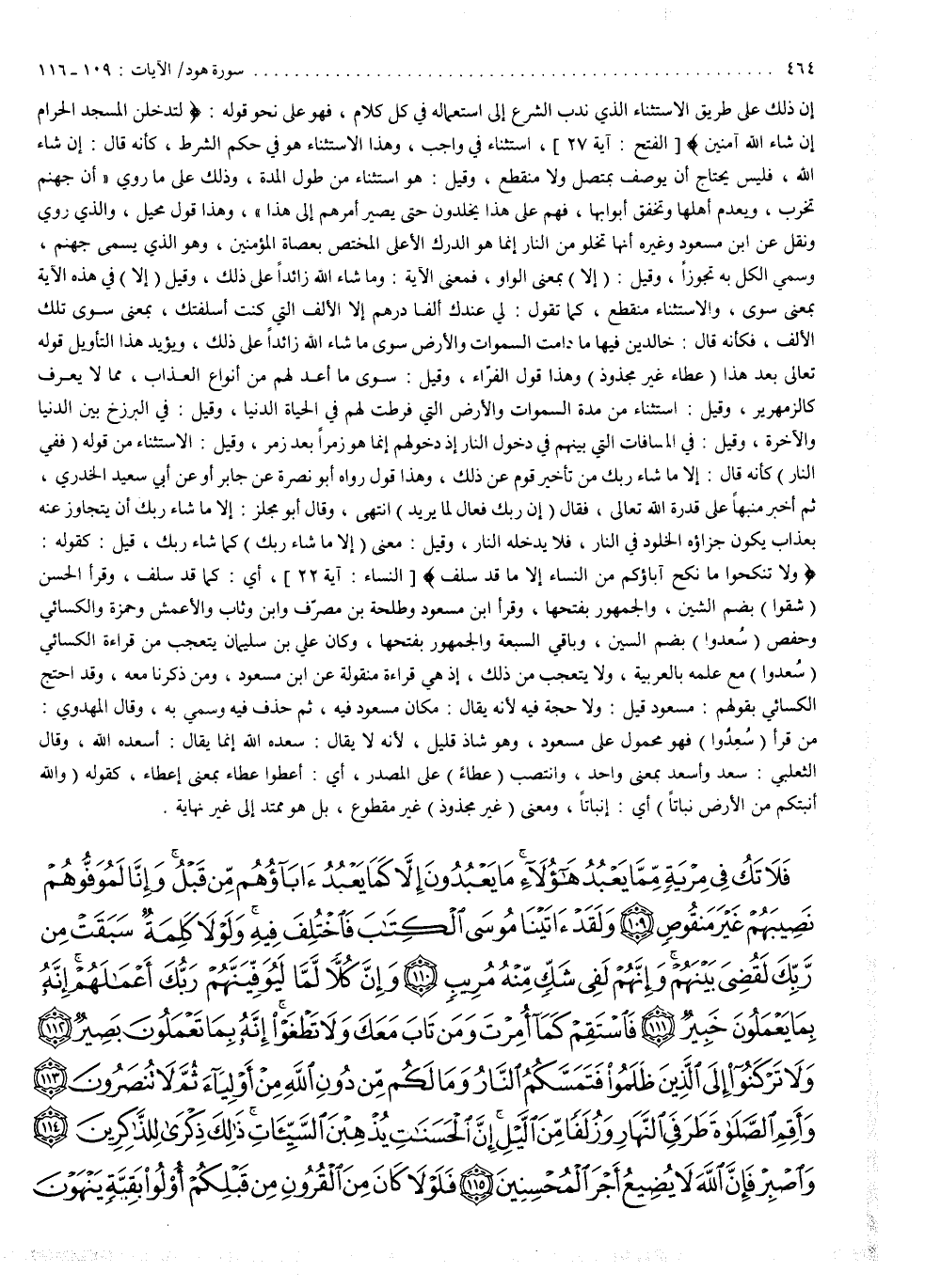 2 ( ) فَلاَ تَكُ فِى مِرْيَةٍ مِّمَّا يَعْبُدُ هَاؤُلاءِ مَا يَعْبُدُونَ إِلاَّ كَمَا يَعْبُدُ ءَابَاؤهُم مِّن قَبْلُ وَإِنَّا لَمُوَفُّوهُمْ نَصِيبَهُمْ غَيْرَ مَنقُوصٍ وَلَقَدْ ءَاتَيْنَا مُوسَى الْكِتَابَ فَاخْتُلِفَ فِيهِ وَلَوْلاَ كَلِمَةٌ سَبَقَتْ مِن رَّبِّكَ لَقُضِىَ بَيْنَهُمْ وَإِنَّهُمْ لَفِى شَكٍّ مِّنْهُ مُرِيبٍ وَإِنَّ كُلاًّ لَّمَّا لَيُوَفِّيَنَّهُمْ رَبُّكَ أَعْمَالَهُمْ إِنَّهُ بِمَا يَعْمَلُونَ خَبِيرٌ فَاسْتَقِمْ كَمَآ أُمِرْتَ وَمَن تَابَ مَعَكَ وَلاَ تَطْغَوْاْ إِنَّهُ بِمَا تَعْمَلُونَ بَصِيرٌ وَلاَ تَرْكَنُواْ إِلَى الَّذِينَ ظَلَمُواْ فَتَمَسَّكُمُ النَّارُ وَمَا لَكُمْ مِّن دُونِ اللَّهِ مِنْ أَوْلِيَآءَ ثُمَّ لاَ تُنصَرُونَ وَأَقِمِ الصَّلَواةَ طَرَفَىِ النَّهَارِ وَزُلَفاً مِّنَ الَّيْلِ إِنَّ الْحَسَنَاتِ يُذْهِبْنَ السَّيِّئَاتِ ذالِكَ ذِكْرَى لِلذَاكِرِينَ وَاصْبِرْ فَإِنَّ اللَّهَ لاَ يُضِيعُ أَجْرَ الْمُحْسِنِينَ فَلَوْلاَ كَانَ مِنَ الْقُرُونِ مِن قَبْلِكُمْ أُوْلُواْ بَقِيَّةٍ يَنْهَوْن