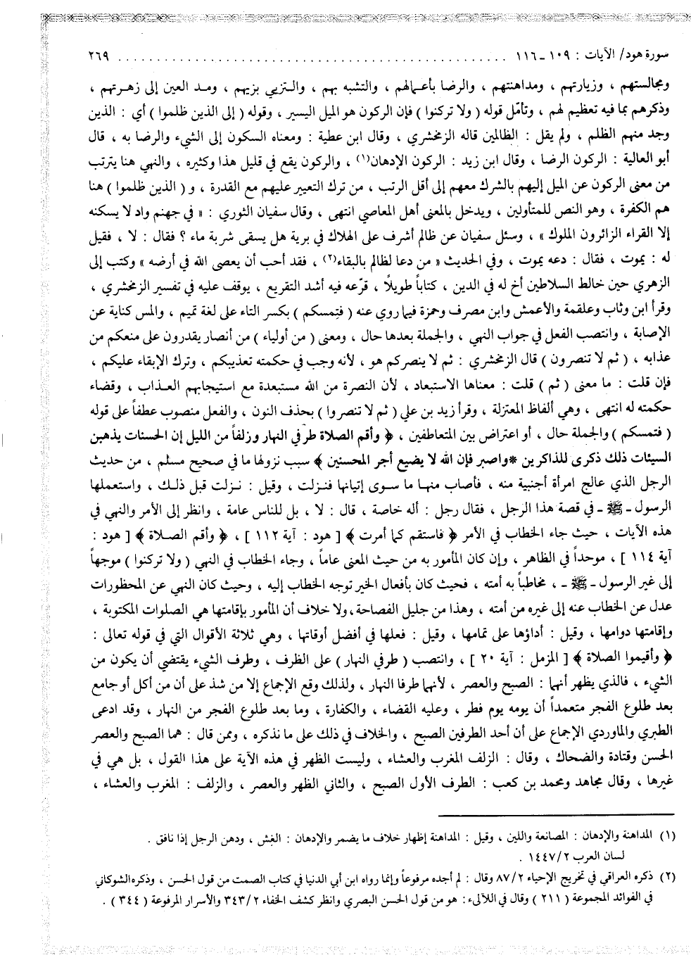 ( وَأَقِمِ الصَّلَواةَ طَرَفَىِ النَّهَارِ وَزُلَفاً مِّنَ الَّيْلِ إِنَّ الْحَسَنَاتِ يُذْهِبْنَ السَّيّئَاتِ ذالِكَ ذِكْرَى لِلذكِرِينَ وَاصْبِرْ فَإِنَّ اللَّهَ لاَ يُضِيعُ أَجْرَ الْمُحْسِنِينَ ( : سبب نزولها ما في صحيح مسلم من حديث الرجل الذي عالج امرأة أجنبية منه ، فأصاب منها ما سوى إتيانها فنزلت . وقيل : نزلت قبل ذلك ، واستعملها الرسول ( صلى الله عليه وسلم ) ) في قصة هذا الرجل فقال رجل : أله خاصة ؟ قال : ( لا ، بل للناس عامة ) وانظر إلى الأمر والنهي في هذه الآيات ، حيث جاء الخطاب في الأمر ، ( وَاسْتَقِمْ كَمَا أُمِرْتَ ( ، وأقم الصلاة ، موحداً في الظاهر ، وإن كان المأمور به من حيث المعنى عاماً ، وجاء الخطاب في النهي : ) وَلاَ تَرْكَنُواْ ( موجهاً إلى غير الرسول ( صلى الله عليه وسلم ) ) ، مخاطباً به أمته ، فحيث كان بأفعال الخير توجه الخطاب إليه ، وحيث كان النهي عن المحظورات عدل عن الخطاب عنه إلى غيره من أمته ، وهذا من جليل الفصاحة . ولا خلاف أنّ المأمور بإقامتها هي الصلوات المكتوبة ، وإقامتها دوامها ، وقيل : أداؤها على تمامها ، وقيل : فعلها في أفضل أوقاتها ، وهي ثلاثة الأقوال التي في قوله تعالى : وأقيموا الصلاة .