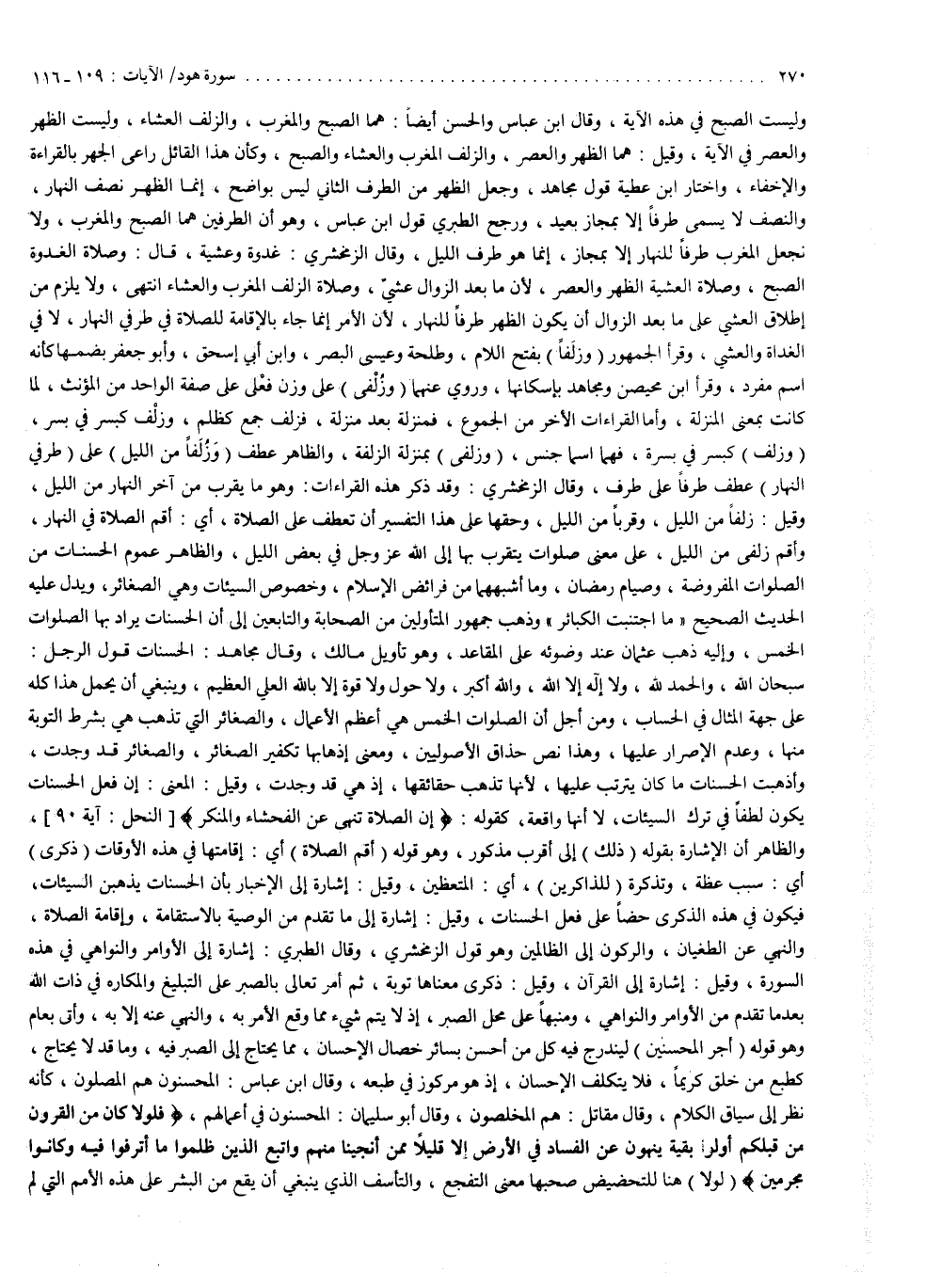 وقرأ الجمهور : وزلفاً بفتح اللام ، وطلحة وعيسى البصرة وابن أبي إسحاق وأبو جعفر : بضمها كأنه اسم مفرد . وقرأ ابن محيصن ومجاهد : بإسكانها وروي عنهما : وزلفى على وزن فعلى على صفة الواحد من المؤنث لما كانت بمعنى المنزلة . وأما القرءات الأخر من الجموع فمنزلة بعد منزلة ، فزلف جمع كظلم ، وزلف كبسر في بسر ، وزلف كبسر في بسرة ، فهما اسما جنس ، وزلفى بمنزلة الزلفة . والظاهر عطف وزلفاً من الليل على طرفي النهار ، عطف طرفاً على طرف . وقال الزمخشري : وقد ذكر هذه القراآت وهو ما يقرب من آخر النهار من الليل . وقيل : زلفاً من الليل ، وقرباً من الليل ، وحقها على هذا التفسير أن تعطف على الصلاة أي : أقم الصلاة في النهار ، وأقم زلفى من الليل على معنى صلوات يتقرب بها إلى الله عز وجل في بعض الليل . والظاهر عموم الحسنات من الصلوات المفروضة ، وصيام رمضان ، وما أشبههما من فرائض الإسلام . وخصوص السيئات وهي الصغائر ، ويدل عليه الحديث الصحيح : ( ما اجتنبت الكبائر ) وذهب جمهور المتأولين من الصحابة والتابعين : إلى أنّ الحسنات يراد بها الصلوات الخمس ، وإليه ذهب عثمان عند وضوءه على المقاعد ، وهو تأويل مالك . وقال مجاهد : الحسنات قول الرجل : سبحان الله ، والحمد لله ، ولا إله إلا الله ، والله أكبر ، ولا حول ولا قوة إلا بالله العلي العظيم . وينبغي أن يحمل هذا كله على جهة المثال في الحساب ، ومن أجل أنّ الصلوات الخمس هي أعظم الأعمال . والصغائر التي تذهب هي بشرط التوبة منها وعدم الإصرار عليها ، وهذا نص حذاق الأصوليين . ومعنى إذهابها : تكفير الصغائر ، والصغائر قد وجدت وأذهبت الحسنات ما كان يترتب عليها ، لا أنها تذهب حقائقها ، إذ هي قد وجدت . وقيل : المعنى إنّ فعل الحسنات يكون لطفاً في ترك السيئات ، لا أنها واقعة كقوله : ) اتْلُ مَا أُوْحِىَ إِلَيْكَ مِنَ الْكِتَابِ ( والظاهر أنّ الإشارة قوله ذلك ، إلى أقرب مذكور وهو قوله : أقم الصلاة أي إقامتها في هذه الأوقات . ذكرى أي : سبب عظة وتذكرة للذاكرين أي المتعظين . وقيل : إشارة إلى الإخبار بأنّ الحسنات يذهبن السيئات ، فيكون في هذه الذكرى حضًّا على فعل الحسنات . وقيل : إشارة إلى ما تقدم من الوصية بالاستقامة وإقامة الصلاة ، والنهي عن الطغيان ، والركون إلى الظالمين ، وهو قول الزمخشري . وقال الطبري : إشارة إلى الأوامر والنواهي في هذه السورة ، وقيل : إشارة إلى القرآن ، وقيل : ذكرى معناها توبة ، ثم أمر تعالى بالصبر على التبليغ والمكاره في ذات الله بعدما تقدم من الأوامر والنواهي ، ومنبهاً على محل الصبر ، إذ لا يتم شيء مما وقع الأمر به والنهي عنه إلا به ، وأتى بعام وهو قوله : أجر المحسنين ، ليندرج فيه كل من أحسن بسائر خصال الإحسان مما يحتاج إلى الصبر فيه ، وما قد لا يحتاج كطبع من خلق كربما ، فلا يتكلف الإحسان إذ هو مركوز في طبعه . وقال ابن عباس : المحسنون هم المصلون ، كأنه نظر إلى سياق الكلام . وقال مقاتل : هم المخلصون ، وقال أبو سليمان : المحسنون في أعمالهم .