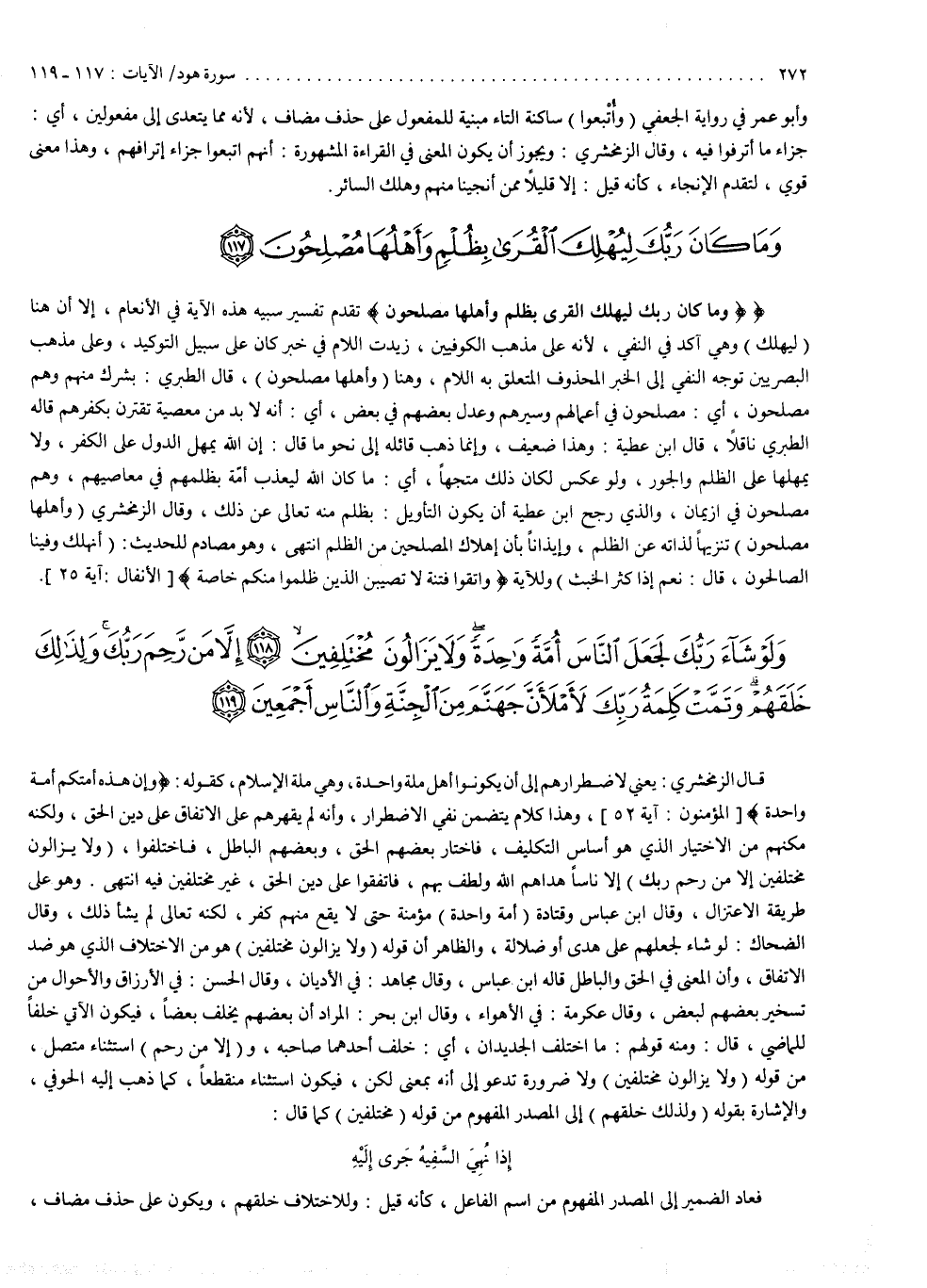 2 ( ) وَمَا كَانَ رَبُّكَ لِيُهْلِكَ الْقُرَى بِظُلْمٍ وَأَهْلُهَا مُصْلِحُونَ وَلَوْ شَآءَ رَبُّكَ لَجَعَلَ النَّاسَ أُمَّةً وَاحِدَةً وَلاَ يَزَالُونَ مُخْتَلِفِينَ إِلاَّ مَن رَّحِمَ رَبُّكَ وَلِذالِكَ خَلَقَهُمْ وَتَمَّتْ كَلِمَةُ رَبِّكَ لاّمْلاّنَّ جَهَنَّمَ مِنَ الْجِنَّةِ وَالنَّاسِ أَجْمَعِينَ وَكُلاًّ نَّقُصُّ عَلَيْكَ مِنْ أَنْبَاءِ الرُّسُلِ مَا نُثَبِّتُ بِهِ فُؤَادَكَ وَجَآءَكَ فِى هَاذِهِ الْحَقُّ وَمَوْعِظَةٌ وَذِكْرَى لِلْمُؤْمِنِينَ وَقُل لِّلَّذِينَ لاَ يُؤْمِنُونَ اعْمَلُواْ عَلَى مَكَانَتِكُمْ إِنَّا عَامِلُونَ وَانْتَظِرُواْ إِنَّا مُنتَظِرُونَ وَللَّهِ غَيْبُ السَّمَاوَاتِ وَالاٌّ رْضِ وَإِلَيْهِ يُرْجَعُ الاٌّ مْرُ كُلُّهُ فَاعْبُدْهُ وَتَوَكَّلْ عَلَيْهِ وَمَا رَبُّكَ بِغَافِلٍ عَمَّا تَعْمَلُونَ ( ) ) 2