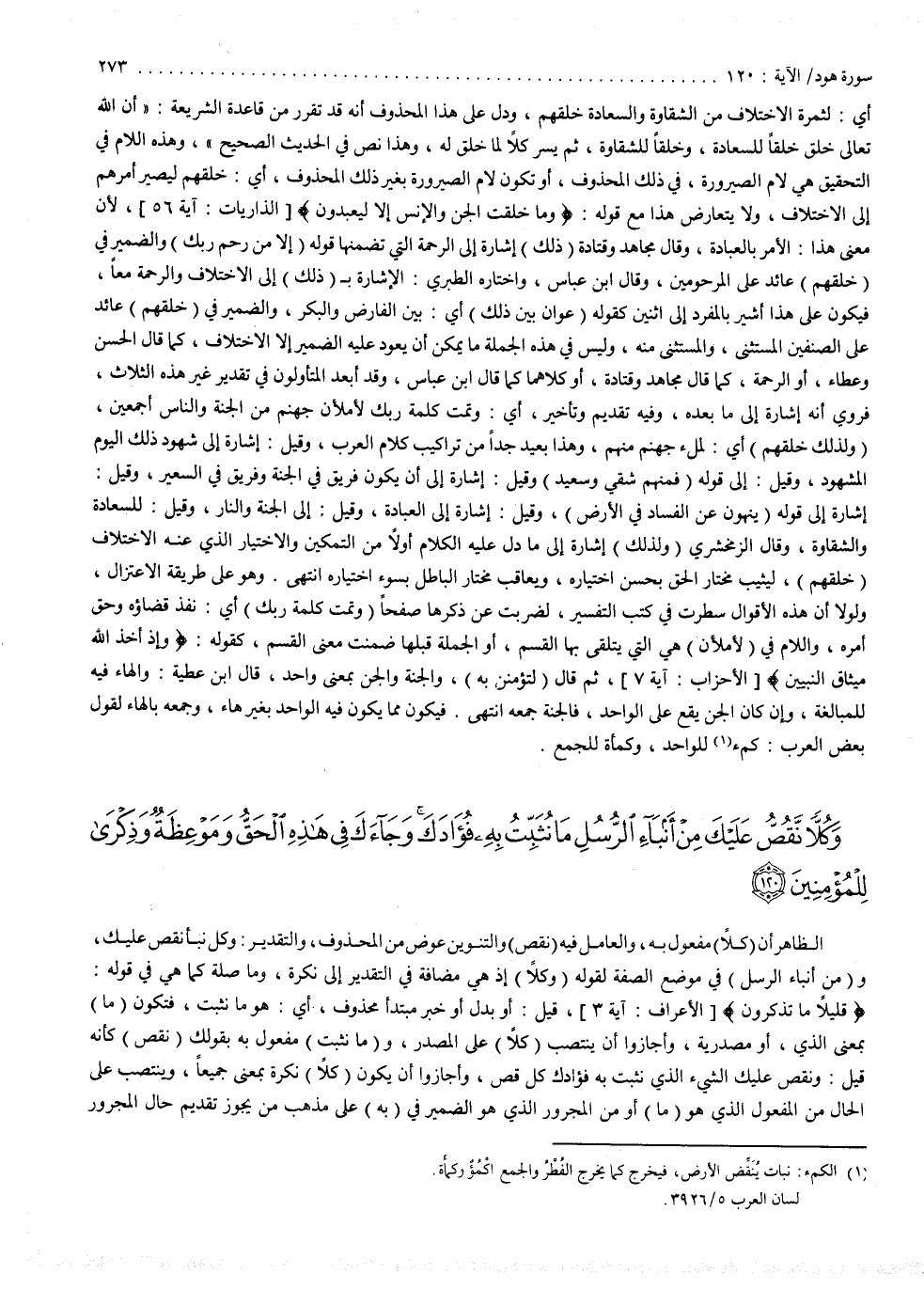 ( وَكُلاًّ نَّقُصُّ عَلَيْكَ مِنْ أَنْبَاء الرُّسُلِ مَا نُثَبّتُ بِهِ فُؤَادَكَ وَجَاءكَ فِى هَاذِهِ الْحَقُّ وَمَوْعِظَةٌ وَذِكْرَى لِلْمُؤْمِنِينَ ( : الظهر أن كلاً مفعول به ، والعامل فيه نقص ، والتنوين عوض من المحذوف ، والتقدير : وكل نبأ نقص عليك . ومن أنباء الرسل في موضع الصفة لقوله : وكلاً إذ هي مضافة في التقدير إلى نكرة ، وما صلة كما هي في قوله : ) قَلِيلاً مَّا تَذَكَّرُونَ ( قيل : أو بدل ، أو خبر مبتدأ محذوف أي : هو ما نثبت ، فتكون ما بمعنى الذي ، أو مصدرية . وأجازوا أن ينتصب كلاً على المصدر ، وما نثبت مفعول به بقولك نقص ، كأنه قيل : ونقص علك الشيء الذي نثبت به فؤادك كل قص . وأجازوا أن يكون كلاً نكرة بمعنى جميعاً ، وينتصب على الحال من المفعول الذي هو ما ، أو من المجرور الذي هو الضمير في به على مذهب من يجوز تقديم حال المجرور