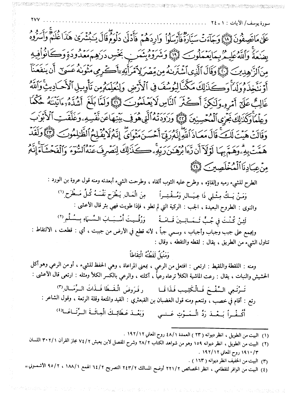 تَصِفُونَ وَجَاءَتْ سَيَّارَةٌ فَأَرْسَلُواْ وَارِدَهُمْ فَأَدْلَى دَلْوَهُ قَالَ يابُشْرَى هَاذَا غُلاَمٌ وَأَسَرُّوهُ بِضَاعَةً وَاللَّهُ عَلِيمٌ بِمَا يَعْمَلُونَ وَشَرَوْهُ بِثَمَنٍ بَخْسٍ دَرَاهِمَ مَعْدُودَةٍ وَكَانُواْ فِيهِ مِنَ الزَاهِدِينَ وَقَالَ الَّذِى اشْتَرَاهُ مِن مِّصْرَ لاِمْرَأَتِهِ أَكْرِمِى مَثْوَاهُ عَسَى أَن يَنفَعَنَآ أَوْ نَتَّخِذَهُ وَلَدًا وَكَذالِكَ مَكَّنَّا لِيُوسُفَ فِى الاٌّ رْضِ وَلِنُعَلِّمَهُ مِن تَأْوِيلِ الاٌّ حَادِيثِ وَاللَّهُ غَالِبٌ عَلَى أَمْرِهِ وَلَاكِنَّ أَكْثَرَ النَّاسِ لاَ يَعْلَمُونَ وَلَمَّا بَلَغَ أَشُدَّهُ آتَيْنَاهُ حُكْمًا وَعِلْمًا وَكَذالِكَ نَجْزِى الْمُحْسِنِينَ وَرَاوَدَتْهُ الَّتِى هُوَ فِى بَيْتِهَا عَن نَّفْسِهِ وَغَلَّقَتِ الاٌّ بْوَابَ وَقَالَتْ هَيْتَ لَكَ قَالَ مَعَاذَ اللَّهِ إِنَّهُ رَبِّىأَحْسَنَ مَثْوَاىَّ إِنَّهُ لاَ يُفْلِحُ الظَّالِمُونَ وَلَقَدْ هَمَّتْ بِهِ وَهَمَّ بِهَا لَوْلاأَن رَّأَى بُرْهَانَ رَبِّهِ كَذَالِكَ لِنَصْرِفَ عَنْهُ السُّوءَ وَالْفَحْشَآءَ إِنَّهُ مِنْ عِبَادِنَا الْمُخْلَصِينَ وَاسُتَبَقَا الْبَابَ وَقَدَّتْ قَمِيصَهُ مِن دُبُرٍ وَأَلْفَيَا سَيِّدَهَا لَدَى الْبَابِ قَالَتْ مَا جَزَآءُ مَنْ أَرَادَ بِأَهْلِكَ سُوءًا إِلاَ أَن يُسْجَنَ أَوْ عَذَابٌ أَلِيمٌ قَالَ هِىَ رَاوَدَتْنِى عَن نَّفْسِى وَشَهِدَ شَاهِدٌ مِّنْ أَهْلِهَآ إِن كَانَ قَمِيصُهُ قُدَّ مِن قُبُلٍ فَصَدَقَتْ وَهُوَ مِنَ الكَاذِبِينَ وَإِنْ كَانَ قَمِيصُهُ قُدَّ مِن دُبُرٍ فَكَذَبَتْ وَهُوَ مِن الصَّادِقِينَ فَلَمَّا رَأَى قَمِيصَهُ قُدَّ مِن دُبُرٍ قَالَ إِنَّهُ مِن كَيْدِكُنَّ إِنَّ كَيْدَكُنَّ عَظِيمٌ يُوسُفُ أَعْرِضْ عَنْ هَاذَا وَاسْتَغْفِرِى لِذَنبِكِ إِنَّكِ كُنتِ مِنَ الْخَاطِئِينَ } )