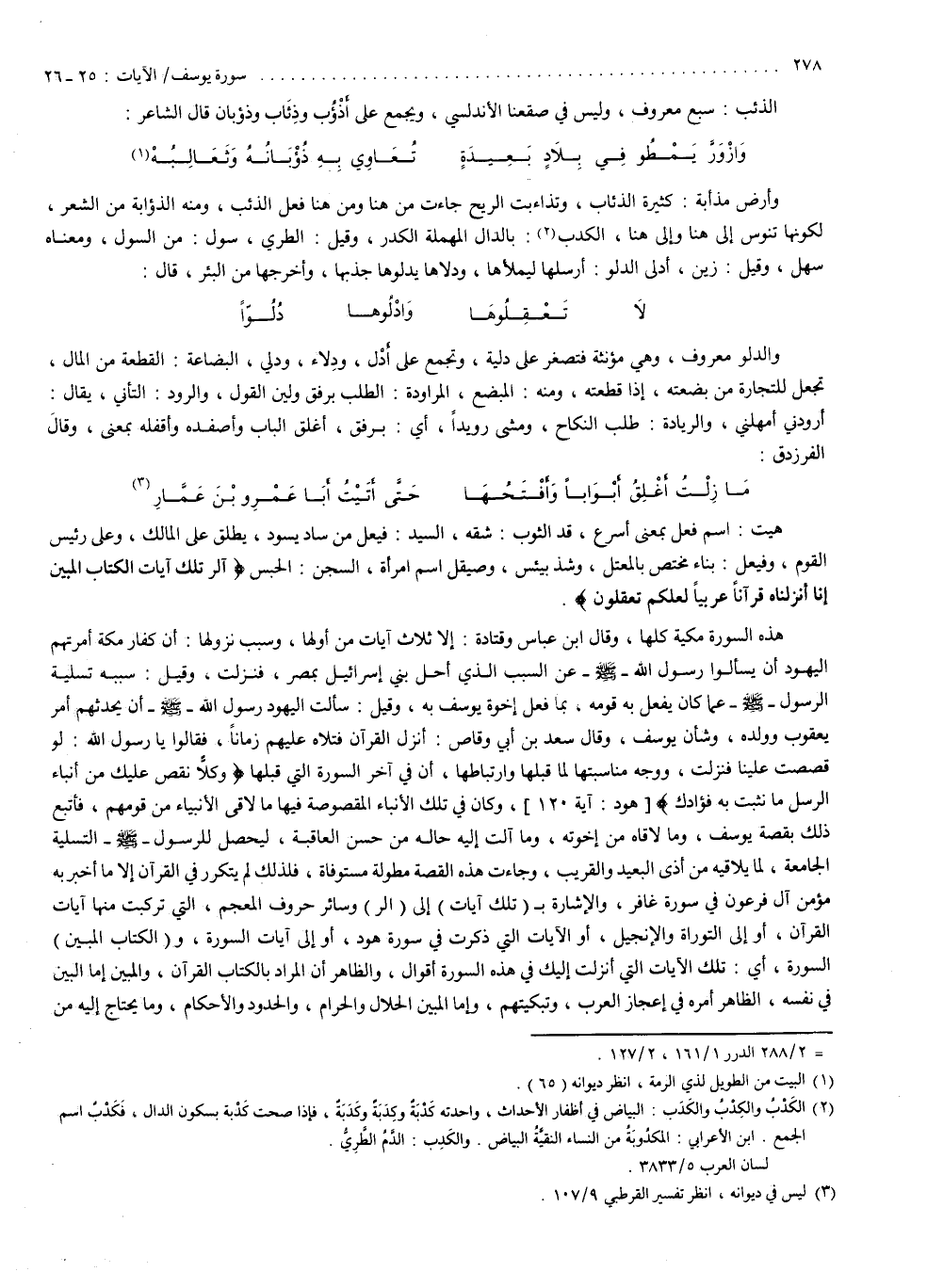 وأرض مذأبة كثيرة الذئاب ، وتذاءبت الريح جاءت من هنا ومن هنا ، فعل الذئب ومنه الذؤابة من الشعر لكونها تنوس إلى هنا وإلى هنا . الكدب بالدال المهملة الكدر ، وقيل : الطري . سول من السول ، ومعناه سهل ، وقيل : زين . أدلى الدلو أرسلها ليملأها ، ولادها يدلوها جذبها وأخرجها من البئر . قال : لا تعقلواها وادلواها دلواً . والدهر معروف ، وهي مؤنثة فتصغر على دليته ، وتجمع على أدل ودلاء ودلى . البضاعة : القطعة من المال تجعل للتجارة ، من بضعته إذا قطعته ، ومنه المبضع . المراودة الطلب برفق ولين القول ، والرود التأني يقال : أرودني أمهلني ، والريادة طلب النكاح . ومشى رويداً أي برفق أغلق الباب وأصفده وأقفله بمعنى . وقال الفرزدق : ما زالت أغلق أبواباً وأفتحها