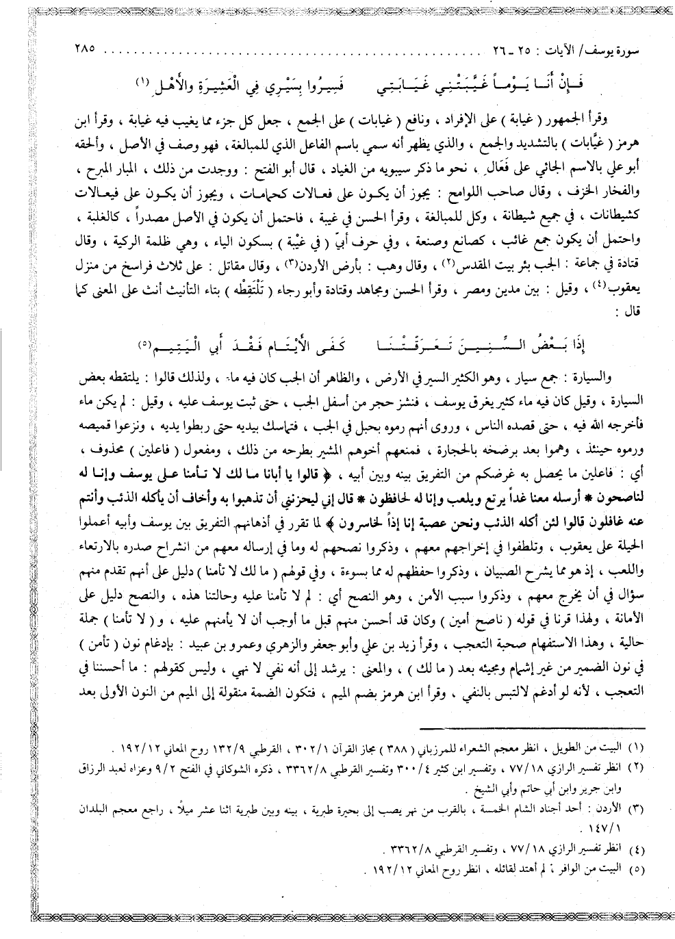 . وقرأ الجمهور : غيابة على الإفراد ، ونافع : غيابات على الجمع ، جعل كل جزء مما يغيب فيه غيابة . وقرأ ابن هرمز : غيابات بالتشديد والجمع ، والذي يظهر أنه سمى باسم الفاعل الذي للمبالغة ، فهو وصف في الأصل ، وألحقه أبو علي بالاسم الجائي على فعال نحو ما ذكر سيبويه من الغياد . قال أبو الفتح : ووجدت من ذلك المبار المبرح والفخار الخزف . وقال صاحب اللوامح : يجوز أن يكون على فعالات كحمامات ، ويجوز أن يكون على فيعالات كشيطانات في جمع شيطانة ، وكل للمبالغة . وقرأ الحسن : في غيبة ، فاحتمل أن يكون في الأصل مصدراً كالغلبة ، واحتمل أن يكون جمع غائب كصانع وصنعة . وفي حرف أبي في غيبة بسكون الياء ، وهي ظلمة الركية . وقال قتادة في جماعة : الجب بئر بيت المقدس ، وقال وهب : بأرض الأردن ، وقال مقاتل : على ثلاث فراسخ من منزل يعقوب ، وقيل : بين مدين ومصر . وقرأ الحسن ، ومجاهد ، وقتادة ، وأبو رجاء : تلتقطه بتاء التأنيث ، أنث على المعنى كما قال : إذا بعض السنين تعرفتنا