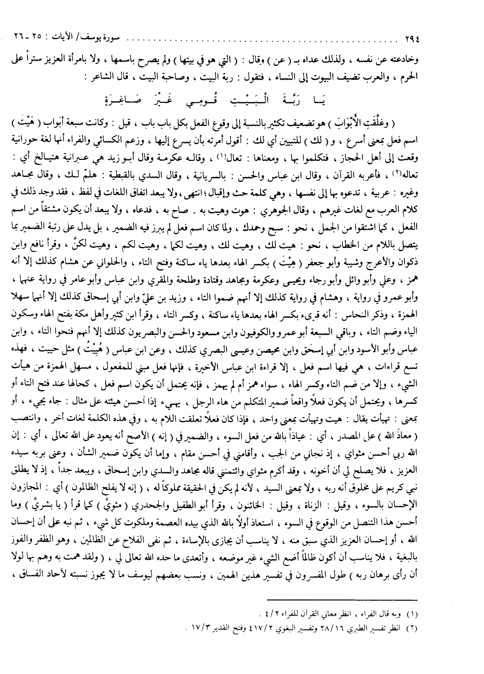 وغلقت الأبواب هو تضعيف تكثير بالنسبة إلى وقوع الفعل بكل باب باب . قيل : وكانت سبعة أبواب هيت اسم فعل بمعنى أسرع . ولك للتبيين أي : لك أقول ، أمرته بأن يسرع إليها . وزعم الكسائي والفراء أنها لغة حورانية وقعت إلى أهل الحجاز فتكلموا بها ومعناها : تعال ، وقاله عكرمة . وقال أبو زيد : هي عبرانية . هيتلخ أي تعاله فأعربه القرآن ، وقال ابن عباس والحسن : بالسريانية ، وقال السدي : بالقبطية هلمّ لك ، وقال مجاهد وغيره : عربية تدعوه بها إلى نفسها ، وهي كلمة حث وإقبال انتهى . ولا يبعد اتفاق اللغات في لفظ ، فقد وجد ذلك في كلام العرب مع لغات غيرهم . وقال الجوهري : هوت وهيت به صاح به فدعاه ، ولا يبعد أن يكون مشتقاً من اسم الفعل ، كما اشتقوا من الجمل نحو سبح وحمدك . ولما كان اسم فعل لم يبرز فيه الضمير ، بل يدل على رتبة الضمير بما يتصل باللام من الخطاب نحو : هيت لك ، وهيت لك ، وهيت لكما ، وهيت لكم ، وهيت لكن . وقرأ نافع ، وابن ذكوان ، والأعرج ، وشيبة ، وأبو جعفر : هيت بكسر الهاء بعدها ياء ساكنة وفتح التاء ، والحلواني عن هشام كذلك إلا أنه همز وعلى ، وأبو وائل ، وأبو رجاء ، ويحيى ، وعكرمة ، ومجاهد ، وقتادة ، وطلحة ، والمقري ، وابن عباس ، وأبو عامر في رواية عنهما ، وأبو عمرو في رواية وهشام في رواية كذلك ، إلا أنهم ضموا التاء . وزيد بن عليّ وابن أبي إسحاق كذلك ، إلا أنهما سهلا الهمزة . وذكر النحاس : أنه قرىء بكسر الهاء بعدها ياء ساكنة ، وكسر التاء . وقرأ ابن كثير وأهل مكة : بفتح الهاء وسكون الياء وضم التاء ، وباقي السبعة أبو عمرو ، والكوفيون ، وابن مسعود ، والحسن ، والبصريون ، كذلك ، إلا أنهم فتحوا التاء . وابن عباس وأبو الأسود ، وابن أبي إسحاق ، وابن محيصن ، وعيسى البصرة كذلك . وعن ابن عباس : هييت مثل حييت ، فهذه تسع قراءات هي فيها اسم فعل ، إلا قراءة ابن عباس الأخيرة فإنها فعل مبني للمفعول مسهل الهمزة من هيأت الشيء ، وإلا من ضم التاء وكسر الهاء سواء همز أم لم يهمز ، فإنه يحتمل أن يكون اسم فعل كحالها عند فتح التاء أو كسرها ، ويحتمل أن يكون فعلاً واقعاً ضمير المتكلم من هاء الرجل يهيىء إذا أحسن هيئته على مثال : جاء يجيء ، أو بمعنى تهيأت . يقال : هيت وتهيأت بمعنى واحد . فإذا كان فعلاً تعلقت اللام به ، وفي هذه الكلمة لغات أخر . وانتصب معاد الله على المصدر أي : عياذاً بالله من فعل السوء ، والضمير في أنه الأصح أنه يعود على الله تعالى أي : إن الله ربي أحسن مثواي إذ نجاني من الجب ، وأقامني في أحسن مقام . وإما أن يكون ضمير الشأن وغني بربه سيده العزيز فلا يصلح لي أن أخونه ، وقد أكرم مثواي وائتمني قاله : مجاهد ، والسدي ، وابن إسحاق . ويبعد جداً ، إذ لا يطلق نبي كريم على مخلوق أنه ربه ، ولا بمعنى السيد ، لأنه لم يكن في الحقيقة مملوكاً له . إنه لا يفلح الظالمون أي المجازون الإحسان بالسوء . وقيل : الزناة ، وقيل : الخائنون . وقرأ أبو الطفيل والجحدري مثويّ ، كما قرأ يا بشرى ، وما أحسن هذا التنصل من الوقوع في السوء . استعاذ أولاً بالله الذي بيده العصمة وملكوت كل شيء ، ثم نبه على أنّ إحسان الله أو إحسان العزيز الذي سبق منه لا يناسب أن يجازى بالإساءة ، ثم نفى الفلاح عن الظالمين وهو الظفر والفوز بالبغية فلا يناسب أن أكون ظالماً أضع الشيء غير موضعه ، وأتعدى ما حده الله تعالى لي .