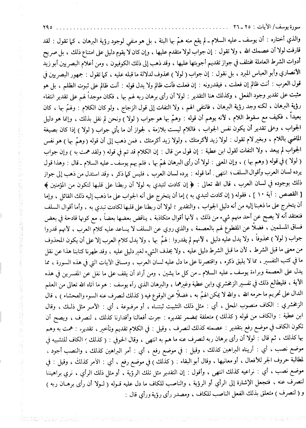 والذي أختاره أن يوسف عليه السلام لم يقع منه همّ بها البتة ، بل هو منفي لوجود رؤية البرهان كما تقول : لقد قارفت لولا أن عصمك الله ، ولا تقول : إنّ جواب لولا متقدم عليها وإنْ كان لا يقوم دليل على امتناع ذلك ، بل صريح أدوات الشرط العاملة مختلف في جواز تقديم أجوبتها عليها ، وقد ذهب إلى ذلك الكوفيون ، ومن أعلام البصريين أبو زيد الأنصاري ، وأبو العباس المبرد . بل نقول : إن جواب لولا محذوف لدلالة ما قبله عليه ، كما تقول جمهور البصريين في قول العرب : أنت ظالم إن فعلت ، فيقدرونه إن فعلت فأنت ظالم ، ولا يدل قوله : أنت ظالم على ثبوت الظلم ، بل هو مثبت على تقدير وجود الفعل . وكذلك هنا التقدير لولا أن رأى برهان ربه لهم بها ، فكان موجداً لهم على تقدير انتفاء رؤية البرهان ، لكنه وجد رؤية البرهان فانتفي الهم . ولا التفات إلى قول الزجاج . ولو كان الكلام ولهم بها كان بعيداً فكيف مع سقوط اللام ؟ لأنه يوهم أن قوله : وهمّ بها هو جواب لولا ، ونحن لم نقل بذلك ، وإنما هو دليل الجواب . وعلى تقدير أن يكون نفس الجواب فاللام ليست بلازمة لجواز أن ما يأتي جواب لولا إذا كان بصيغة الماضي باللام ، وبغير لام تقول : لولا زيد لأكرمتك ، ولولا زيد أكرمتك . فمن ذهب إلى أن قوله : وهم بها هو نفس الجواب لم يبعد ، ولا التفات لقول ابن عطية إنّ قول من قال : إن الكلام قد تم في قوله : ولقد همت به ، وإن جواب لولا في قوله وهم بها ، وإن المعنى لولا أن رأى البرهان لهمّ بها فلم يهم يوسف عليه السلام قال ، وهذا قول يرده لسان العرب وأقوال السلف انتهى . أما قوله : يرده لسان العرب فليس كما ذكر ، وقد استدل من ذهب إلى جواز ذلك بوجوده في لسان العرب قال الله تعالى : ) إِن كَادَتْ لَتُبْدِى بِهِ لَوْلا أَن رَّبَطْنَا عَلَى قَلْبِهَا لِتَكُونَ مِنَ الْمُؤْمِنِينَ ( فقوله : إنْ كادت لتبدي به ، إما أن يتخرج على أنه الجواب على ما ذهب إليه ذلك القائل ، وإما أن يتخرج على ما ذهبنا إليه من أنه دليل الجواب ، والتقدير : لولا أن ربطنا على قلبها لكادت تبدى به . وأما أقوال السلف فنعتقد أنه لا يصح عن أحد منهم شيء من ذلك ، لأنها أقوال متكاذبة يناقض بعضها بعضاً ، مع كونها قادحة في بعض فساق المسلمين ، فضلاً عن المقطوع لهم بالعصمة . والذي روي عن السلف لا يساعد عليه كلام العرب ، لأنهم قدروا جواب لولا محذوفاً ، ولا يدل عليه دليل ، لأنهم لم يقدروا لهم بها . ولا يدل كلام العرب إلا على أن يكون المحذوف من معنى ما قبل الشرط ، لأنّ ما قبل الشرط دليل عليه ، ولا يحذف الشيء لغير دليل عليه . وقد طهرنا كتابنا هذا عن نقل ما في كتب التفسير مما لا يليق ذكره ، واقتصرنا على ما دل عليه لسان العرب ، ومساق الآيات التي في هذه السورة مما يدل على العصمة ، وبراءة يوسف عليه السلام من كل ما يشين . ومن أراد أن يقف على ما نقل عن المفسرين في هذه الآية فليطالع ذلك في تفسير الزمخشري ، وابن عطية ، وغيرهما .