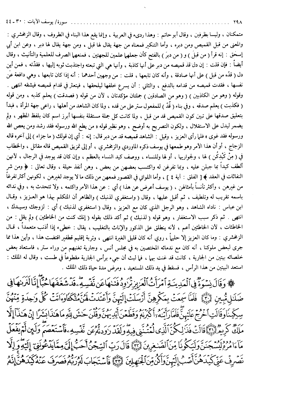2 ( ) وَقَالَ نِسْوَةٌ فِى الْمَدِينَةِ امْرَأَتُ الْعَزِيزِ تُرَاوِدُ فَتَاهَا عَن نَّفْسِهِ قَدْ شَغَفَهَا حُبًّا إِنَّا لَنَرَاهَا فِى ضَلَالٍ مُّبِينٍ فَلَمَّا سَمِعَتْ بِمَكْرِهِنَّ أَرْسَلَتْ إِلَيْهِنَّ وَأَعْتَدَتْ لَهُنَّ مُتَّكَئًا وَءَاتَتْ كُلَّ وَاحِدَةٍ مَّنْهُنَّ سِكِّينًا وَقَالَتِ اخْرُجْ عَلَيْهِنَّ فَلَمَّا رَأَيْنَهُ أَكْبَرْنَهُ وَقَطَّعْنَ أَيْدِيَهُنَّ وَقُلْنَ حَاشَ للَّهِ مَا هَاذَا بَشَرًا إِنْ هَاذَآ إِلاَّ مَلَكٌ كَرِيمٌ قَالَتْ فَذالِكُنَّ الَّذِى لُمْتُنَّنِى فِيهِ وَلَقَدْ رَاوَدتُّهُ عَن نَّفْسِهِ فَاسَتَعْصَمَ وَلَئِن لَّمْ يَفْعَلْ مَآ ءَامُرُهُ لَيُسْجَنَنَّ وَلَيَكُونًا مِّن الصَّاغِرِينَ قَالَ رَبِّ السِّجْنُ أَحَبُّ إِلَىَّ مِمَّا يَدْعُونَنِىإِلَيْهِ وَإِلاَّ تَصْرِفْ عَنِّى كَيْدَهُنَّ أَصْبُ إِلَيْهِنَّ وَأَكُن منَ الْجَاهِلِينَ فَاسْتَجَابَ لَهُ رَبُّهُ فَصَرَفَ عَنْهُ كَيْدَهُنَّ إِنَّه
