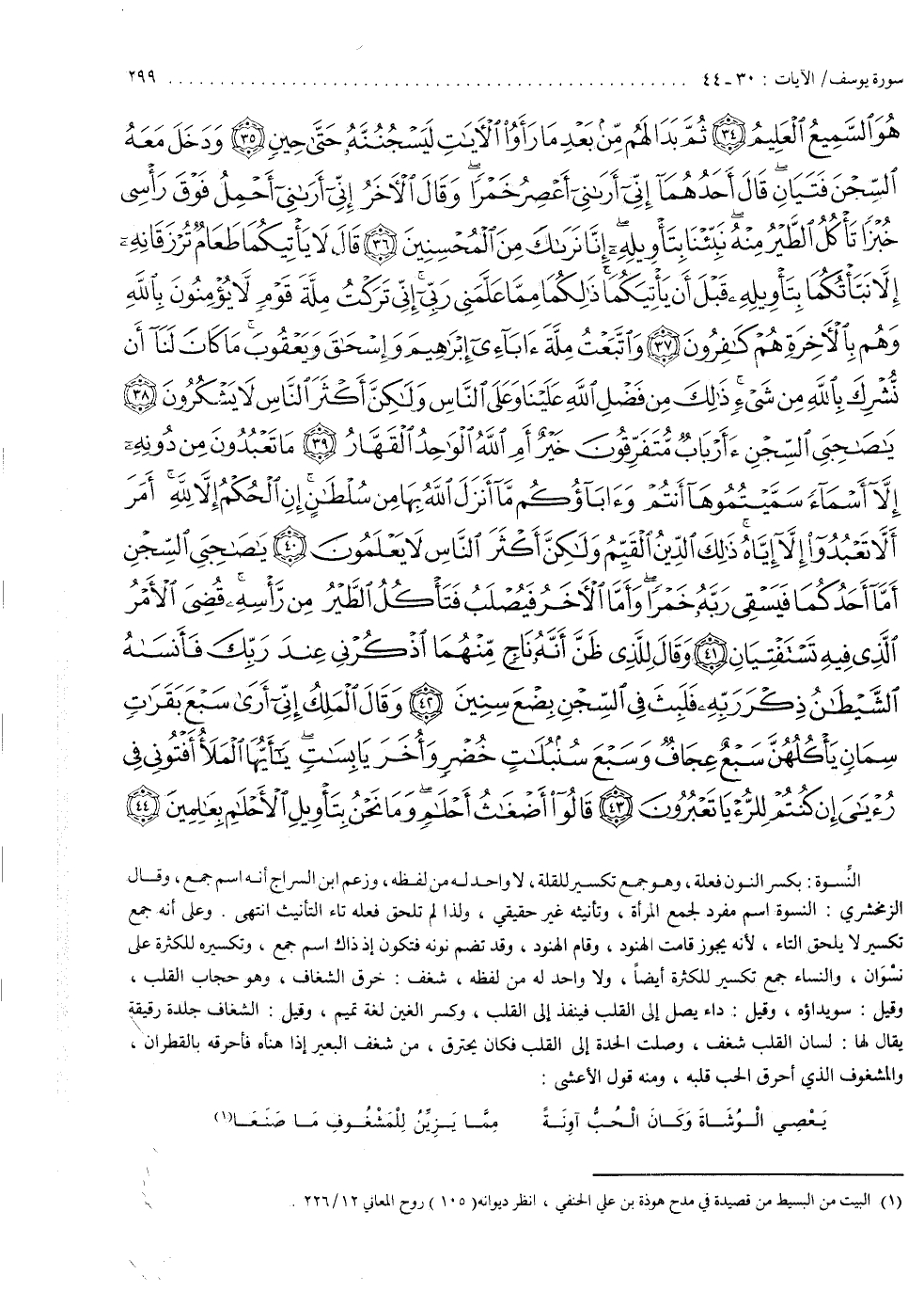 هُوَ السَّمِيعُ الْعَلِيمُ ثُمَّ بَدَا لَهُمْ مِّن بَعْدِ مَا رَأَوُاْ الآيَاتِ لَيَسْجُنُنَّهُ حَتَّى حِينٍ وَدَخَلَ مَعَهُ السِّجْنَ فَتَيَانَ قَالَ أَحَدُهُمَآ إِنِّىأَرَانِىأَعْصِرُ خَمْرًا وَقَالَ الآخَرُ إِنِّىأَرَانِىأَحْمِلُ فَوْقَ رَأْسِى خُبْزًا تَأْكُلُ الطَّيْرُ مِنْهُ نَبِّئْنَا بِتَأْوِيلِهِ إِنَّا نَرَاكَ مِنَ الْمُحْسِنِينَ قَالَ لاَ يَأْتِيكُمَا طَعَامٌ تُرْزَقَانِهِ إِلاَّ نَبَّأْتُكُمَا بِتَأْوِيلِهِ قَبْلَ أَن يَأْتِيَكُمَا ذالِكُمَا مِمَّا عَلَّمَنِى رَبِّىإِنِّى تَرَكْتُ مِلَّةَ قَوْمٍ لاَّ يُؤْمِنُونَ بِاللَّهِ وَهُمْ بِالاٌّ خِرَةِ هُمْ كَافِرُونَ وَاتَّبَعْتُ مِلَّةَ ءَابَآءِيإِبْرَاهِيمَ وَإِسْحَاقَ وَيَعْقُوبَ مَا كَانَ لَنَآ أَن نُّشْرِكَ بِاللَّهِ مِن شَىْءٍ ذالِكَ مِن فَضْلِ اللَّهِ عَلَيْنَا وَعَلَى النَّاسِ وَلَاكِنَّ أَكْثَرَ النَّاسِ لاَ يَشْكُرُونَ ياصَاحِبَىِ السِّجْنِ ءَأَرْبَابٌ مُّتَّفَرِّقُونَ خَيْرٌ أَمِ اللَّهُ الْوَاحِدُ الْقَهَّارُ مَا تَعْبُدُونَ مِن دُونِهِ إِلاَّ أَسْمَآءً سَمَّيْتُمُوهَآ أَنتُمْ وَءَابَآؤُكُمْ مَّآ أَنزَلَ اللَّهُ بِهَا مِن سُلْطَانٍ إِنِ الْحُكْمُ إِلاَّ للَّهِ أَمَرَ أَلاَّ تَعْبُدُواْ إِلاَّ إِيَّاهُ ذالِكَ الدِّينُ الْقَيِّمُ وَلَاكِنَّ أَكْثَرَ النَّاسِ لاَ يَعْلَمُونَ ياصَاحِبَىِ السِّجْنِ أَمَّآ أَحَدُكُمَا فَيَسْقِى رَبَّهُ خَمْرًا وَأَمَّا الاٌّ خَرُ فَيُصْلَبُ فَتَأْكُلُ الطَّيْرُ مِن رَّأْسِهِ قُضِىَ الاٌّ مْرُ الَّذِى فِيهِ تَسْتَفْتِيَانِ وَقَالَ لِلَّذِى ظَنَّ أَنَّهُ نَاجٍ مِّنْهُمَا اذْكُرْنِى عِندَ رَبِّكَ فَأَنْسَاهُ الشَّيْطَانُ ذِكْرَ رَبِّهِ فَلَبِثَ فِى السِّجْنِ بِضْعَ سِنِينَ وَقَالَ الْمَلِكُ إِنِّىأَرَى سَبْعَ بَقَرَاتٍ سِمَانٍ يَأْكُلُهُنَّ سَبْعٌ عِجَافٌ وَسَبْعَ سُنْبُلَاتٍ خُضْرٍ وَأُخَرَ يَابِسَاتٍ ياأَيُّهَا الْمَلأُ أَفْتُونِى فِى رُؤْيَاىَ إِن كُنتُمْ لِلرُّؤْيَا تَعْبُرُونَ قَالُواْ أَضْغَاثُ أَحْلَامٍ وَمَا نَحْنُ بِتَأْوِيلِ الاٌّ حْلَامِ بِعَالِمِينَ } )