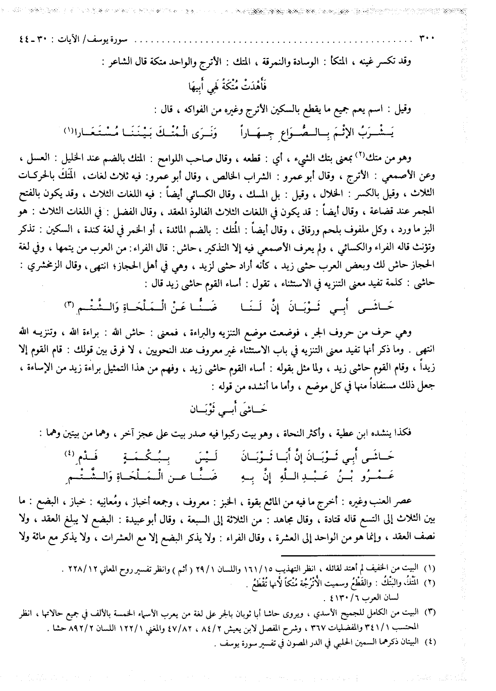 وهو من متك بمعنى بتك الشيء أي قطعه . وقال صاحب اللوامح : المتك بالضم عند الخليل ، العسل ، وعند الأصمعي الأترج . وقال أبو عمر : والشراب الخالص . وقال أبو عمر : وفيه ثلاث لغات ، المتك بالحركات الثلاث ، وقيل : بالكسر الخلال ، وقيل : بل المسك . وقال الكسائي أيضاً : فيه اللغات الثلاث ، وقد يكون بالفتح المجمر عند قضاعة . وقال أيضاً : قد يكون في اللغات الثلاث الفالوذ المعقد . وقال الفضل : في اللغات الثلاث هو المبزماورد ، وكل ملفوف بلحم ورقاق . وقال أيضاً : المتك بالضم المائدة ، أو الخمر في لغة كندة . السكين : تذكر وتؤنث ، قاله الفراء والكسائي . ولم يعرف الأصمعي فيه إلا التذكير . حاش : قال الفراء من السرب من يتمها ، وفي لغة الحجاز : حاش لك ، وبعض العرب : حشى زيد كأنه أراد حشى لزيد ، وهي في أهل الحجاز انتهى . وقال الزمخشري : حاشى كلمة تفيد معنى التنزيه في الاستثناء ، تقول : أساء القوم حاشى زيد . قال : حاشى أبي ثوبان أن لنا