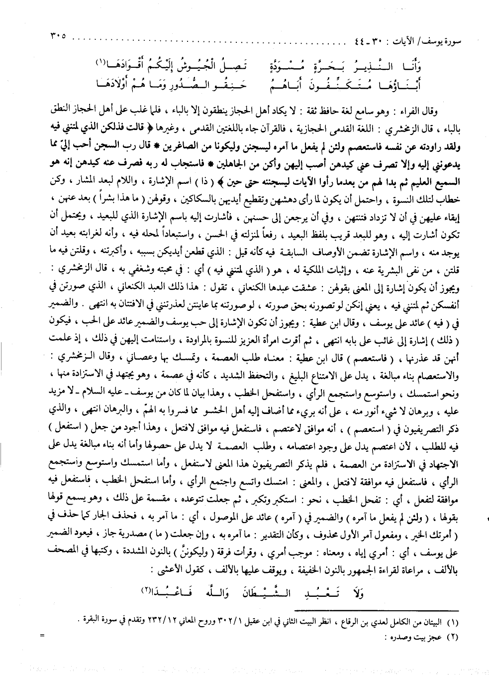 ( قَالَتْ فَذالِكُنَّ الَّذِى لُمْتُنَّنِى فِيهِ وَلَقَدْ رَاوَدتُّهُ عَن نَّفْسِهِ فَاسَتَعْصَمَ وَلَئِن لَّمْ يَفْعَلْ مَا ءامُرُهُ لَيُسْجَنَنَّ وَلَيَكُونًا مّن الصَّاغِرِينَ ( : ذا اسم الإشارة ، واللام لبعد المشار ، وكن خطاب لتلك النسوة . واحتمل أن يكون لما رأى دهشهن وتقطيع أيديهن بالسكاكين وقولهن : ما هذا بشراً ، بعد عنهن إبقاء عليهن في أنْ لا تزداد فتنتهن ، وفي أنْ يرجعن إلى حسنهن ، فأشارت إليه باسم الإشارة الذي للبعيد ، ويحتمل أن تكون أشارت إليه وهو للبعد قريب بلفظ البعيد رفعاً لمنزلته في الحسن ، واستبعاد المحله فيه ، وأنه لغرابته بعيد أن يوجد منه . واسم الإشارة تضمن الأوصاف السابقة فيه كأنه قيل : الذي قطعتن أيديكن بسببه وأكبرتنه وقلتن فيه ما قلتن من نفي البشرية عنه وإثبات الملكية له ، هو الذي لمتنني فيه أي : في محبته وشغفي به ، قال الزمخشري : ويجوز أن يكون إشارة إلى المعنى بقولهن : عشقت عبدها الكنعاني تقول : هذا ذلك العبد الكنعاني الذي صورتن في أنفسكن ثم لمتنني فيه ، يعني : إنكن لو تصورنه بحق صورته ، ولو صورتنه بما عاينتن لعذرتنني في الافتننان به انتهى . والضمير في فيه عائد على يوسف . وقال ابن عطية : ويجوز أن تكون الإشارة إلى حب يوسف ، والضمير عائد على الحب ، فيكون ذلك إشارة إلى غائب على بابه انتهى . ثم أقرت امرأة العزيز للنسوة بالمراودة ، واستنامت إليهن في ذلك ، إذ علمت أنهن قد عذرنها .