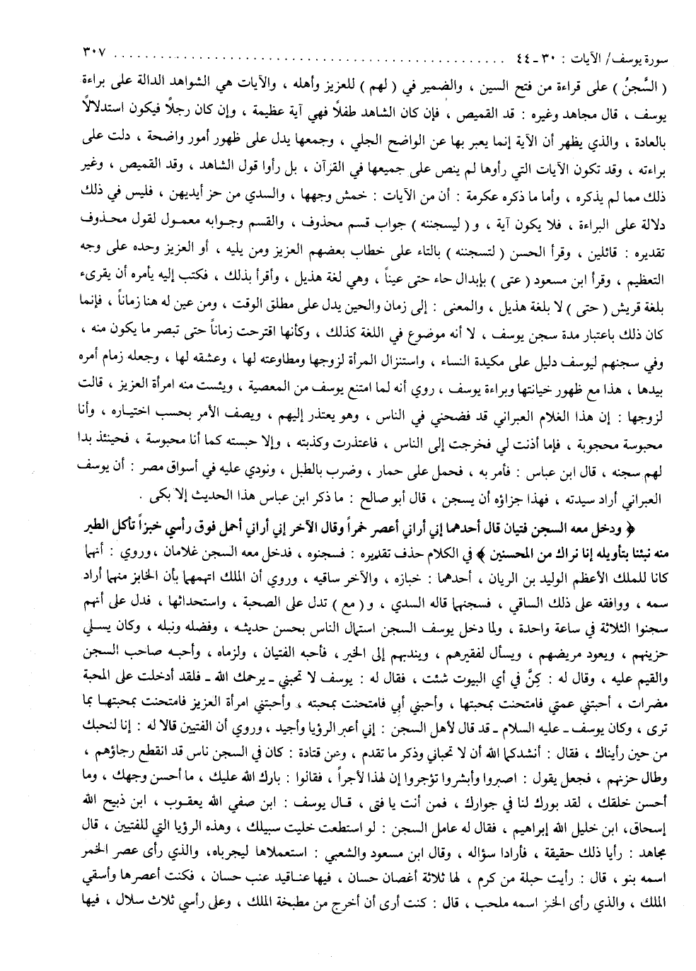 على السجن على قراءة من فتح السين . والضمير في لهم للعزيز وأهله ، والآيات هي : الشواهد الدالة على براءة يوسف . قال مجاهد وغيره : قد القميص ، فإن كان الشاهد طفلاً فهي آية عظيمة ، وإن كان رجلاً فيكون استدلالاً بالعادة . والذي يظهر أنّ الآية إنما يعبر بها عن الواضح الجلي ، وجمعها يدل على ظهور أمور واضحة دلت على براءته ، وقد تكون الآيات التي رأوها لم ينص على جميعها في القرآن ، بل رأوا قول الشاهد . وقد القميص وغير ذلك مما لم يذكره . وأما ما ذكره عكرمة أن من الآيات خمش وجهها ، والسدي من حز أيديهن ، فليس في ذلك دلالة على البراءة فلا يكون آية وليسجننه جواب قسم محذوف والقسم وجوابه معمول لقول محذوف تقديره قائلين . وقرأ الحسن : لتسجننه بالتاء على خطاب بعضهم العزيز ومن يليه ، أو العزيز وحده على وجه التعظيم . وقرأ ابن مسعود : عتى بإبدال حاء حتى عيتا ، وهي لغة هذيل . وأقرأ بذلك فكتب إليه يأمره أن يقرىء بلغة قريش حتى لا بلغة هذيل ، والمعنى : إلى زمان . والحبن يدل على مطلق الوقت ، ومن عين له هنا زماناً فإنما كان ذلك باعتبار مدة سجن يوسف ، لا أنه موضوع في اللغة كذلك ، وكأنها اقترحت زماناً حتى تبصر ما يكون منه . وفي سجنهم ليوسف دليل على مكيدة النساء ، واستنزال المرأة لزوجها ومطاوعته لها ، وعشقه لها ، وجعله زمام أمره بيدها ، هذا مع ظهور خيانتها وبراءة يوسف . روي أنه لما امتنع يوسف من المعصية ، ويئست منه امرأة العزيز قالت لزوجها : إن هذا الغلام العبراني قد فضحني في الناس ، وهو يعتذر إليهم ويصف الأمر بحسب اختياره ، وأنا محبوسة محجوبة ، فأما أذنت لي فخرجت إلى الناس فاعتذرت وكذبته ، وإلا حبسته كما أنا محبوسة ، فحينئذ بدا لهم سجنه ، قال ابن عباس : فأمر به فحمل على حمار ، وضرب بالطبل ، ونودي عليه في أسواق مصر أنّ يوسف العبراني أراد سيدته ، فهذا جزاؤه أن يسجن . قال أبو صالح : ما ذكر ابن عباس هذا الحديث إلا بكي .