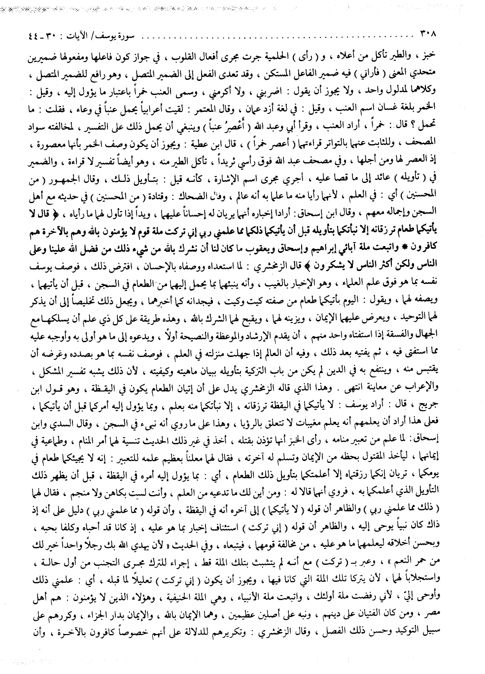 خبز ، والطير تأكل من أعلاه ، ورأى الحلمية جرت مجرى أفعال القلوب في جواز كون فاعلها ومفعولها ضميرين متحدي المعنى ، فأراني فيه ضمير الفاعل المستكن ، وقد تعدى الفعل إلى الضمير المتصل وهو رافع للضمير المتصل ، وكلاهما لمدلول واحد . ولا يجوز أن يقول : اضربني ولا أكرمني . وسمى العنب خمراً باعتبار ما يؤول إليه . وقيل : الخمر بلغة غسان اسم العنب . وقيل : في لغة ازدعمان . وقال المعتمر : لقيت أعرابياً يحمل عنباً في وعاء فقلت : ما تحمل ؟ قال : خمراً ، أراد العنب . وقرأ أبي وعبد الله : أعصر عنباً ، وينبغي أن يحمل ذلك على التفسير لمخالفته سواد المصحف ، وللثابت عنهما بالتواتر قراءتهما أعصر خمراً . قال ابن عطية : ويجوز أن يكون وصف الخمر بأنها معصورة ، إذ العصر لها ومن أجلها . وفي مصحف عبد الله : فوق رأسي ثريداً تأكل الطير منه ، وهو أيضاً تفسير لا قراءة . والضمير في تأويله عائداً إلى ما قصا عليه ، أجرى مجرى اسم الإشارة كأنه قيل : بتأويل ذلك . وقال الجمهور : من المحسنين أي في العلم ، لأنهما رأيا سنة ما علما به أنه عالم . وقال الضحاك وقتادة : من المحسنين في حديثه مع أهل السجن وإجماله معهم . وقال ابن إسحاق : أرادا إخباره أنهما يريان له إحساناً عليهما ويداً ، إذا تأول لهما ما رأياه .