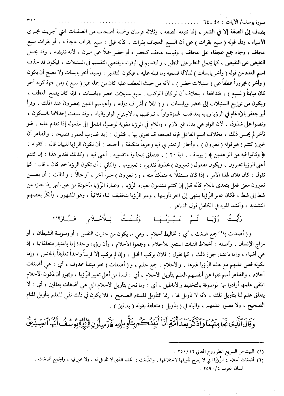 يضاف إلى الصفة إلا في الشعر ، إنما تتبعه الصفة . وثلاثة فرسان ، وخمسة أصحاب من الصفات التي أجريت مجرى الأسماء . ودل قوله : سبع بقرات على أن السبع العجاف بقرات ، كأنه قيل : سبع بقرات عجاف ، أو بقرات سبع عجاف . وجاء جمع عجفاء على عجاف ، وقياسه عجف كخضراء أو خضر ، حملاً على سمان لأنه نقيضه . وقد يحمل النقيض على النقيض ، كما يحمل النظر على النظير . والتقسيم في البقرات يقتضي التقسيم في السنبلات ، فيكون قد حذف اسم العدد من قوله : وأخر يابسات ، لدلالة قسمية وما قبله عليه ، فيكون التقدير : وسبعاً أخر يابسات . ولا يصح أن يكون وأخر مجروراً عطفاً على سنبلات خضر ، لأنه من حيث العطف عليه كان من جملة مميز سبع ، ومن جهة كونه أخر كان مبايناً لسبع ، فتدافعا بخلاف أن لو كان التركيب سبع سنبلات خضر ويابسات ، فإنه كان يصح العطف ، ويكون من توزيع السنبلات إلى خضر ويابسات . والملأ : أشراف دولته وأعيانهم الذين يحضرون عند الملك . وقرأ أبو جعفر : بالإدغام في الرؤيا ، وبابه بعد قلب الهمزة واواً ، ثم قلبها ياء ، لاجتماع الواو والياء ، وقد سبقت إحداهما بالسكون . ونصوا على شذوذه ، لأن الواو هي بدل غير لازم ، واللام في الرؤيا مقوية لوصول الفعل إلى مفعوله إذا تقدم عليه ، فلو تأخر لم يحسن ذلك بخلاف اسم الفاعل فإنه لضعفه قد تقوى بها فتقول : زيد ضارب لعمر وفصيحاً . والظاهر أن خبر كنتم هو قوله : تعبرون . وأجاز الزمخشري فيه وجوهاً متكلفة أحدها : أن تكون الرؤيا للبيان قال : كقوله : وكانوا فيه من الزاهدين ، فتتعلق بمحذوف تقديره أعني فيه ، وكذلك تقدير هذا إن كنتم أعني الرؤيا تعبرون ، ويكون مفعول تعبرون محذوفاً تقديره تعبرونها . والثاني : أن تكون الرؤيا خبر كان قال : كما تقول : كان فلان لهذا الأمر إذا كان مستقلاً به متمكناً منه ، وتعبرون خبراً آخر أو حالاً . والثالث : أن يضمن تعبرون معنى فعل يتعدى باللام ، كأنه قيل : إن كنتم تنتدبون لعبارة الرّؤيا ، وعبارة الرّؤيا مأخوذة من عبر النهر إذا جازه من شط إلى شط ، فكان عابر الرّؤيا ينتهي إلى آخر تأويلها . وعبر الرّؤيا بتخفيف الباء ثلاثياً وهو المشهور ، وأنكر بعضهم التشديد ، وأنشد المبرد في الكامل قول الشاعر : رأيت رؤياً ثم عبرتها