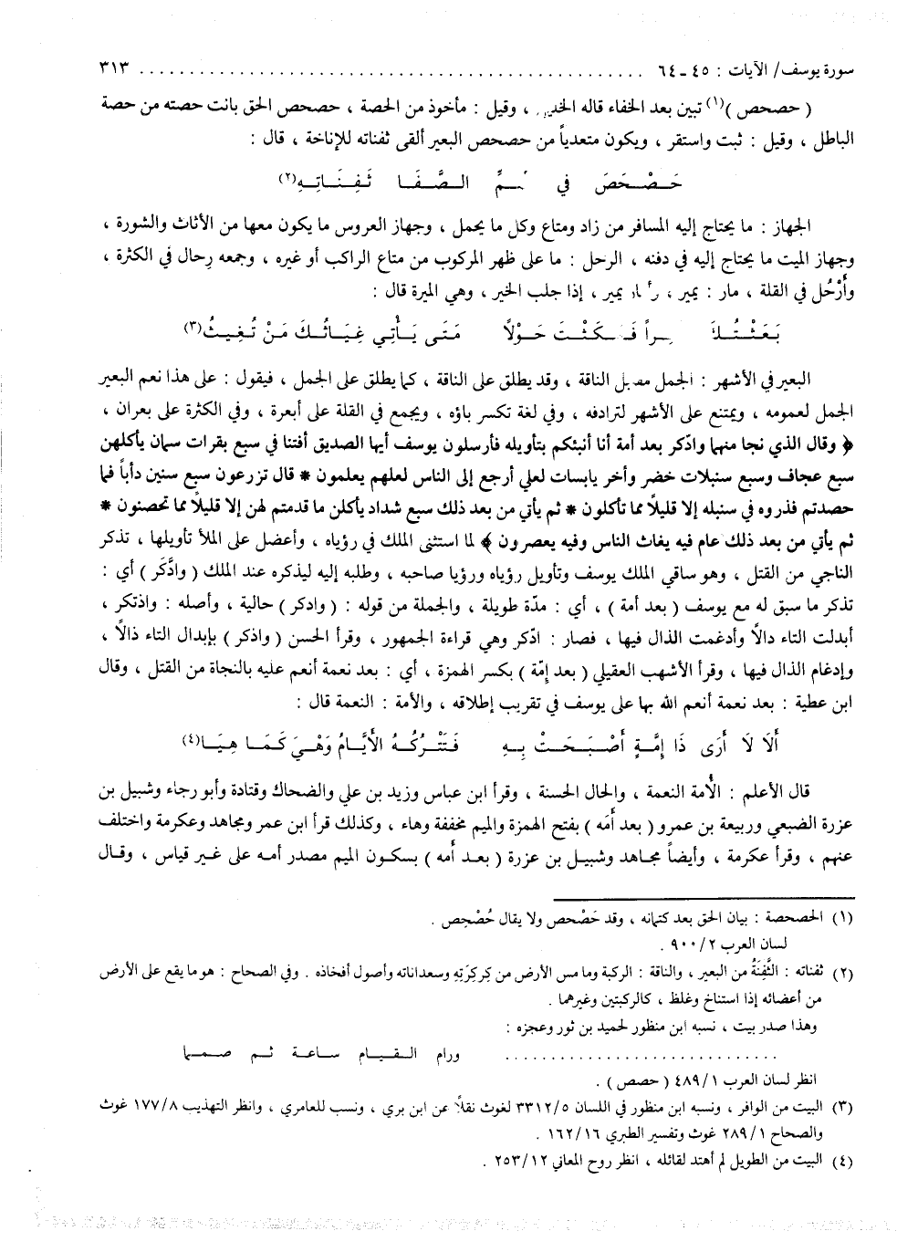 حصحص تبين بعد الخفاء ، قاله الخليل . وقيل : مأخود من الحصة حصحص الحق بانت حصته من حصة الباطل . وقيل : ثبت واستقر ، ويكون متعدياً من حصحص البعير ألقى ثفناته للإناخة قال : حصحص في صم الصفا ثفناته . الجهاز : ما يحتاج إليه المسافر من زاد ومتاع ، وكل ما يحمل ، وجهاز العروس ما يكون معها من الأثاث والشورة ، وجهاز الميت ما يحتاج إليه في دفنه . الرحل : ما على ظهر المركوب من متاع الراكب أو غيره ، وجمعه رحال في الكثرة ، وأرحل في القلة . مار يمير ، وأمار يمير ، إذا جلب الخير وهي الميرة قال : بعثتك مائراً فمكثت حولا