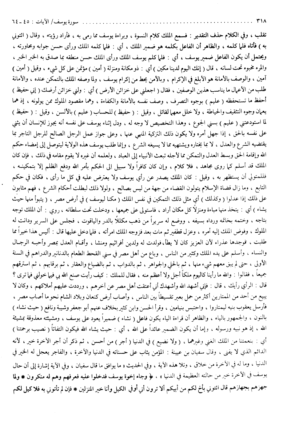 تقلب . وفي الكلام حذف التقدير : فسمع الملك كلام النسوة وبراءة يوسف مما رمى به ، فأراد رؤيته وقال : ائتنوني به ، فلما كلمه . والظاهر أن الفاعل بكلمه هو ضمير الملك أي : فلما كلمه الملك ورأى حسن جوابه ومحاورته . ويحتمل أن يكون الفاعل ضمير يوسف أي : فلما كلم يوسف الملك ، ورأى الملك حسن منطقه بما صدق به الخبر الخبر ، والمرء مخبوء تحت لسانه ، قال : إنك اليوم لدينا مكين أي : ذو مكانة ومنزلة ، أمين مؤتمن على كل شيء . وقيل : أمين آمين ، والوصف بالأمانة هو الأبلغ في الإكرام ، وبالأمن يحط من إكرام يوسف . ولما وصفه الملك بالتمكن عنده ، والأمانة ، طلب من الأعمال ما يناسب هذين الوصفين فقال : اجعلني على خزائن الأرض أي : ولني خزائن أرضك إني حفيظ أحفظ ما تستحفظه ، عليم بوجوه التصرف . وصف نفسه بالأمانة والكفاءة وهما مقصود الملوك ممن يولونه ، إذ هما يعمان وجوه التثقيف والحياطة ، ولا خلل معهما لقائل . وقيل : حفيظ للحساب ، عليم بالألسن . وقيل : حفيظ لما استودعتني ، عليم بسني الجوع . وهذا التخصيص لا وجه له ، ودلّ إثناء يوسف على نفسه أنه يجوز للإنسان أن يثني على نفسه بالحق إذا جهل أمره ، ولا يكون ذلك التزكية المنهي عنها . وعلى جواز عمل الرجل الصالح للرجل التاجر بما يقتضيه الشرع والعدل ، لا بما يختاره ويشتهيه مما لا يسيغه الشرع ، وإنما طلب يوسف هذه الولاية ليتوصل إلى إمضاء حكم الله ، وإقامة الحق ، وبسط العدل ، والتمكن مما لأجله تبعث الأنبياء إلى العباد ، ولعلمه أن غيره لا يقوم مقامه في ذلك . فإنْ كان الملك قد أسلم كما روى مجاهد فلا كلام ، وإن كان كافراً ولا سبيل إلى الحكم بأمر الله ودفع الظلم إلا بتمكينه ، فللمتولي أن يستظهر به . وقيل : كان الملك يصدر عن رأي يوسف ولا يعترض عليه في كل ما رأى ، فكان في حكم التابع . وما زال قضاة الإسلام يتولون القضاء من جهة من ليس بصالح ، ولولا ذلك لبطلت أحكام الشرع ، فهم مثابون على ذلك إذا عدلوا . وكذلك أي : مثل ذلك التمكين في نفس الملك مكناً ليوسف في أرض مصر ، يتبوأ منها حيث يشاء أي : يتخذ منها مباءة ومنزلاً كل مكان أراد ، فاستولى على جميعها ، ودخلت تحت سلطانه . روي أن الملك توجه بتاجه ، وختمه بخاتمه ، ورداه بسيفه ، ووضع له سريراً من ذهب مكللاً بالدر والياقوت ، فجلس على السرير ، ودانت له الملوك ، وفوض الملك إليه أمره وعزل قطفير ، ثم مات بعد ، فزوجه الملك امرأته ، فلما دخل عليها قال : أليس هذا خيراً مما طلبت ؟ فوجدها عذراء ، لأنّ العزيز كان لا يطأ ، فولدت له ولدين : افراثيم ، ومنشا . وأقام العدل بمصر ، وأحبه الرجال والنساء ، وأسلم على يده الملك وكثير من الناس ، وباع من أهل مصر في سني القحط الطعام بالدنانير والدراهم في السنة الأولى حتى لم يبق معهم شيء منها ، ثم بالحلي والجواهر ، ثم بالدواب ، ثم بالضياع والعقار ، ثم برقابهم ، ثم استرقهم جميعاً فقالوا : والله ما رأينا كاليوم ملكاً أجل ولا أعظم منه فقال للملك : كيف رأيت صنع الله بي فيما خولني ، فما ترى ؟ قال : الرأي رأيك قال : فإني أشهد الله وأشهدك أني أعتقت أهل مصر عن آخرهم ، ورددت عليهم أملاكهم . وكان لا يبيع من أحد من الممتارين أكثر من حمل بعير تقسيطاً بين الناس ، وأصاب أرض كنعان وبلاد الشام نحو ما أصاب مصر ، فأرسل يعقوب بنيه ليمتاروا ، واحتبس بنيامين . وقرأ الحسن وابن كثير : بخلاف عنهم أبو جعفر وشيبه ونافع : حيث نشاء بالنون ، والجمهور بالياء . والظاهر أنّ قراءة الياء يكون فاعل نشاء ضميراً يعود على يوسف ، ومشيئته معذوقة بمشيئة الله ، إذ هو نبيه ورسوله . وإما أن يكون الضمير عائداً على الله أي : حيث يشاء الله ، فيكون التفاتاً . نصيب برحمتنا أي : بنعمتنا من الملك والغني وغيرهما ، ولا نضيع في الدنيا أجر من أسن . ثم ذكر أن أجر الآخرة خير ، لأنه الدائم الذي لا يفنى . وقال سفيان بن عيينة : المؤمن يثاب على حسناته في الدنيا والآخرة ، والفاجر يعجل له الخير في الدنيا ، وما له في الآخرة من خلاق ، وتلا هذه الآية . وفي الحديث ما يوافق ما قال سفيان ، وفي الآية إشارة إلى أن حال يوس
