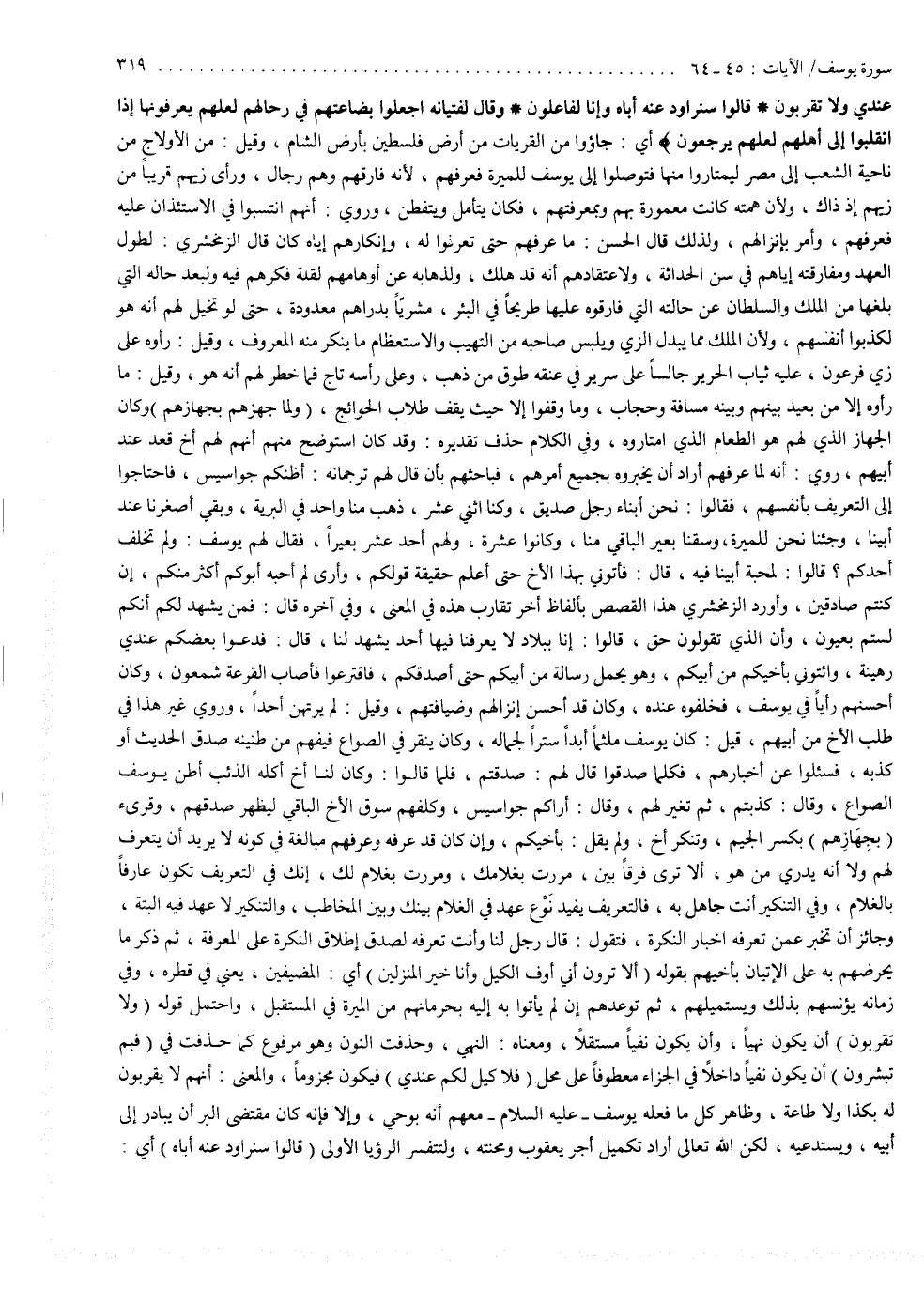 ْ عِندِى وَلاَ تَقْرَبُونِ قَالُواْ سَنُراوِدُ عَنْهُ أَبَاهُ وَإِنَّا لَفَاعِلُونَ وَقَالَ لِفِتْيَانِهِ اجْعَلُواْ بِضَاعَتَهُمْ فِى رِحَالِهِمْ لَعَلَّهُمْ يَعْرِفُونَهُمْ إِذَا انْقَلَبُواْ إِلَى أَهْلِهِمْ لَعَلَّهُمْ يَرْجِعُونَ } : أي جاؤوا من القريات من أرض فلسطين بأرش الشام . وقيل : من الأولاج من ناحية الشعب إلى مصر ليمتاروا منها ، فتوصلوا إلى يوسف للميرة ، فعرفهم لأنه فارقهم وهم رجال ، ورأى زيهم قريباً من زيهم إذ ذاك ، ولأنّ همته كانت معمورة بهم وبمعرفتهم ، فكان يتأمل ويتفطن . وروي أنهم انتسبوا في الاستئذان عليه فعرفهم ، وأمر بإنزالهم . ولذلك قال الحسن : ما عرفهم حتى تعرفوا له ، وإنكارهم إياه كان . قال الزمخشري : لطول العهد ومفارقته إياهم في سن الحداثة ، ولاعتقادهم أنه قد هلك ، ولذهابه عن أوهامهم لقلة فكرهم فيه ، ولبعد حاله التي بلغها من الملك والسلطان عن حالته التي فارقوه عليها طريحاً في البئر مشريّاً بدراهم معدودة ، حتى لو تخيل لهم أنه هو لكذبوا أنفسهم . ولأن الملك مما يبدل الزي ويلبس صاحبه من التهيب والاستعظام ما ينكر منه المعروف . وقيل : رأوه على زي فرعون عليه ثياب الحرير جالساً على سرير في عنقه طوق من ذهب ، وعلى رأسه تاج ، فما خطر لهم أنه هو . وقيل : ما رأوه إلا من بعيد بينهم وبينه مسافة وحجاب ، وما وقفوا إلا حيث يقف طلاب الحوائج .
