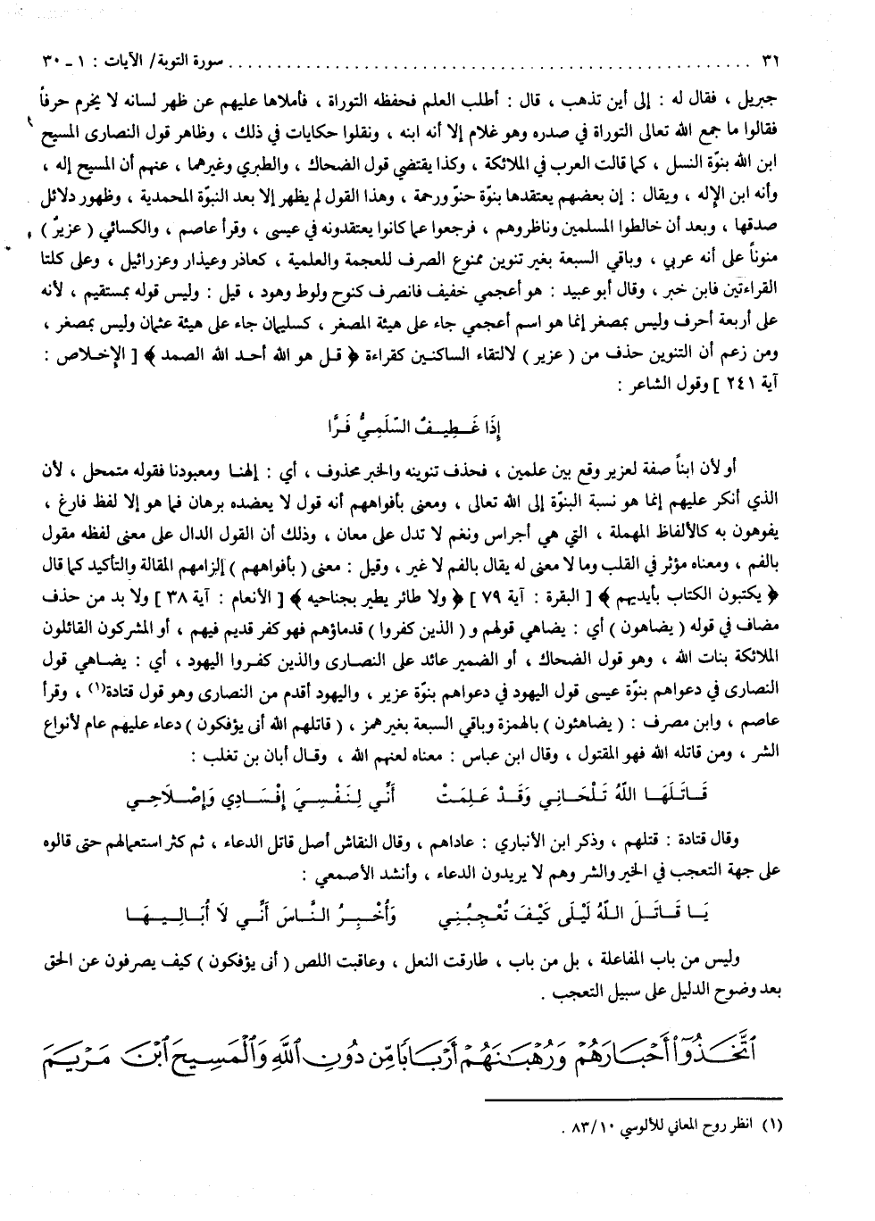 2 ( ) اتَّخَذُواْ أَحْبَارَهُمْ وَرُهْبَانَهُمْ أَرْبَاباً مِّن دُونِ اللَّهِ وَالْمَسِيحَ ابْنَ مَرْيَمَ وَمَآ أُمِرُواْ إِلاَّ لِيَعْبُدُواْ إِلَاهاً وَاحِداً لاَّ إِلَاهَ إِلاَّ هُوَ سُبْحَانَهُ عَمَّا يُشْرِكُونَ يُرِيدُونَ أَن يُطْفِئُواْ نُورَ اللَّهِ بِأَفْوَاهِهِمْ وَيَأْبَى اللَّهُ إِلاَّ أَن يُتِمَّ نُورَهُ وَلَوْ كَرِهَ الْكَافِرُونَ هُوَ الَّذِيأَرْسَلَ رَسُولَهُ بِالْهُدَى وَدِينِ الْحَقِّ لِيُظْهِرَهُ عَلَى الدِّينِ كُلِّهِ وَلَوْ كَرِهَ الْمُشْرِكُونَ ( ) ) 2