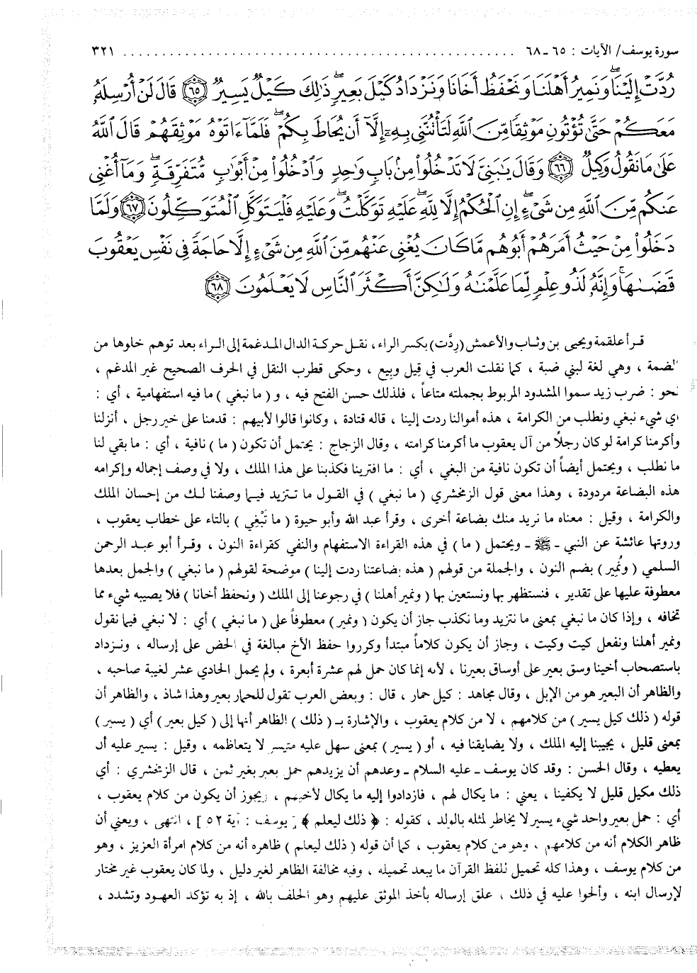 رُدَّتْ إِلَيْنَا وَنَمِيرُ أَهْلَنَا وَنَحْفَظُ أَخَانَا وَنَزْدَادُ كَيْلَ بَعِيرٍ ذالِكَ كَيْلٌ يَسِيرٌ قَالَ لَنْ أُرْسِلَهُ مَعَكُمْ حَتَّى تُؤْتُونِ مَوْثِقًا مِّنَ اللَّهِ لَتَأْتُنَّنِى بِهِ إِلاَّ أَن يُحَاطَ بِكُمْ فَلَمَّآ ءَاتَوْهُ مَوْثِقَهُمْ قَالَ اللَّهُ عَلَى مَا نَقُولُ وَكِيلٌ وَقَالَ يابَنِىَّ لاَ تَدْخُلُواْ مِن بَابٍ وَاحِدٍ وَادْخُلُواْ مِنْ أَبْوَابٍ مُّتَفَرِّقَةٍ وَمَآ أُغْنِى عَنكُمْ مِّنَ اللَّهِ مِن شَىْءٍ إِنِ الْحُكْمُ إِلاَّ للَّهِ عَلَيْهِ تَوَكَّلْتُ وَعَلَيْهِ فَلْيَتَوَكَّلِ الْمُتَوَكِّلُونَ وَلَمَّا دَخَلُواْ مِنْ حَيْثُ أَمَرَهُمْ أَبُوهُم مَّا كَانَ يُغْنِى عَنْهُمْ مِّنَ اللَّهِ مِن شَىْءٍ إِلاَّ حَاجَةً فِى نَفْسِ يَعْقُوبَ قَضَاهَا وَإِنَّهُ لَذُو عِلْمٍ لِّمَا عَلَّمْنَاهُ وَلَاكِنَّ أَكْثَرَ النَّاسِ لاَ يَعْلَمُونَ ( )