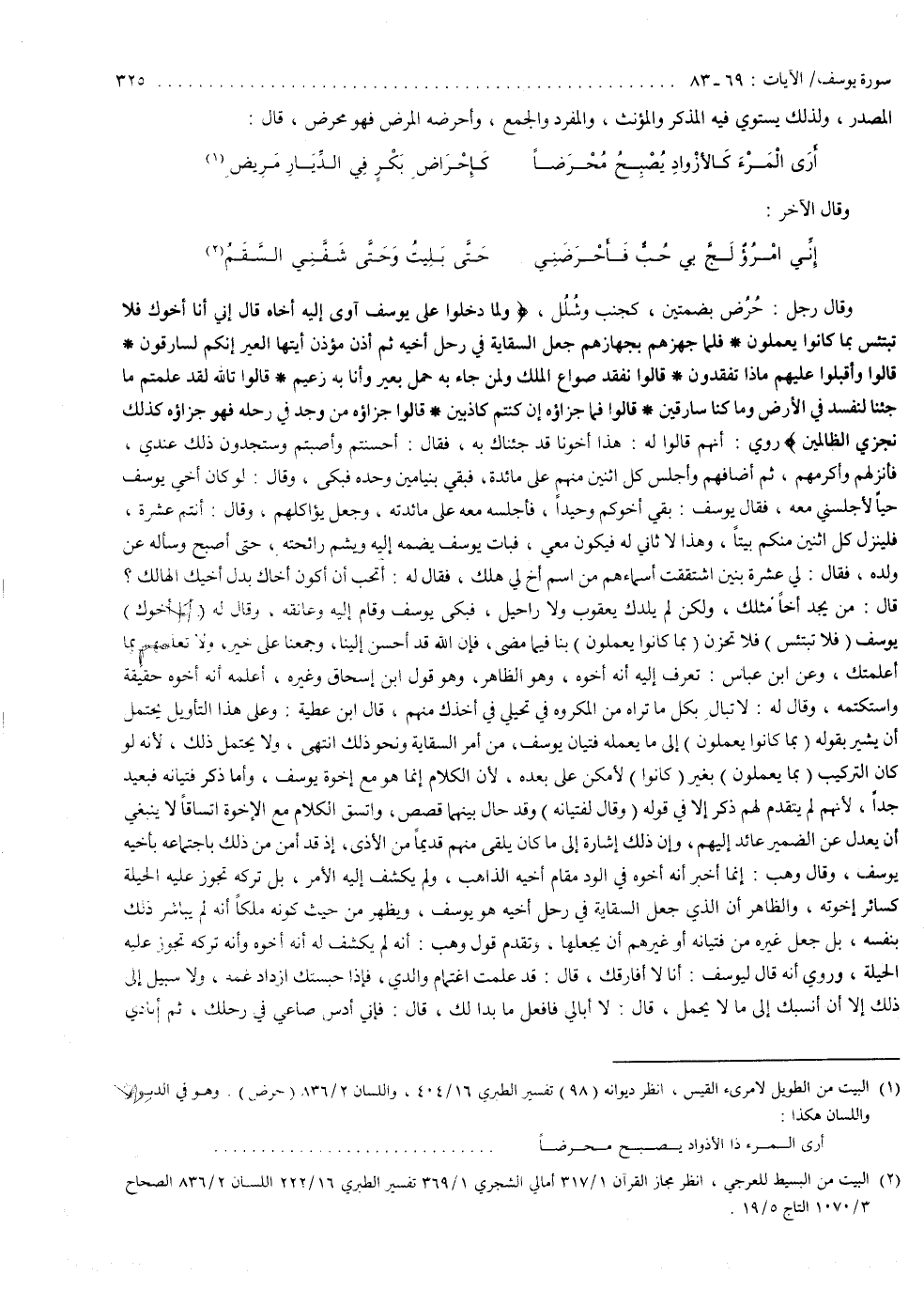 ( وَلَمَّا دَخَلُواْ عَلَى يُوسُفَ اوَى إِلَيْهِ أَخَاهُ قَالَ إِنّى أَنَاْ أَخُوكَ فَلاَ تَبْتَئِسْ بِمَا كَانُواْ يَعْمَلُونَ فَلَمَّا جَهَّزَهُمْ بِجَهَازِهِمْ جَعَلَ السّقَايَةَ فِى رَحْلِ أَخِيهِ ثُمَّ أَذَّنَ مُؤَذّنٌ أَيَّتُهَا الْعِيرُ إِنَّكُمْ لَسَارِقُونَ قَالُواْ وَأَقْبَلُواْ عَلَيْهِمْ مَّاذَا تَفْقِدُونَ قَالُواْ نَفْقِدُ صُوَاعَ الْمَلِكِ وَلِمَن جَاء بِهِ حِمْلُ بَعِيرٍ وَأَنَاْ بِهِ زَعِيمٌ قَالُواْ تَاللَّهِ لَقَدْ عَلِمْتُمْ مَّا جِئْنَا لِنُفْسِدَ فِى الاْرْضِ وَمَا كُنَّا سَارِقِينَ قَالُواْ فَمَا جَزَاؤُهُ إِن كُنتُمْ كَاذِبِينَ قَالُواْ جَزؤُهُ مَن وُجِدَ فِى رَحْلِهِ فَهُوَ جَزَاؤُهُ كَذالِكَ نَجْزِى الظَّالِمِينَ ( : روى أنهم قالوا له : هذا أخونا قد جئناك به ، فقال : أحسنتم وأصبتم ، وستجدون ذلك عندي ، فأنزلهم وأكرمهم ، ثم أضافهم ، وأجلس كل اثنين منهم على مائدة ، فبقي بنيامين وحده فبكى وقال : لو كان أخي يوسف حياً لأجلسني معه . فقال يوسف : بقي أخوكم وحيداً ، فأجلسه معه على مائدته ، وجعل يؤاكلهم وقال : أنتم عشرة ، فلينزل كل اثنين منكم بيتاً ، وهذا لا ثاني له فيكون معي ، فبات يوسف يضمه إليه ويشم رائحته حتى أصبح ، وسأله عن ولده فقال : لي عشرة بنين اشتققت أسماءهم من اسم أخ لي هلك ، فقال له : أتحب أنْ أكون أخاك بدل أخيك الهالك ؟ قال : من يجد أخا مثلك ، ولكن لم يلدك يعقوب ولا راحيل ، فبكى يوسف وقام إليه وعانقه وقال له : أنا أخوك يوسف فلا تبتئس ، فلا تحزن بما كانوا يعملون بنا فيما مضى ، فإن الله قد أحسن إلينا وجمعنا على خير ، ولا تعلمهم بما أعلمتك . وعن ابن عباس : تعرف إليه أنه أخوه ، وهو الظاهر . وهو قول ابن إسحاق وغيره ، أعلمه أنه أخوه حقيقة واستكتمه ، وقال له : لا تبالي بكل ما تراه من المكروه في تحيلي في أخذك منهم . قال ابن عطية : وعلى هذا التأويل يحتمل أن يشير بقوله : بما كانوا يعملون إلى ما يعمله فتيان يوسف من أمر السقاية ونحو ذلك انتهى . ولا يحتمل ذلك لأنه لو كان التركيب بما يعملون بغير كانوا ، لأمكن على بعده ، لأن الكلام إنما هو مع أخوة يوسف . وأما ذكر فتيانه فبعيد جداً ، لأنهم لم يتقدم لهم ذكر إلا في قوله : وقال لفتيانه ، وقد حال بينهما قصص . واتسق الكلام مع الأخوة اتساقاً لا ينبغي أن يعدل عن الضمير عائد إليهم ، وأن ذلك إشارة إلى ما كان يلقى منهم قديماً من الأذى ، إذ قد أمن من ذلك باجتماعه بأخيه يوسف . وقال وهب : إنما أخبر أنه أخوه في الود مقام أخيه الذاهب ، ولم يكشف إليه الأمر ، بل تركه تجوز عليه الحيلة كسائر إخوته .