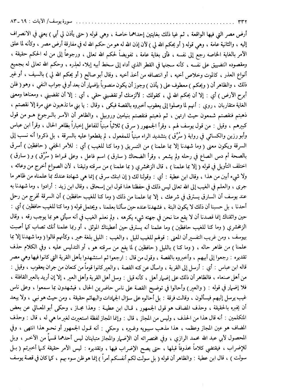 روي أنهم لما وصلوا إلى يعقوب أخبروه بالقصة فبكى وقال : يا بني ما تذهبون عني مرة إلا نقصتم ، ذهبتم فنقصت مشمعون حيث ارتهن ، ثم ذهبتم فنقصتم بنيامين وروبيل . والظاهر أنّ الأمر بالرجوع هو من قول كبيرهم . وقيل : من قول يوسف لهم . وقرأ الجمهور : سرق ثلاثياً مبنياً للفاعل ، إخباراً بظاهر الحال . وقرأ ابن عباس ، وأبو رزين ، والكسائي في رواية سرق بتشديد الراء مبنياً للمفعول ، لم يقطعوا عليه بالسرقة بل ذكروا أنه نسب إلى السرقة . ويكون معنى : وما شهدنا إلا بما علمنا من التسريق . وما كنا للغيب أي : للأمر الخفي حافظين ، أسرق بالصحة أم دس الصاع في رحله ولم يشعر ؟ وقرأ الضحاك : سارق اسم فاعل ، وعلى قراءة سرق وسارق اختلف التأويل في قوله : إلا بما علمنا . قال الزمخشري : بما علمنا من سرقته ، وتيقناً لأنّ الصواع أخرج من وعائه ، ولا شيء أبين من هذا . وقال ابن عطية : أي ، وقولنا لك إن ابنك سرق إنما هي شهادة عندك بما علمناه من ظاهر ما جرى ، والعلم في الغيب إلى الله تعالى ليس ذلك في حفظنا ، هذا قول ابن إسحاق : وقال ابن زيد : أرادوا وما شهدنا به عند يوسف أن السارق يسترق في شرعك ، إلا بما علمنا من ذلك ، وما كنا للغيب حافظين أنّ السرقة تخرج من رحل أحدنا ، بل حسبنا أن ذلك لا يكون البتة ، فشهدنا عنده حين سألنا بعلمنا . ويحتمل قوله : وما كنا للغيب حافظين أي : حين واثقناك ، إنما قصدنا أن لا يقع منا نحن في جهته شيء يكرهه ، ولم نعلم الغيب في أنه سيأتي هو بما يوجب رقه . وقال الزمخشري : وما كنا للغيب حافظين ، وما علمنا أنه يسترق حين أعطيناك الموثق ، أو ربما علمنا أنك تصاب كما أصبت بيوسف . ومن غريب التفسير أن المعنى قولهم : للغيب ، لليل والغيب الليل بلغة حمير ، وكأنهم قالوا : وما شهدنا إلا بما علمنا من ظاهر حاله ، وما كنا بالليل حافظين لما يقع من سرقته هو ، أو التدليس عليه . وفي الكلام حذف تقديره : رجعوا إلى أبيهم وأخبر بالقصة . وقول من قال : ارجعوا ثم استشهدوا بأهل القرية التي كانوا فيها وهي مصر قاله : ابن عباس أي : أرسل إلى القرية واسأل عن كنه القصة . والعير كانوا قوماً من كنعان من جران يعقوب . وقيل : من أهل صنعاء . فالظاهر أن ذلك على إضمار أهل كأنه قيل : وسل أهل القرية وأهل العير ، إلا أن أريد بالعير القافلة ، فلا إضمار في قوله والعير . وأحالوا في توضيح القصة على ناس حاضرين الحال فيشهدون بما سمعوا ، وعلى ناس غيب يرسل إليهم فيسألون . وقالت فرقة : بل أحالوه على سؤال الجمادات والبهائم حقيقة ، ومن حيث هو نبي ، ولا يبعد أن يخبره بالحقيقة ، وحذف المضاف هو قول الجمهور . قال ابن عطية : وهذا مجاز . وحكى أبو المعالي عن بعض المتكلمين أنه قال : هذا من الحذف وليس من المجاز قال : وإنما المجاز لفظة استعيرت لغير ما هي له قال : وحذف المضاف هو عين المجاز ، وعظمة هذا مذهب سيبويه وغيره . وحكى أنه قول الجمهور أو نحو هذا انتهى . وفي المحصول لأبي عبد الله محمد الرازي ، وفي مختصر أنه إن الإضمار والمجاز متباينان ليس أحدهما قسماً من الآخر . وبل للإضراب ، فيقتضي كلاماً محذوفاً قبلها حتى يصح الإضراب فيها وتقديره : ليس الأمر حقيقة كما أخبرتم ، بل سولت . قال ابن عطية : والظاهر أنّ قوله بل سولت لكم أنفسكم أمراً ، إنما هو ظن سوء بهم كما كان في قصة يوسف