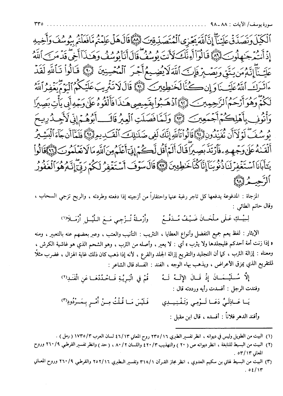 الْكَيْلَ وَتَصَدَّقْ عَلَيْنَآ إِنَّ اللَّهَ يَجْزِى الْمُتَصَدِّقِينَ قَالَ هَلْ عَلِمْتُمْ مَّا فَعَلْتُم بِيُوسُفَ وَأَخِيهِ إِذْ أَنتُمْ جَاهِلُونَ قَالُواْ أَءِنَّكَ لاّنتَ يُوسُفُ قَالَ أَنَاْ يُوسُفُ وَهَاذَا أَخِى قَدْ مَنَّ اللَّهُ عَلَيْنَآ إِنَّهُ مَن يَتَّقِ وَيِصْبِرْ فَإِنَّ اللَّهَ لاَ يُضِيعُ أَجْرَ الْمُحْسِنِينَ قَالُواْ تَاللَّهِ لَقَدْ آثَرَكَ اللَّهُ عَلَيْنَا وَإِن كُنَّا لَخَاطِئِينَ قَالَ لاَ تَثْرَيبَ عَلَيْكُمُ الْيَوْمَ يَغْفِرُ اللَّهُ لَكُمْ وَهُوَ أَرْحَمُ الرَاحِمِينَ اذْهَبُواْ بِقَمِيصِى هَاذَا فَأَلْقُوهُ عَلَى وَجْهِ أَبِى يَأْتِ بَصِيرًا وَأْتُونِى بِأَهْلِكُمْ أَجْمَعِينَ وَلَمَّا فَصَلَتِ الْعِيرُ قَالَ أَبُوهُمْ إِنِّى لأَجِدُ رِيحَ يُوسُفَ لَوْلاَ أَن تُفَنِّدُونِ قَالُواْ تَاللَّهِ إِنَّكَ لَفِى ضَلَالِكَ الْقَدِيمِ فَلَمَّآ أَن جَآءَ الْبَشِيرُ أَلْقَاهُ عَلَى وَجْهِهِ فَارْتَدَّ بَصِيرًا قَالَ أَلَمْ أَقُلْ لَّكُمْ إِنِّىأَعْلَمُ مِنَ اللَّهِ مَا لاَ تَعْلَمُونَ قَالُواْ ياأَبَانَا اسْتَغْفِرْ لَنَا ذُنُوبَنَآ إِنَّا كُنَّا خَاطِئِينَ قَالَ سَوْفَ أَسْتَغْفِرُ لَكُمْ رَبِّىإِنَّهُ هُوَ الْغَفُورُ الرَّحِيمُ فَلَمَّا دَخَلُواْ عَلَى يُوسُفَ ءَاوَى إِلَيْهِ أَبَوَيْهِ وَقَالَ ادْخُلُواْ مِصْرَ إِن شَآءَ اللَّهُ ءَامِنِينَ وَرَفَعَ أَبَوَيْهِ عَلَى الْعَرْشِ وَخَرُّواْ لَهُ سُجَّدَا وَقَالَ ياأَبَتِ هَاذَا تَأْوِيلُ رُؤْيَاىمِن قَبْلُ قَدْ جَعَلَهَا رَبِّى حَقًّا وَقَدْ أَحْسَنَ بَىإِذْ أَخْرَجَنِى مِنَ السِّجْنِ وَجَآءَ بِكُمْ مِّنَ الْبَدْوِ مِن بَعْدِ أَن نَّزغَ الشَّيْطَانُ بَيْنِى وَبَيْنَ إِخْوَتِىإِنَّ رَبِّى لَطِيفٌ لِّمَا يَشَآءُ إِنَّهُ هُوَ الْعَلِيمُ الْحَكِيمُ رَبِّ قَدْ آتَيْتَنِى مِنَ الْمُلْكِ وَعَلَّمْتَنِى مِن تَأْوِيلِ الاٌّ حَادِيثِ فَاطِرَ السَّمَاوَاتِ وَالاٌّ رْضِ أَنتَ وَلِىِّ فِى الدُّنُيَا وَالاٌّ خِرَةِ تَوَفَّنِى مُسْلِمًا وَأَلْحِقْنِى بِالصَّالِحِينَ ( )