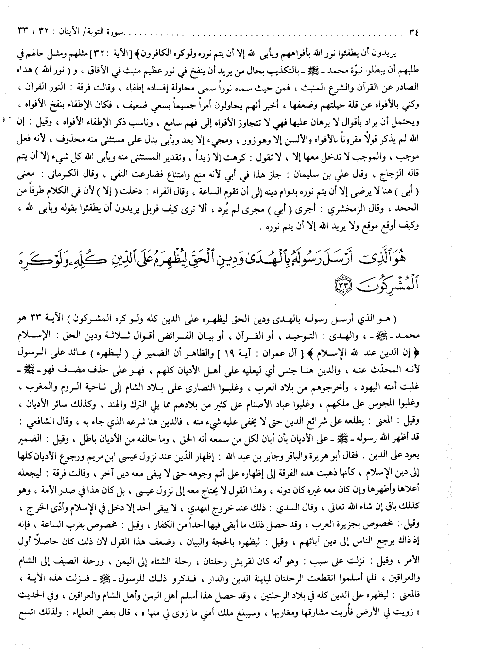 ) يُرِيدُونَ أَن يُطْفِئُواْ نُورَ اللَّهِ بِأَفْواهِهِمْ وَيَأْبَى اللَّهُ إِلاَّ أَن يُتِمَّ نُورَهُ وَلَوْ كَرِهَ الْكَافِرُونَ ( مثلهم ومثل حالهم في طلبهم أن يبطلوا نبوّة محمد ( صلى الله عليه وسلم ) ) بالتكذيب بحال من يريد أن ينفخ في نور عظيم منبث في الآفاق ، ونور الله هداه الصادر عن القرآن والشرع المنبث ، فمن حيث سماه نوراً سمى محاولة إفساده إطفاء . وقالت فرقة : النور القرآن وكنى بالأفواه عن قلة حيلتهم وضعفها . أخبر أنهم يحاولون أمراً جسيماً بسعيٍ ضعيف ، فكان الإطفاء بنفخ الأفواه . ويحتمل أن يراد بأقوال لا برهان عليها ، فهي لا تتجاوز الأفواه إلى فهم سامعٍ ، وناسب ذكر الإطفاء الأفواه . وقيل : إن الله لم يذكر قولاً مقروناً بالأفواه والألسن إلا وهو زور ، ومجيء إلا بعد ويأبى يدل على مستثنى منه محذوف ، لأنه فعل موجب ، والموجب لا تدخل معه إلا ، لا تقول كرهت إلا زيداً . وتقدير المستثنى منه : ويأبى الله كل شيء إلا أنْ يتم قاله الزجاج . وقال علي بن سليمان : جاز هذا في أبي ، لأنه منع وامتناع ، فضارعت النفي . وقال الكرماني : معنى أبى هنا لا يرضى إلا أن يتم نوره بدوام دينه إلى أن تقوم الساعة . وقال الفراء : دخلت إلا لأنّ في الكلام طرفاً من الجحد . وقال الزمخشري : أجرى أبى مجرى لم يرد . ألا ترى كيف قوبل يريدون أن يطفئوا بقوله : ويأبى الله ، وكيف أوقع موقع ولا يريد الله إلا أن يتم نوره ؟