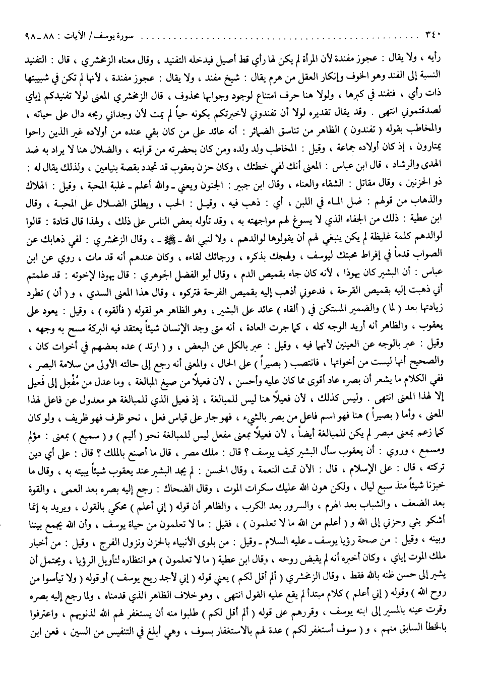 رأيه ، ولا يقال : عجوز مفندة ، لأن المرأة لم يكن لها رأي قط أصيل فيدخله التفنيد . وقال معناه الزمخشري قال : التفنيد النسبة إلى الفند وهو الخوف وإنكارالعقل ، من هرم يقال : شيخ مفند ، ولا يقال عجوز مفندة ، لأنها لم تكن في شبيبتها ذات رأي فنفند في كبرها ، ولولا هنا حرف امتناع لوجود ، وجوابها محذوف . قال الزمخشري : المعنى لولا تفنيدكم إياي لصدقتموني انتهى . وقد يقال : تقديره لولا أن تفندوني لأخبرتكم بكونه حياً لم يمت ، لأن وجداني ريحه دال على حياته . والمخاطب بقوله : تفندون ، الظاهر من تناسق الضمائر أنه عائد على من كان بقي عنده من أولاده غير الذين راحوا يمتارون ، إذ كان أولاده جماعة . وقيل : المخاطب ولد ولده ومن كان بحضرته من قرابته . والضلال هنا لا يراد به ضد الهدى والرّشاد ، قال ابن عباس : المعنى إنك لفي خطئك ، وكان حزن يعقوب قد تجدد بقصة بنيامين ، ولذلك يقال له : ذو الحزنين . وقال مقاتل : الشقاء والعناء . وقال ابن جبير : الجنون ، ويعني والله أعلم غلبة المحبة . وقيل : الهلاك والذهاب من قولهم : ضل الماء في اللبن أي : ذهب فيه . وقيل : الحب ، ويطلق الضلال على المحبة . وقال ابن عطية : ذلك من الجفاء الذي لا يسوغ لهم مواجهته به ، وقد تأوله بعض الناس على ذلك ، ولهذا قال قتادة : قالوا لوالدهم كلمة غليظة لم يكن ينبغي لهم أن يقولوها لوالدهم ، ولا لنبي الله ( صلى الله عليه وسلم ) ) . وقال الزمخشري : لفي ذهابك عن الصواب قدماً في إفراط محبتك ليوسف ، ولهجك بذكره ، ورجاءك لقاءه ، وكان عندهم أنه قد مات . روي عن ابن عباس أنّ البشير كان يهوذا ، لأنه كان جاء بقميص الدم . وقال أبو الفضل الجوهري : قال يهوذا لإخوته : قد علمتم أني ذهبت إليه بقميص القرحة ، فدعوني أذهب إليه بقميص الفرحة فتركوه ، وقال هذا المعنى : السدي . وأن تطرد زيادتها بعد لما ، والضمير المستكن في ألقاه عائد على البشير ، وهو الظاهر ، هو لقوله : فألقوه . وقيل : يعود على يعقوب ، والظاهر أنه أريد الوجه كله كما جرت العادة أنه متى وجد الإنسان شيئاً يعتقد فيه البركة مسح به وجهه . وقيل : عبر بالوجه عن العينين لأنهما فيه . وقيل : عبر بالكل عن البعض . وارتدَّ عدّه بعضهم في أخوات كان ، والصحيح أنها ليست من أخواتها ، فانتصب بصيراً على الحال والمعني : أنه رجع إلى حالته الأولى من سلامة البصر . ففي الكلام ما يشعر أنّ بصره عاد أقوى مما كان عليه وأحسن ، لأنّ فعيلاً من صيغ المبالغة ، وما عدل من مفعل إلى فعيل إلا لهذا المعنى انتهى . وليس كذلك لأنّ فعيلاً هنا ليس للمبالغة ، إذ فعيل الذي للمبالغة هو معدول عن فاعل لهذا المعنى . وأما بصيراً هنا فهو اسم فاعل من بصر بالشيء ، فهو جار على قياس فعل نحو ظرف فهو ظريف ، ولو كان كما زعم بمعنى مبصر لم يكن للمبالغة أيضاً ، لأنّ فعيلاً بمعنى ليس للمبالغة نحو : أليم وسميع بمعنى مؤلم ومسمع . وروي أن يعقوب سأل البشيركيف يوسف ؟ قال : ملك مصر . قال : ما أصنع بالملك ؟ قال : على أي دين تركته ؟ قال : على الإسلام ، قال : الآن تمت النعمة . وقال الحسن : لم يجد البشير عند يعقوب شيئاً ببيته به وقال : ما خبرنا شيئاً منذ سبع ليال ، ولكن هون الله عليك سكرات الموت . وقال الضحاك : رجع إليه بصره بعد العمى ، والقوة بعد الضعف ، والشباب بعد الهرم ، والسرور بعد الكرب . والظاهر أن قوله : إني أعلم ، محكي بالقول ويريد به إنما أشكوا بثي وحزني إلى الله ، وأعلم من الله ما لا تعلمون . فقيل : ما لا تعلمون من حياة يوسف ، وأن الله يجمع بيننا وبينه . وقيل : من صحة رؤيا يوسف عليه السلام ، وقيل : من بلوى الأنبياء بالحزن ، ونزول الفرج ، وقيل : من أخبار ملك الموت إياي ، وكان أخبره أنه لم يقبض روحه . وقال ابن عطية : ما لا تعلمون هو انتظاره لتأويل الرؤيا ، ويحتمل أن يشير إلى حسن ظنه بالله فقط . وقال الزمخشري : ألم أقل لكم يعني قوله : إني لأجد ريح يوسف ، أو قوله : ولا تيأسوا من روح الله . وقوله إني أعلم ، كلام مبتدأ لم يقع عليه القول انتهى . وهو خلاف الظاهر الذي قدمناه . ولما رجع إليه بصره وقرت عينه بالمسير إلى ابنه يوسف ، وقررهم ع