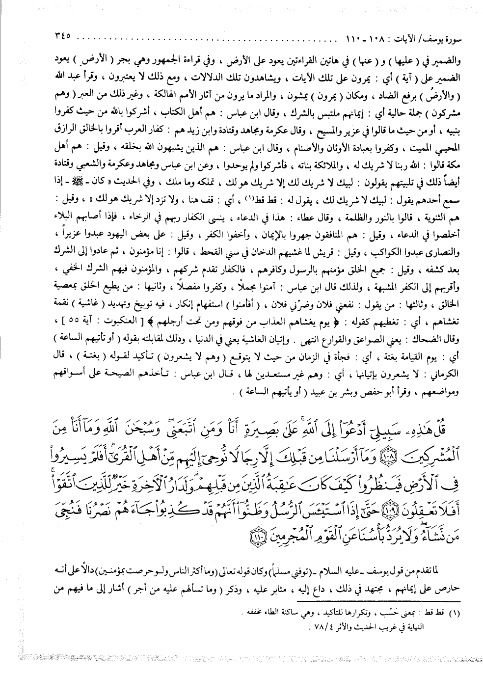 ( قُلْ هَاذِهِ سَبِيلِى أَدْعُو إِلَى اللَّهِ عَلَى بَصِيرَةٍ أَنَاْ وَمَنِ اتَّبَعَنِى وَسُبْحَانَ اللَّهِ وَمَا أَنَاْ مِنَ الْمُشْرِكِينَ وَمَا أَرْسَلْنَا مِن قَبْلِكَ إِلاَّ رِجَالاً نُّوحِى إِلَيْهِمْ مّنْ أَهْلِ الْقُرَى أَفَلَمْ يَسِيرُواْ فِى الاْرْضِ فَيَنظُرُواْ كَيْفَ كَانَ عَاقِبَةُ ( : لما تقدم من قول يوسف عليه السلام : ) تَوَفَّنِى مُسْلِمًا ( وكان قوله تعالى : ) وَمَا أَكْثَرُ النَّاسِ وَلَوْ حَرَصْتَ بِمُؤْمِنِينَ ( دالاً على أنه حارص على إيمانهم ، مجتهد في ذلك ، داع إليه ، مثابر عليه . وذكر ) وَمَا تَسْأَلُهُمْ عَلَيْهِ مِنْ أَجْرٍ ( أشار إلى فيهم من