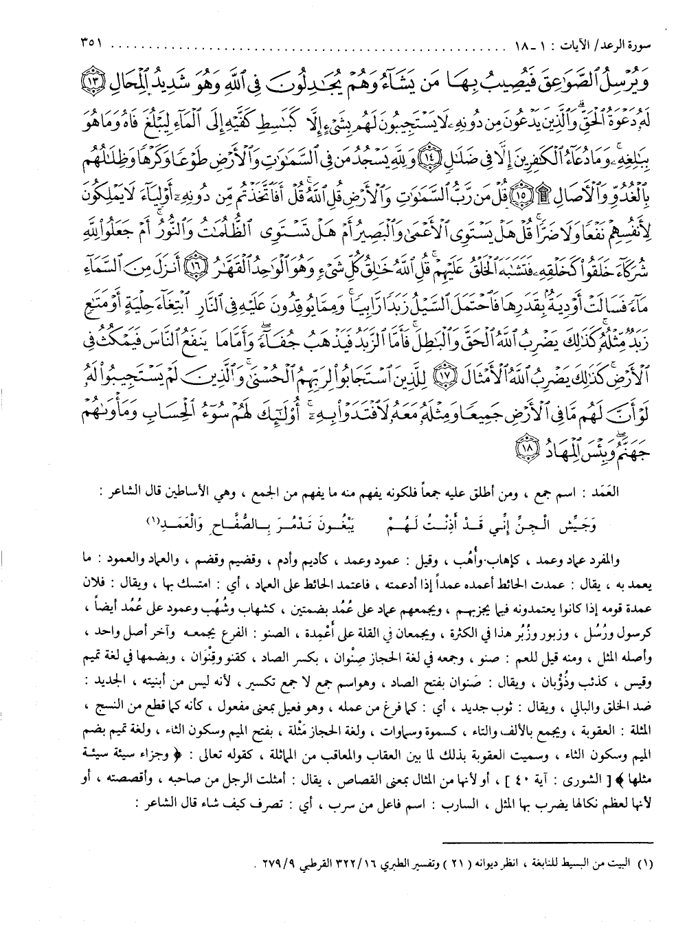 وَيُرْسِلُ الصَّوَاعِقَ فَيُصِيبُ بِهَا مَن يَشَآءُ وَهُمْ يُجَادِلُونَ فِى اللَّهِ وَهُوَ شَدِيدُ الْمِحَالِ لَهُ دَعْوَةُ الْحَقِّ وَالَّذِينَ يَدْعُونَ مِن دُونِهِ لاَ يَسْتَجِيبُونَ لَهُم بِشَىْءٍ إِلاَّ كَبَاسِطِ كَفَّيْهِ إِلَى الْمَآءِ لِيَبْلُغَ فَاهُ وَمَا هُوَ بِبَالِغِهِ وَمَا دُعَآءُ الْكَافِرِينَ إِلاَّ فِى ضَلَالٍ وَللَّهِ يَسْجُدُ مَن فِى السَّمَاوَاتِ وَالاٌّ رْضِ طَوْعًا وَكَرْهًا وَظِلَالُهُم بِالْغُدُوِّ وَالاٌّ صَالِ قُلْ مَن رَّبُّ السَّمَاوَاتِ وَالاٌّ رْضِ قُلِ اللَّهُ قُلْ أَفَاتَّخَذْتُمْ مِّن دُونِهِ أَوْلِيَآءَ لاَ يَمْلِكُونَ لأَنْفُسِهِمْ نَفْعًا وَلاَ ضَرًّا قُلْ هَلْ يَسْتَوِى الاٌّ عْمَى وَالْبَصِيرُ أَمْ هَلْ تَسْتَوِى الظُّلُمَاتُ وَالنُّورُ أَمْ جَعَلُواْ للَّهِ شُرَكَآءَ خَلَقُواْ كَخَلْقِهِ فَتَشَابَهَ الْخَلْقُ عَلَيْهِمْ قُلِ اللَّهُ خَالِقُ كُلِّ شَىْءٍ وَهُوَ الْوَاحِدُ الْقَهَّارُ أَنَزَلَ مِنَ السَّمَآءِ مَآءً فَسَالَتْ أَوْدِيَةٌ بِقَدَرِهَا فَاحْتَمَلَ السَّيْلُ زَبَدًا رَّابِيًا وَمِمَّا يُوقِدُونَ عَلَيْهِ فِى النَّارِ ابْتِغَآءَ حِلْيَةٍ أَوْ مَتَاعٍ زَبَدٌ مِّثْلُهُ كَذالِكَ يَضْرِبُ اللَّهُ الْحَقَّ وَالْبَاطِلَ فَأَمَّا الزَّبَدُ فَيَذْهَبُ جُفَآءً وَأَمَّا مَا يَنفَعُ النَّاسَ فَيَمْكُثُ فِى الاٌّ رْضِ كَذالِكَ يَضْرِبُ اللَّهُ الاٌّ مْثَالَ لِلَّذِينَ اسْتَجَابُواْ لِرَبِّهِمُ الْحُسْنَى وَالَّذِينَ لَمْ يَسْتَجِيبُواْ لَهُ لَوْ أَنَّ لَهُمْ مَّا فِى الاٌّ رْضِ جَمِيعاً وَمِثْلَهُ مَعَهُ لاَفْتَدَوْاْ بِهِ أُوْلَائِكَ لَهُمْ سُوءُ الْحِسَابِ وَمَأْوَاهُمْ جَهَنَّمُ وَبِئْسَ الْمِهَادُ ( )