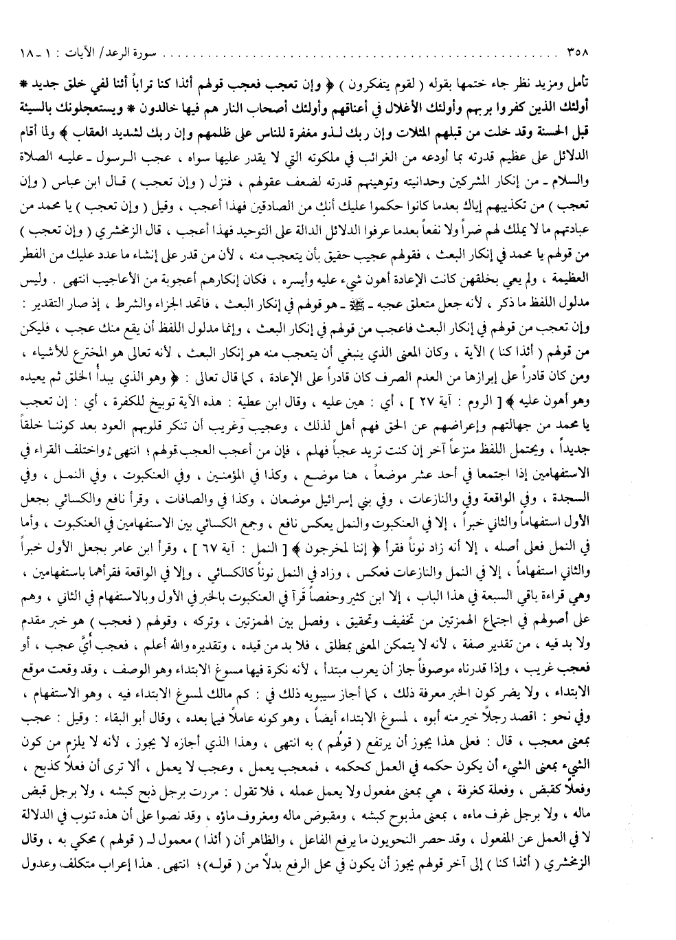 ( وَإِن تَعْجَبْ فَعَجَبٌ قَوْلُهُمْ أَءذَا كُنَّا تُرَابًا أَءنَّا لَفِى خَلْقٍ جَدِيدٍ أُوْلَئِكَ الَّذِينَ كَفَرُواْ بِرَبّهِمْ وَأُوْلَئِكَ الاْغْلَالُ فِى أَعْنَاقِهِمْ وَأُوْلَئِكَ أَصْحَابُ النَّارِ هُمْ فِيهَا خَالِدونَ وَيَسْتَعْجِلُونَكَ بِالسَّيّئَةِ قَبْلَ الْحَسَنَةِ وَقَدْ خَلَتْ مِن قَبْلِهِمُ الْمَثُلَاتُ وَإِنَّ رَبَّكَ لَذُو مَغْفِرَةٍ لّلنَّاسِ عَلَى ظُلْمِهِمْ وَإِنَّ رَبَّكَ لَشَدِيدُ الْعِقَابِ ( : ولما أقام الدلائل على عظيم قدرته بما أودعه من الغرائب في ملكوته التي لا يقدر عليها سواه ، عجب الرسول عليه الصلاة والسلام من إنكار المشركين وجدانيته ، وتوهينهم قدرته لضعف عقولهم فنزل . وإن تعجب قال ابن عباس : وإن تعجبْ من تكذيبهم إياك بعدما كانوا حكموا عليك أنك من الصادقين ، فهذا أعجب . وقيل : وإن تعجب يا محمد من عبادتهم ما لا يملك لهم ضراً ولا نفعاً بعدما عرفوا الدلائل الدالة على التوحيد ، فهذا أعجب . قال الزمخشري : وإن تعجب من قولهم يا محمد في إنكار البعث ، فقولهم عجيب حقيق بأنْ يتعجب منه ، لأن من قدر على إنشاء ما عدد عليك من الفطر العظيمة ، ولم يعي بخلقهن ، كانت الإعادة أهون شيء عليه وأيسره ، فكان إنكارهم أعجوبة من الأعاجيب انتهى . وليس مدلول اللفظ ما ذكر ، لأنه جعل متعلق عجبه ( صلى الله عليه وسلم ) ) هو قولهم في إنكار البعث ، فاتحذ الجزاء والشرط ، إذ صار التقدير : وإن تعجب من قولهم في إنكار البعث فاعجب من قولهم في إنكار البعث ، وإنما مدلول اللفظ أن يقع منك عجب ، فليكن من قولهم : أئذا كنا الآية . وكان المعنى الذي ينبغي أن يتعجب منه : هو إنكار البعث ، لأنه تعالى هو المخترع للأشياء . ومن كان قادراً على إبرازها من العدم الصرف كان قادراً على الإعادة ، كما قال تعالى : ) وَهُوَ الَّذِى اللَّهُ الْخَلْقَ ثُمَّ يُعِيدُهُ ( وهو أهون عليه أي : هين عليه .