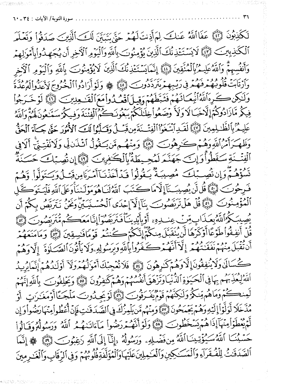 ْ لَكَاذِبُونَ عَفَا اللَّهُ عَنكَ لِمَ أَذِنتَ لَهُمْ حَتَّى يَتَبَيَّنَ لَكَ الَّذِينَ صَدَقُواْ وَتَعْلَمَ الْكَاذِبِينَ لاَ يَسْتَأْذِنُكَ الَّذِينَ يُؤْمِنُونَ بِاللَّهِ وَالْيَوْمِ الاٌّ خِرِ أَن يُجَاهِدُواْ بِأَمْوَالِهِمْ وَأَنفُسِهِمْ وَاللَّهُ عَلِيمٌ بِالْمُتَّقِينَ إِنَّمَا يَسْتَأْذِنُكَ الَّذِينَ لاَ يُؤْمِنُونَ بِاللَّهِ وَالْيَوْمِ الاٌّ خِرِ وَارْتَابَتْ قُلُوبُهُمْ فَهُمْ فِى رَيْبِهِمْ يَتَرَدَّدُونَ وَلَوْ أَرَادُواْ الْخُرُوجَ لأَعَدُّواْ لَهُ عُدَّةً وَلَاكِن كَرِهَ اللَّهُ انبِعَاثَهُمْ فَثَبَّطَهُمْ وَقِيلَ اقْعُدُواْ مَعَ الْقَاعِدِينَ لَوْ خَرَجُواْ فِيكُم مَّا زَادُوكُمْ إِلاَّ خَبَالاً ولاّوْضَعُواْ خِلَالَكُمْ يَبْغُونَكُمُ الْفِتْنَةَ وَفِيكُمْ سَمَّاعُونَ لَهُمْ وَاللَّهُ عَلِيمٌ بِالظَّالِمِينَ لَقَدِ ابْتَغَوُاْ الْفِتْنَةَ مِن قَبْلُ وَقَلَّبُواْ لَكَ الأُمُورَ حَتَّى جَآءَ الْحَقُّ وَظَهَرَ أَمْرُ اللَّهِ وَهُمْ كَارِهُونَ وَمِنْهُمْ مَّن يَقُولُ ائْذَن لِّي وَلاَ تَفْتِنِّى أَلا فِى الْفِتْنَةِ سَقَطُواْ وَإِنَّ جَهَنَّمَ لَمُحِيطَةٌ بِالْكَافِرِينَ إِن تُصِبْكَ حَسَنَةٌ تَسُؤْهُمْ وَإِن تُصِبْكَ مُصِيبَةٌ يَقُولُواْ قَدْ أَخَذْنَا أَمْرَنَا مِن قَبْلُ وَيَتَوَلَّواْ وَّهُمْ فَرِحُونَ قُل لَّن يُصِيبَنَآ إِلاَّ مَا كَتَبَ اللَّهُ لَنَا هُوَ مَوْلَانَا وَعَلَى اللَّهِ فَلْيَتَوَكَّلِ الْمُؤْمِنُونَ قُلْ هَلْ تَرَبَّصُونَ بِنَآ إِلاَ إِحْدَى الْحُسْنَيَيْنِ وَنَحْنُ نَتَرَبَّصُ بِكُمْ أَن يُصِيبَكُمُ اللَّهُ بِعَذَابٍ مِّنْ عِندِهِ أَوْ بِأَيْدِينَا فَتَرَبَّصُواْ إِنَّا مَعَكُمْ مُّتَرَبِّصُونَ قُلْ أَنفِقُواْ طَوْعاً أَوْ كَرْهاً لَّن يُتَقَبَّلَ مِنكُمْ إِنَّكُمْ كُنتُمْ قَوْماً فَاسِقِينَ وَمَا مَنَعَهُمْ أَن تُقْبَلَ مِنْهُمْ نَفَقَاتُهُمْ إِلاَ أَنَّهُمْ كَفَرُواْ بِاللَّهِ وَبِرَسُولِهِ وَلاَ يَأْتُونَ الصَّلَواةَ إِلاَّ وَهُمْ كُسَالَى وَلاَ يُنفِقُونَ إِلاَّ وَهُمْ كَارِهُونَ فَلاَ تُعْجِبْكَ أَمْوَالُهُمْ وَلاَ أَوْلَادُهُمْ إِنَّمَا يُرِيدُ اللَّهُ لِيُعَذِّبَهُمْ بِهَا فِي الْحَيَواةِ الدُّنْيَا وَتَزْهَقَ أَنفُسُهُمْ وَهُمْ كَافِرُونَ وَيَحْلِفُونَ بِاللَّهِ إِنَّهُمْ لَمِنكُمْ وَمَا هُم مِّنكُمْ وَلَاكِنَّهُمْ قَوْمٌ يَفْرَقُونَ لَوْ يَجِدُونَ مَلْجَئاً أَوْ مَغَارَاتٍ أَوْ مُدَّخَلاً لَّوَلَّوْاْ إِلَيْهِ وَهُمْ يَجْمَحُونَ وَمِنْهُمْ مَّن يَلْمِزُكَ فِي الصَّدَقَاتِ فَإِنْ أُعْطُواْ مِنْهَا رَضُواْ وَإِن لَّمْ يُعْطَوْاْ مِنهَا إِذَا هُمْ يَسْخَطُونَ وَلَوْ أَنَّهُمْ رَضُوْاْ مَآ ءَاتَاهُمُ اللَّهُ وَرَسُولُهُ وَقَالُواْ حَسْبُنَا اللَّهُ سَيُؤْتِينَا اللَّهُ مِن فَضْلِهِ وَرَسُولُهُ إِنَّآ إِلَى اللَّهِ رَاغِبُونَ إِنَّمَا الصَّدَقَاتُ لِلْفُقَرَآءِ وَالْمَسَاكِينِ وَالْعَامِلِينَ عَلَيْهَا وَالْمُؤَلَّفَةِ قُلُوبُهُمْ وَفِى الرِّقَابِ وَالْغَارِمِينَ