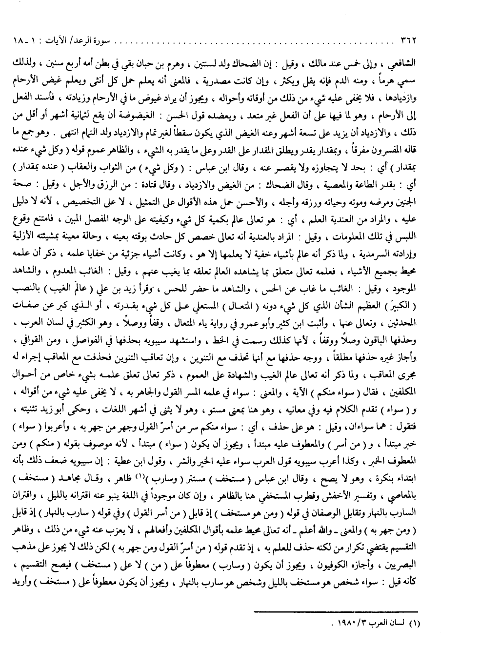 والمراد من العندية العلم أي : هو تعالى عالم بكمية كل شيء ، وكيفيته على الوجه المفصل المبين ، فامتنع وقوع اللبس في تلك المعلومات . وقيل المراد بالعندية أنه تعالى خصص كل حادث بوقته بعينه ، وحالة معينة بمشيئته الأزلية وإرادته السرمدية . ولما ذكر أنه عالم بأشياء خفية لا يعلمها إلا هو ، وكانت أشياء جزئية من خفايا علمه ، ذكر أن علمه محيط بجميع الأشياء ، فعلمه تعالى متعلق بما يشاهده العالم تعلقه بما يغيب عنهم . وقيل : الغائب المعدوم ، والشاهد الموجود . وقيل : الغائب ما غاب عن الحس ، والشاهد ما حضر للحس . وقرأ زيد بن علي : عالم الغيب بالنصب ، الكبير العظيم الشأن الذي كل شيء دونه ، المتعال المستعلي على كل شيء بقدرته ، أو الذي كبر عن صفات المحدثين وتعالى عنها . وأثبت ابن كثير وأبو عمر وفي رواية : ياء المتعال وقفاً ووصلاً ، وهو الكثير في لسان العرب ، وحذفها الباقون وصلاً ووقفاً ، لأنها كذلك رسمت في الخط . واستشهد سيبويه بحذفها في الفواصل ومن القوافي ، وأجاز غيره حذفها مطلقاً . ووجه حذفها مع أنها تحذف مع التنوين ، وإن تعاقب التنوين ، فحذفت مع المعاقب إجراء له مجرى المعاقب . ولما ذكر أنه تعالى عالم الغيب والشهادة على العموم ، ذكر تعالى تعلق علمه بشيء خاص من أحوال المكلفين ، فقال : سواء منكم الآية . والمعنى : سواء في علمه المسر القول ، والجاهر به لا يخفى عليه شيء من أقواله . وسواء تقدم الكلام فيه ، وفي معانيه ، وهو هنا بمعنى مستو ، وهو لا يثني في أشهر اللغات . وحكى أبو زيد تثنيته فتقول : هما سواآن . وقيل : هو على حذف أي : سواء منكم سرّ من أسرّ القول ، وجهر من جهر به ، وأعربوا سواء خبر مبتدأ أو من أسر ، والمعطوف عليه مبتدأ . ويجوز أن يكون سواء مبتدأ لأنه موصوف بقوله : منكم ، ومن المعطوف الخبر . وكذا أعرب سيبويه قول العرب : سواء عليه الخير والشر . وقول ابن عطية : إن سيبويه ضعف ذلك بأنه ابتداء بنكرة ، وهو لا يصح .