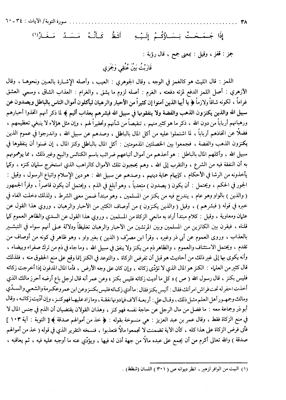 ( الْمُشْرِكُونَ يَاأَيُّهَا الَّذِينَ ءامَنُواْ إِنَّ كَثِيراً مّنَ الاْحْبَارِ وَالرُّهْبَانِ لَيَأْكُلُونَ أَمْوَالَ النَّاسِ بِالْبَاطِلِ وَيَصُدُّونَ عَن سَبِيلِ اللَّهِ وَالَّذِينَ يَكْنِزُونَ الذَّهَبَ وَالْفِضَّةَ ( لمّا ذكر أنهم اتخذوا أحبارهم ورهبانهم أرباباً من دون الله ، ذكر ما هو كثير منهم تنقيصاً من شأنهم وتحقيراً لهم ، وأنّ مثل هؤلاء لا ينبغي تعظيمهم ، فضلاً عن اتخاذهم أرباباً لما اشتملوا عليه من أكل المال بالباطل ، وصدهم عن سبيل الله . واندرجوا في عموم الذين يكنزون الذهب والفضة ، فجمعوا بين الخصلتين المذمومتين : أكل المال بالباطل ، وكنز المال إن ضنوا أنْ ينفقوها في سبيل الله ، وأكلهم المال بالباطل هو أخذهم من أموال اتباعهم ضرائب باسم الكنائس والبيع ، وغير ذلك مما يوهمونهم به أنّ النفقه فيه من الشرع والتقرب إلى الله ، وهم يحجبون تلك الأموال كالراهب الذي استخرج سلمان كنزه . وكما يأخذونه من الرشا في الأحكام ، كإيهام حماية دينهم ، وصدهم عن سبيل الله هو دين الإسلام واتباع الرسول . وقيل : الجور في الحكم ، ويحتمل أن يكون يصدون متعدياً وهو أبلغ في الذم ، ويحتمل أن يكون قاصراً .