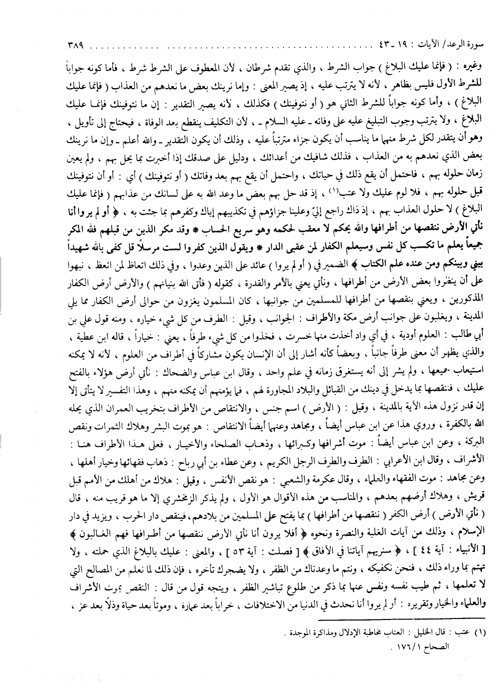 وقال ابن عباس والضحاك : نأتي أرض هؤلاء بالفتح عليك ، فتنقصها بما يدخل في دينك من القبائل والبلاد المجاورة لهم ، فما يؤمنهم أن يمكنه منهم . وهذا التفسير لا يتأتى إلا أن قدر نزول هذه الآية بالمدينة . وقيل : الأرض اسم جنس ، والانتقاص من الأطراف بتخريب العمران الذي يحله الله بالكفرة . وروي هذا عن ابن عباس أيضاً ، ومجاهد ، وعنهما أيضاً : الانتقاص هو بموت البشر ، وهلاك الثمرات ، ونقص البركة . وعن ابن عباس أيضاً : موت أشرافها وكبرائها ، وذهاب الصلحاء والأخيار ، فعلى هذا الأطراف هنا الأشراف . وقال ابن الأعرابي : الطرف والطرف الرجل الكريم . وعن عطاء بنن أبي رباح : ذهاب فقهائها وخيار أهلها . وعن مجاهد : موت الفقهاء والعلماء . وقال عكرمة والشعبي : هو نقص الأنفس . وقيل : هلاك من أهلك من الأمم قبل قريش ، وهلاك أرضهم بعدهم . والمناسب من هذه الأقوال هو الأول . ولم يذكر الزمخشري إلا ما هو قريب منه قال : نأتي الأرض أرض الكفر ننقصها من أطرافها بما يفتح على المسلمين من بلادهم ، فينقص دار الحرب ، ويزيد في دار الإسلام ، وذلك من آيات الغلبة والنصرة . ونحوه : ) أَفَلاَ يَرَوْنَ أَنَّا نَأْتِى الاْرْضَ نَنقُصُهَا مِنْ أَطْرَافِهَا أَفَهُمُ الْغَالِبُونَ ( ) سَنُرِيهِمْ ءايَاتِنَا فِى الاْفَاقِ ( والمعنى : عليك بالبلاغ الذي حملته ، ولا تهتم بما وراء ذلك فنحن نكفيكه ، ونتم ما وعدناك من الظفر ، ولا يضجرك تأخره ، فإنّ ذلك لما نعلم من المصالح التي لا تعلمها ، ثم طيب نفسه ونفس عنها بما ذكر من طلوع تباشير الظفر . ويتجه قول من قال : النقص بموت الأشراف والعلماء والخيار وتقريره : أو لم يروا أنا نحدث في الدنيا من الاختلافات خراباً بعد عماره ، وموتاً بعد حياة ، ذلا بعد عز ،