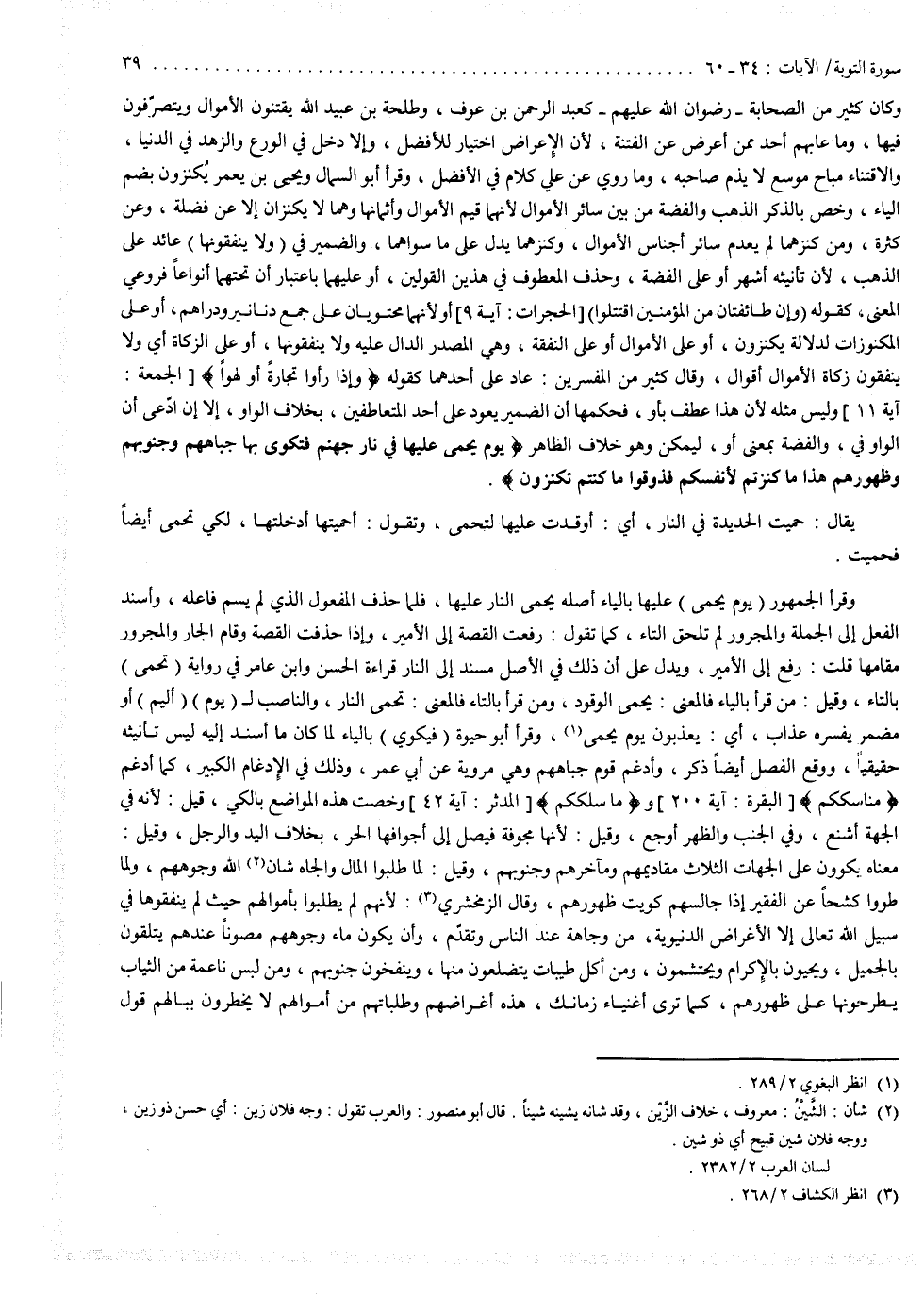 وقرأ أبو السمال ويحيى بن يعمر : يكنزون بضم الياء ، وخص بالذكر الذهب والفضة من بين سائر الأموال لأنهما قيم الأموال وأثمانها ، وهما لا يكنزان إلا عن فضلة وعن كثرة ، وممن كنزهما لم يعدم سائر أجناس الأموال ، وكنزهما يدل على ما سواهما . والضمير في : ولا ينفقونها ، عائد على الذهب ، لأن تأنيثه أشهر ، أو على الفضة . وحذف المعطوف في هذين القولين أو عليهما باعتبار أن تحتهما أنواعاً ، فروعي المعنى كقوله : ) وَإِن طَائِفَتَانِ مِنَ الْمُؤْمِنِينَ اقْتَتَلُواْ ( أو لأنهما محتويان على جمع دنانير ودراهم ، أو على المكنوزات ، لدلالة يكنزون . أو على الأموال ، أو على النفقة وهي المصدر الدال عليه . ولا ينفقونها ، أو على الزكاة أي : ولا ينفقون زكاة الأموال أقوال . وقال كثير من المفسرين : عاد على أحدهما كقوله : ) وَإِذْ رَأَوْاْ تِجَارَةً أَوْ لَهْواً ( وليس مثله ، لأن هذا عطف بأو ، فحكمهما أنّ الضمير يعود على أحد المتعاطفين بخلاف الواو ، إلا أن ادّعى أنّ الواو في والفضة بمعنى أو ليمكن ، وهو خلاف الظاهر .