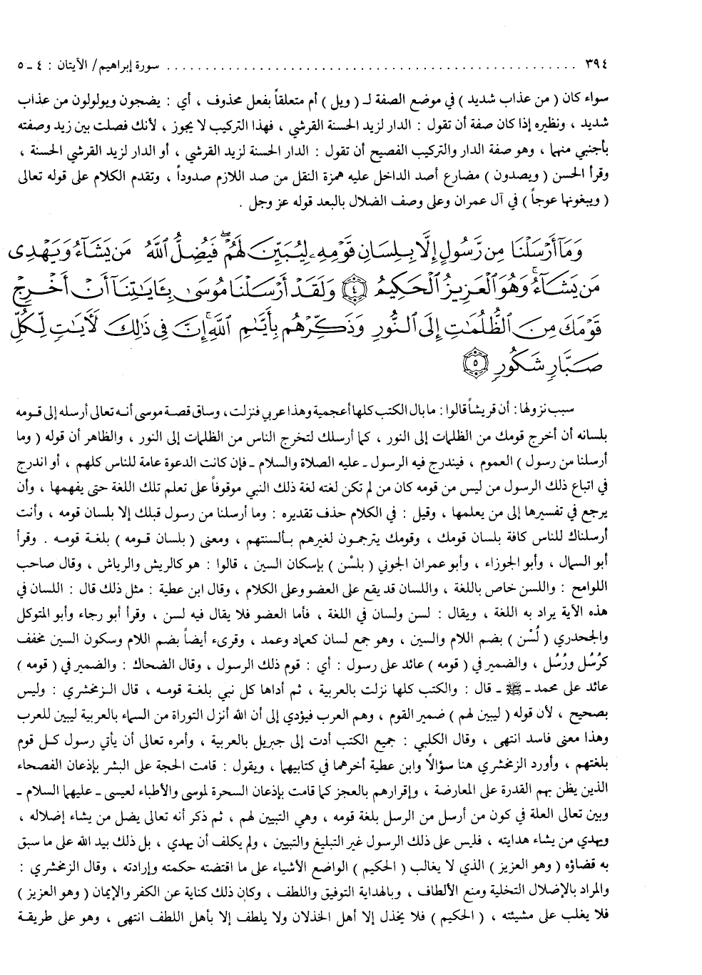 ) وَمَا أَرْسَلْنَا مِن رَّسُولٍ إِلاَّ بِلِسَانِ قَوْمِهِ لِيُبَيّنَ لَهُمْ فَيُضِلُّ اللَّهُ مَن يَشَاء وَيَهْدِى مَن يَشَاء وَهُوَ الْعَزِيزُ الْحَكِيمُ ( سبب نزولها أنّ قريشاً قالوا : ما بال الكتب كلها أعجمية وهذا عربي ؟ فنزلت . وساق قصة موسى أنه تعالى أرسله إلى قومه بلسانه ، أن أخرج قومك من الظلمات إلى النور ، كما أرسلك لتخرج الناس من الظلمات إلى النور . والظاهر أن قوله : وما أرسلنا من رسول ، العموم فيندرج فيه الرسول عليه الصلاة والسلام . فإن كانت الدعوة عامة للناس كلهم ، أو اندرج في اتباع ذلك الرسول من ليس من قومه ، كان من لم تكن لغته لغة ذلك النبي موقوفاً على تعلم تلك اللغة حتى يفهمها ، وأن يرجع في تفسيرها إلى من يعلمها . وقيل : في الكلام حذف تقديره : وما أرسلنا من رسول قبلك إلا بلسان قومه ، وأنت أرسلناك للناس كافة بلسان قومك ، وقومك يترجمون لغيرهم بألسنتهم ، ومعنى بلسان قومه : بلغة قومه .