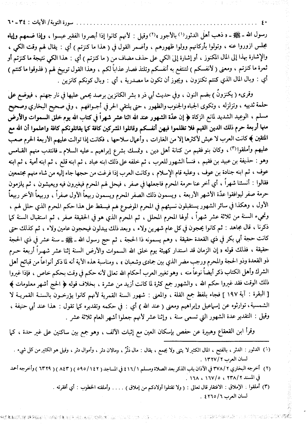 ( إِنَّ عِدَّةَ الشُّهُورِ عِندَ اللَّهِ اثْنَا عَشَرَ شَهْراً فِي كِتَابِ اللَّهِ يَوْمَ خَلَقَ السَّمَاوَاتِ وَالاْرْضَ مِنْهَا أَرْبَعَةٌ حُرُمٌ ذالِكَ الدّينُ الْقَيّمُ فَلاَ تَظْلِمُواْ فِيهِنَّ أَنفُسَكُمْ وَقَاتِلُواْ الْمُشْرِكِينَ كَافَّةً كَمَا يُقَاتِلُونَكُمْ كَافَّةً وَاعْلَمُواْ أَنَّ اللَّهَ ( كانت العرب لا عيش لأكثرها إلا من الغارات وأعمال سلاحها ، فكانت إذا توالت عليهم الأربعة الحرم صعب عليها وأملقوا ، وكان بنو فقيم من كنانة أهل دين وتمسك بشرع إبراهيم عليه السلام ، فانتدب منهم القلمس وهو حذيفة بن عبيد بن فقيم فنسأ الشهور للعرب ، ثم خلفه على ذلك ابنه عباد ، ثم ابنه قلع ، ثم ابنه أمية ، ثم ابنه عوف ، ثم ابنه جنادة بن عوف ، وعليه قام الإسلام . وكانت العرب إذا فرغت من حجها جاء إليه من شاء منهم مجتمعين فقالوا : أنسئنا شهراً أي : أخِّر عنا حرمة المحرم فاجعلها في صفر ، فيحل لهم المحرم ، فيغيرون فيه ويعيشون . ثم يلزمون حرمة صفر ليوافقوا عدّة الأشهر الأربعة ، ويسمون ذلك الصفر المحرم ، ويسمون ربيعاً الأول صفراً ، وربيعاً الآخر ربيعاً الأول ، وهكذا في سائر الشهور يستقبلون نسيئهم في المحرم الموضع لهم ، فيسقط على هذا حكم المحرم الذي حلل لهم ، وتجيء السنة من ثلاثة عشر شهراً أولها المحرم المحلل ، ثم المحرم الذي هو في الحقيقة صفر ، ثم استقبال السنة كما ذكرنا .