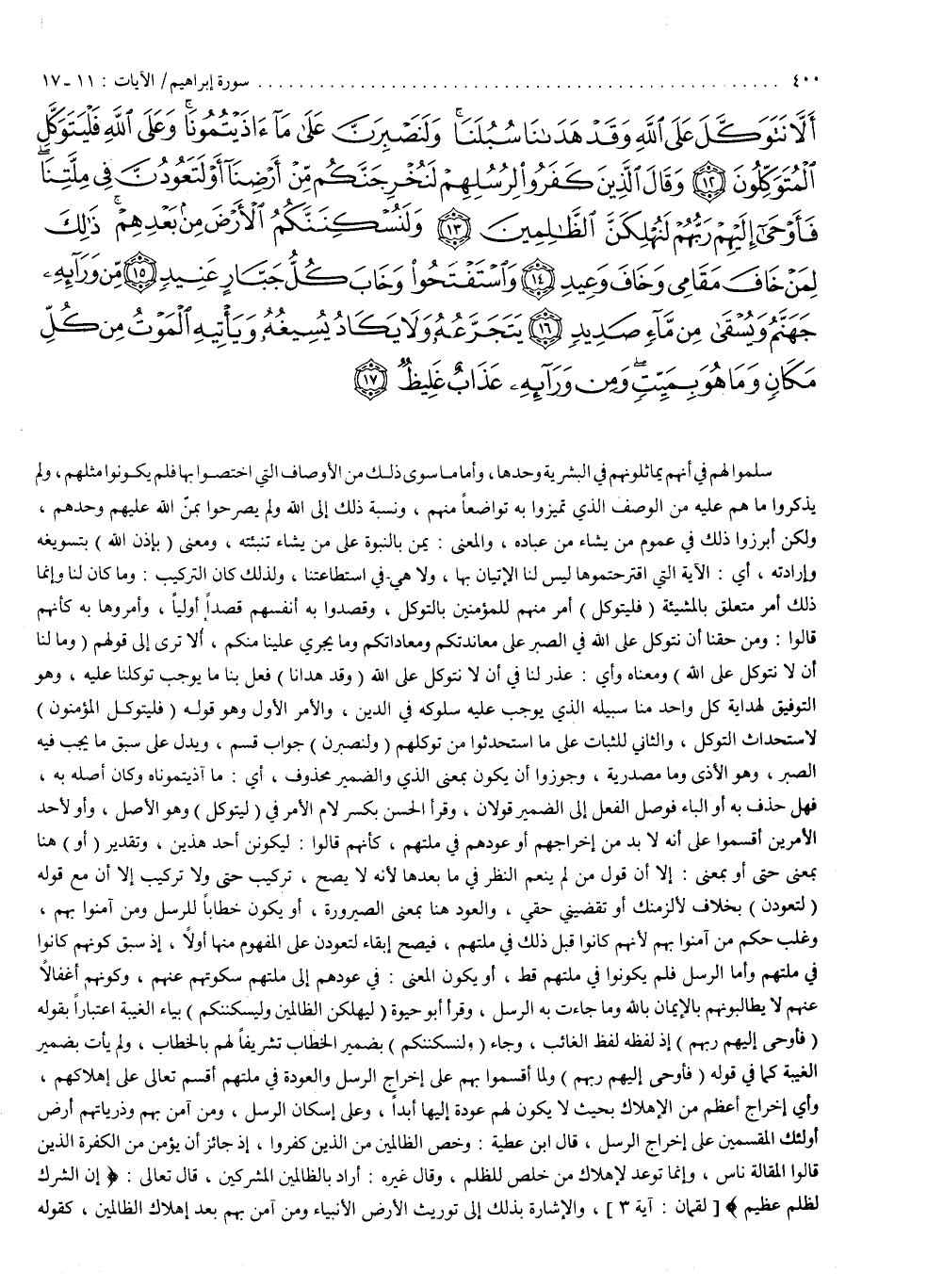 أَلاَّ نَتَوَكَّلَ عَلَى اللَّهِ وَقَدْ هَدَانَا سُبُلَنَا وَلَنَصْبِرَنَّ عَلَى مَآ آذَيْتُمُونَا وَعَلَى اللَّهِ فَلْيَتَوَكَّلِ الْمُتَوَكِّلُونَ وَقَالَ الَّذِينَ كَفَرُواْ لِرُسُلِهِمْ لَنُخْرِجَنَّكُمْ مِّنْ أَرْضِنَآ أَوْ لَتَعُودُنَّ فِى مِلَّتِنَا فَأَوْحَى إِلَيْهِمْ رَبُّهُمْ لَنُهْلِكَنَّ الظَّالِمِينَ وَلَنُسْكِنَنَّكُمُ الاٌّ رْضَ مِن بَعْدِهِمْ ذالِكَ لِمَنْ خَافَ مَقَامِى وَخَافَ وَعِيدِ وَاسْتَفْتَحُواْ وَخَابَ كُلُّ جَبَّارٍ عَنِيدٍ مِّن وَرَآئِهِ جَهَنَّمُ وَيُسْقَى مِن مَّآءٍ صَدِيدٍ يَتَجَرَّعُهُ وَلاَ يَكَادُ يُسِيغُهُ وَيَأْتِيهِ الْمَوْتُ مِن كُلِّ مَكَانٍ وَمَا هُوَ بِمَيِّتٍ وَمِن وَرَآئِهِ عَذَابٌ غَلِيظٌ ( )