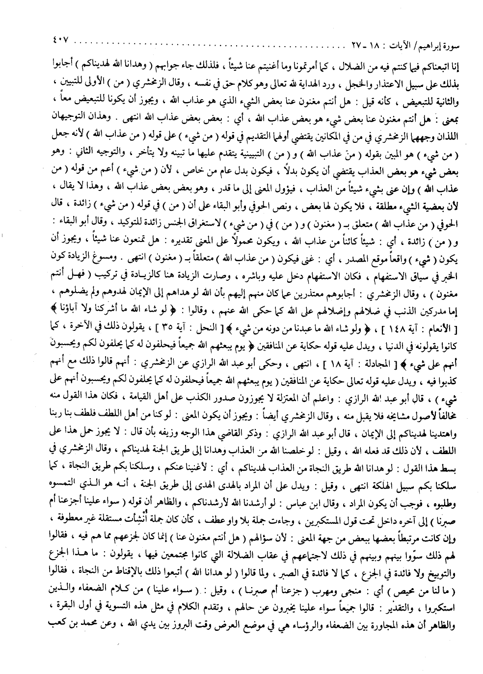 إنا اتبعناكم فيما كنتم فيه من الضلال كما أمرتمونا وما أغنيتم عنا شيئاً ، فلذلك جاء جوابهم : لو هدانا الله لهديناكم ، أجابوا بذلك على سبيل الاعتذار والخجل ورد الهداية لله تعالى ، وهو كلام حق في نفسه . وقال الزمخشري : من الأولى للتبيين ، والثانية للتبعيض ، كأنه قيل : هل أنتم مغنون عنا بعض الشيء الذي هو عذاب الله ؟ ويجوز أن يكونا للتبعيض معاً بمعنى : هل أنتم مغنون عنا بعض شيء ، هو بعض عذاب الله أي : بعض بعض عذاب الله انتهى . وهذان التوجيهان اللذان وجههما الزمخشري في من في المكانين يقتضي أولهما التقديم في قوله : من شيء على قوله : من عذاب الله ، لأنه جعل من شيء هو المبين بقوله : من عذاب الله . ومن التبيينية يتقدم عليها ما تبينه ، ولا يتأخروا لتوجيه لثاني ، وهو بعض شيء ، هو بعض العذاب يقتضي أن يكون بدلاً ، فيكون بدل عام من خاص ، لأنّ من شيء أعم من قوله : من عذاب الله ، وإن عنى بشيء شيئاً من العذاب فيؤول المعنى إلى ما قدر ، وهو بعض بعض عذاب الله . وهذا لا يقال ، لأنّ بعضية الشيء مطلقة ، فلا يكون لها بعض . ونص الحوفي ، وأبو البقاء : على أنّ مِن في قوله : من شيء ، زائدة . قال الحوفي : من عذاب الله متعلق بمغنون ، ومن في من شيء لاستغراق الجنس ، زائدة للتوكيد . وقال أبو البقاء : ومِن زائدة أي : شيئاً كائناً من عذاب الله ، ويكون محمولاً على المعنى تقديره : هل تمنعون عنا شيئاً ؟ ويجوز أن يكون شيء واقعاً موقع المصدر أي : غنى فيكون من عذاب الله متعلقاً بمغنون انتهى . ومسوغ الزيادة كون الخبر في سياق الاستفهام ، فكان الاستفهام دخل عليه وباشره ، وصارت الزيادة هنا كالزيادة في تركيب : فهل تغنون . وقال الزمخشري : أجابوهم معتذرين عما كان منهم إليهم بأنّ الله لو هداهم إلى الإيمان لهدوهم ، ولم يضلوهم إما مدركين الذنب في ضلالهم ، وإضلالهم على الله كما حكى الله عنهم . وقالوا : لو شاء الله ما أشركنا ولا آباؤنا ، ولو شاء الله ما عبدنا من دونه من شيء ، يقولون ذلك في الآخرة كما كانوا يقولونه في الدنيا ، ويدل عليه قوله حكاية عن المنافقين : ) يَوْمَ يَبْعَثُهُمُ اللَّهِ جَمِيعاً فَيَحْلِفُونَ لَهُ كَمَا يَحْلِفُونَ لَكُمْ وَيَحْسَبُونَ أَنَّهُمْ عَلَى شَىْء ( انتهى . وحكى أبو عبد الله الرازي عن الزمخشري أنهم قالوا ذلك مع أنهم كذبوا فيه ، ويدل عليه قوله تعالى حكاية عن المنافقين : يوم يبعثهم الله جميعاً فيحلفون له كما يحلفون لكم ويحسبون أنهم على شيء . قال أبو عبد الله الرازي : واعلم أنّ المعتزلة لا يجوزون صدور الكذب على أهل القيامة ، فكان هذا القول منه مخالفاً لأصول مشايخه ، لا يقبل منه . وقال الزمخشري أيضاً : ويجوز أن يكون المعنى : لو كنا من أهل اللطف فلطف بنا ربنا . واهتدينا لهديناكم إلى الإيمان . قال أبو عبد الله الرازي : وذكر القاضي هذا الوجه وزيفه بأنْ قال : لا يجوز حمل هذا على اللطف ، لأن ذلك قد فعله الله . وقيل : لو خلصنا الله من العذاب وهدانا إلى طريق الجنة لهديناكم . وقال الزمخشري في بسط هذا القول : لو هدانا الله طريق النجاة من العذاب لهديناكم أي : لأغنينا عنكم وسلكنا بكم طريق النجاة ، كما سلكنا بكم سبيل الهلكة انتهى . وقيل : ويدل على أنّ المراد بالهدى الهدى إلى طريق الجنة ، أنه هو الذي التمسوه وطلبوه ، فوجب أن يكون المراد . وقال ابن عباس : لو أرشدنا الله لأرشدناكم . والظاهر أنّ قوله : سواء علينا أجزعنا أم صبرنا إلى آخره ، داخل تحت قول المستكبرين ، وجاء تجمله بلا واو عطف ، كأن كل جملة أنشئت مستقلة غير معطوفة ، وإن كانت مرتبطاً بعضها ببعض من جهة المعنى لأنّ سؤالهم : هل أنتم مغنون عنا ؟ إنما كان لجزعهم مما هم فيه فقالوا ذلك : سوّوا بينهم ، وبينهم في ذلك لاجتماعهم في عقاب الضلالة التي كانوا مجتمعين فيها ، يقولون : ما هذا الجزع والتوبيخ ، ولا فائدة في الجزع كما لا فائدة في الصبر . ولما قالوا : لو هدانا الله ، أتبعوا ذلك بالإقناط من النجاة فقالوا : ما لنا من محيص : أي منجى ومهرب ، جزعنا أم صبرنا . وقيل : سواء علينا من كلام الضعفاء والذين استكبروا والتقد