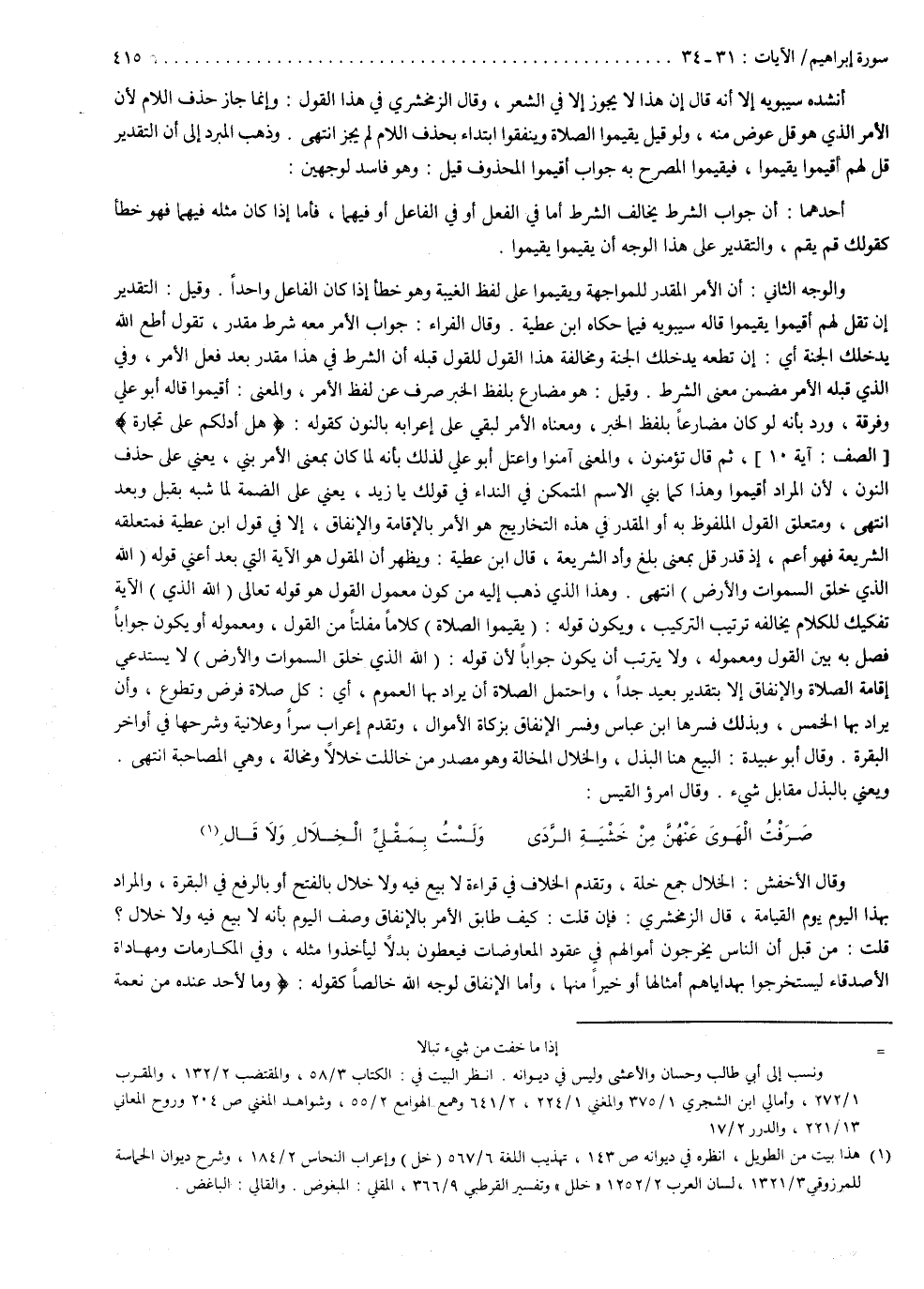 أنشده سيبويه إلا أنه قال : إنّ هذا لا يجوز إلا في الشعر . وقال الزمخشري في هذا القول : وإنما جاز حذف اللام لأن الأمر الذي هو قل ، عوض منه . ولو قيل : يقيموا الصلاة وينفقوا ابتداء بحذف اللام ، لم يجز انتهى . وذهب المبرد إلى أنّ التقدير : قل لهم أقيموا يقيموا ، فيقيموا المصرح به جواب أقيموا المحذوف قيل . وهو فاسد لوجهين : أحدهما : أنّ جواب الشرط يخالف الشرط إما في الفعل ، أو في الفاعل ، أو فيهما . فأما إذا كان مثله فيما فهو خطأ كقولك : قم يقم ، والتقدير على هذا الوجه : أن يقيموا يقيموا . والوجه الثاني : أن الأمر المقدر للمواجهة ويقيموا على لفظ الغيبة وهو خطأ إذا كان الفاعل واحداً . وقيل : التقدير أن تقل لهم أقيموا يقيموا قاله سيبويه فيما حكاه ابن عطية . وقال الفراء : جواب الأمر معه شرط مقدر تقول : أطع الله يدخلك الجنة ، أي إن تطعه يدخلك الجنة . ومخالفة هذا القول للقول قبله أنَّ الشرط في هذا مقدر بعد فعل الأمر ، وفي الذي قبله الأمر مضمن معنى الشرط . وقيل : هو مضارع بلفظ الخبر صرف عن لفظ الأمر ، والمعنى : أقيموا ، قاله أبو علي فرقة . ورد بأنه لو كان مضارعاً بلفظ الخبر ومعناه الأمر ، لبقي على إعرابه بالنون كقوله : ) هَلْ أَدُلُّكمْ عَلَى تِجَارَةٍ ( ثم قال : ) تُؤْمِنُونَ ( والمعنى : آمنوا . واعتل أبو علي لذلك بأنه لما كان بمعنى الأمر بني يعني : على حذف النون ، لأن المراد أقيموا ، وهذا كما بني الاسم المتمكن في النداء في قولك : يا زيد ، يعني على الضمة لما شبه بقبل وبعد انتهى ، ومتعلق القول الملفوظ به أو المقدر في هذه التخاريج هو الأمر بالإقامة والإنفاق ، إلا في قول ابن عطية فمتعلقه الشريعة فهو أعم ، إذ قدر قُلْ بمعنى بلِّغ وأدّ الشريعة . قال ابن عطية : ويظهرأن المقول هو الآية التي بعد أعني قوله : الله الذي خلق السموات والأرض انتهى . وهذا الذي ذهب إليه من كون معمول القول هو قوله تعالى الله الذي الآية تفكيك للكلام ، يخالفه ترتيب التركيب ، ويكون قوله : يقيموا الصلاة كلاماً مفلتاً من القول ومعموله ، أو يكون جواباً فصل به بين القول ومعموله ، ولا يترتب أن يكون جواباً ، لأن قوله : الله الذي خلق السموات والأرض ، لا يستدعي إقامة الصلاة والإنفاق إلا بتقدير بعيد جداً . واحتمل الصلاة أنْ يراد بها العموم أي : كل صلاة فرض وتطوع ، وأن يراد بها الخمس ، وبذلك فسرها ابن عباس . وفسر الإنفاق بزكاة الأموال . وتقدم إعراب ) سِرّا وَعَلاَنِيَةً ( وشرحها في أواخر البقرة .