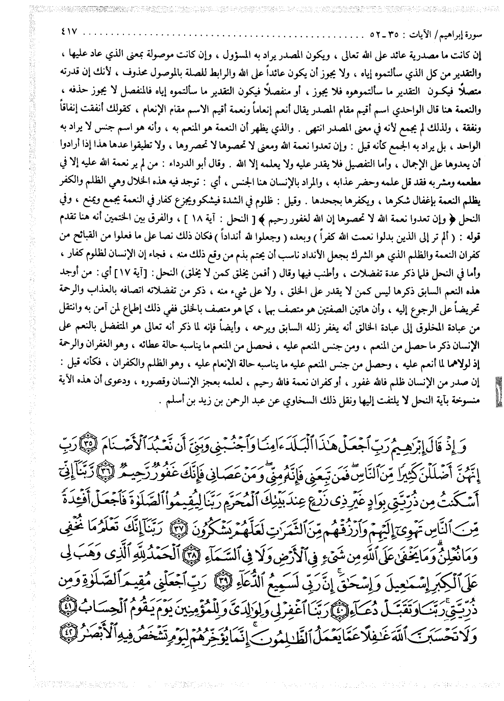 2 ( ) وَإِذْ قَالَ إِبْرَاهِيمُ رَبِّ اجْعَلْ هَاذَا الْبَلَدَ آمِنًا وَاجْنُبْنِى وَبَنِىَّ أَن نَّعْبُدَ الاٌّ صْنَامَ رَبِّ إِنَّهُنَّ أَضْلَلْنَ كَثِيرًا مِّنَ النَّاسِ فَمَن تَبِعَنِى فَإِنَّهُ مِنِّى وَمَنْ عَصَانِى فَإِنَّكَ غَفُورٌ رَّحِيمٌ رَّبَّنَآ إِنَّى أَسْكَنتُ مِن ذُرِّيَّتِى بِوَادٍ غَيْرِ ذِى زَرْعٍ عِندَ بَيْتِكَ الْمُحَرَّمِ رَبَّنَا لِيُقِيمُواْ الصَّلواةَ فَاجْعَلْ أَفْئِدَةً مَّنَ النَّاسِ تَهْوِىإِلَيْهِمْ وَارْزُقْهُمْ مِّنَ الثَّمَرَاتِ لَعَلَّهُمْ يَشْكُرُونَ رَبَّنَآ إِنَّكَ تَعْلَمُ مَا نُخْفِى وَمَا نُعْلِنُ وَمَا يَخْفَى عَلَى اللَّهِ مِن شَىْءٍ فَى الاٌّ رْضِ وَلاَ فِى السَّمَآءِ الْحَمْدُ للَّهِ الَّذِى وَهَبَ لِى عَلَى الْكِبَرِ إِسْمَاعِيلَ وَإِسْحَاقَ إِنَّ رَبِّى لَسَمِيعُ الدُّعَآءِ رَبِّ اجْعَلْنِى مُقِيمَ الصَّلواةِ وَمِن ذُرِّيَتِى رَبَّنَا وَتَقَبَّلْ دُعَآءِ رَبَّنَا اغْفِرْ لِى وَلِوَالِدَىَّ وَلِلْمُؤْمِنِينَ يَوْمَ يَقُومُ الْحِسَابُ وَلاَ تَحْسَبَنَّ اللَّهَ غَافِلاً عَمَّا يَعْمَلُ الظَّالِمُونَ إِنَّمَا يُؤَخِّرُهُمْ لِيَوْمٍ تَشْخَصُ فِيهِ الأَبْصَارُ