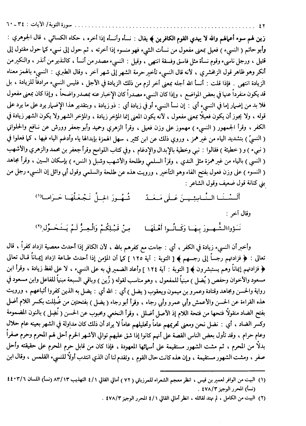 ( سقط : زين لهم سوء أعمالهم والله لا يهدي القوم الكافرين ) يقال : نسأه وأنسأه إذا أخَّره ، حكاه الكسائي . قال الجوهري وأبو حاتم : النسيء فعيل بمعنى مفعول ، من نسأت الشيء فهو منسوء إذا أخرته ، ثم حول إلى نسيء كما حول مقتول إلى قتيل . ورجل ناسىء ، وقوم نسأة ، مثل فاسق وفسقة انتهى . وقيل : النسيء مصدر من أنسأ ، كالنذير من أنذر ، والنكير من أنكر ، وهو ظاهر قول الزمخشري لأنه قال : النسيء تأخير حرمة الشهر إلى شهر آخر . وقال الطبري : النسيء بالهمز معناه الزيادة انتهى . فإذا قلت : أنسأ الله ؛ الله أجله بمعنى أخَّر ، لزم من ذلك الزيادة في الأجل ، فليس النسيء مرادفاً للزيادة ، بل قد يكون منفرداً عنها في بعض المواضع . وإذا كان النسيء مصدراً كان الإخبار عنه بمصدر واضحاً ، وإذا كان بمعنى مفعول فلا بد من إضمار إما في النسيء أي : إن نسأ النسيء ، أو في زيادة أي : ذو زيادة . وبتقدير هذا الإضمار يرد على ما يرد على قوله . ولا يجوز أن يكون فعيلاً بمعنى مفعول ، لأنه يكون المعنى : إنما المؤخر زيادة ، والمؤخر الشهر ، ولا يكون الشهر زيادة في الكفر .