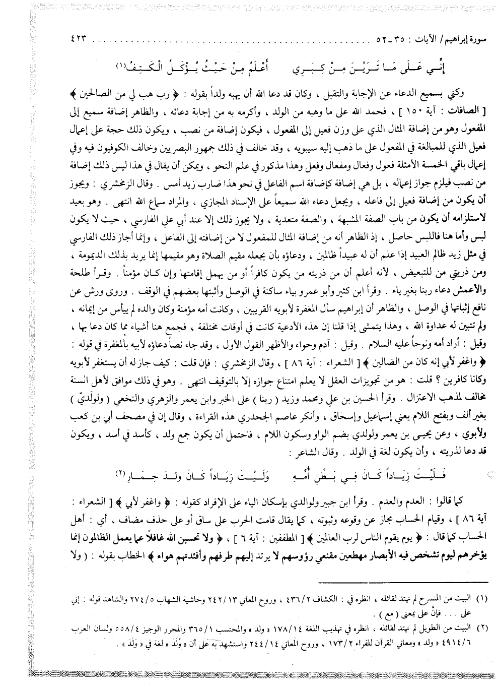 وكنى بسميع الدعاء عن الإجابة والتقبل ، وكان قد دعا الله أن يهبه ولداً بقوله : ) رَبّ هَبْ لِى مِنَ الصَّالِحِينِ ( فحمد الله على ما وهبه من الولد وأكرمه به من إجابة دعائه . والظاهر إضافة سميع إلى المفعول وهو من إضافة المثال الذي على وزن فعيل إلى المفعول ، فيكون إضافة من نصب ، ويكون ذلك حجة على إعمال فعيل الذي للمبالغة في المفعول على ما ذهب إليه سيبويه ، وقد خالف في ذلك جمهور البصريين ، وخالف الكوفيون فيه . وفي إعمال باقي الخمسة الأمثلة فعول ، وفعال ، ومفعال ، وفعل ، وهذا مذكور في علم النحو . ويمكن أن يقال في هذا ليس ذلك إضافة من نصب فيلزم جواز إعماله ، بل هي إضافة كإضافة اسم الفاعل في نحو : هذا ضارب زيد أمس . وقال الزمخشري : ويجوز أن يكون من إضافة فعيل إلى فاعله ، ويجعل دعاء الله سميعاً على الإسناد المجازي ، والمراد : سماع الله انتهى . وهو بعيد لاستلزامه أن يكون من باب السفة المشبهة ، والصفة متعدية ، ولا يجوز ذلك إلا عند أبي علي الفارسي حيث لا يكون لبس . وأما هنا فاللبس حاصل ، إذ الظاهر أنه من إضافة المثال للمفعول ، لا من إضافته إلى الفاعل . وإنما أجاز ذلك الفارسي في مثل : زيد ظالم العبيد إذا علم أنّ له عبيداً ظالمين . ودعاؤه بأنْ يجعله مقيم الصلاة وهو مقيمها ، إنما يريد بذلك الديمومة . ومن ذريتي ، من للتبعيض ، لأنه أعلم أنّ من ذريته من يكون كافراً ، أو من يهمل إقامتها وإن كان مؤمناً . وقرأ طلحة ، والأعمش : دعاء ربنا بغير ياء . وقرأ ابن كثير ، وأبو عمرو : بياء ساكنة في الوصل ، وأثبتها بعضهم في الوقف . وروي ورش عن نافع : إثباتها في الوصل . والظاهر أنّ إبراهيم سأل المغفرة لأبويه القريبين ، وكانت أمه مؤمنة ، وكان والده لم ييأس من إيمانه ولم تتبين له عداوة الله ، وهذا يتمشى إذا قلنا : إن هذه الأدعية كانت في أوقات مختلفة ، فجمع هنا أشياء مما كان دعا بها . وقيل : أراد أمه ، ونوحاً عليه السلام . وقيل : آدم وحواء . والأظهر القول الأول . وقد جاء نصاً دعاؤه لأبيه بالمغفرة في قوله : ) وَاغْفِرْ لاِبِى إِنَّهُ كَانَ مِنَ الضَّالّينَ ( وقال الزمخشري : ( فإن قلت ) : كيف جاز له أن يستغفر لأبويه وكانا كافرين ؟ ( قلت ) : هو من تجويزات العقل ، لا يعلم امتناع جوازه إلا بالتوقيف انتهى . وهو في ذلك موافق لأهل السنة ، مخالف لمذهب الاعتزال . وقرأ الحسين بن علي ، ومحمد ، وزيد : ربنا على الخبر . وابن يعمر والزهري والنخعي : ولولديّ بغير ألف وبفتح اللام يعني : إسماعيل وإسحاق ، وأنكر عاصم الجحدري هذه القراءة ، وقال : إنّ في مصحف أبيَّ بن كعب : ولأبوي ، وعن يحيى بن يعمر : ولولدي بضم الواو وسكون اللام ، فاحتمل أنْ يكون جمع ولد كأسد في أسد ، ويكون قد دعا لذريته ، وأن يكون لغة في الولد . وقال الشاعر : فليت زياداً كان في بطن أمه