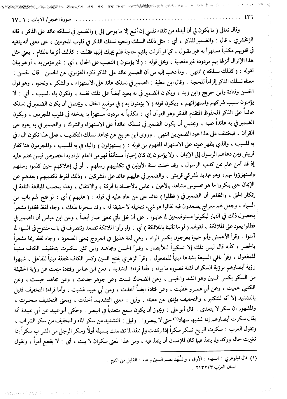 وقال تعالى : ) مَا يَكُونُ لِى أَنْ أُبَدّلَهُ مِن تِلْقَاء نَفْسِى إِنْ أَتَّبِعُ إِلاَّ مَا يُوحَى ( إلى والضمير في نسلكه عائد على الذكر قاله الزمخشري ، قال : والضمير للذكر أي : مثل ذلك السلك . ونحوه : نسلك الذكر في قلوب المجرمين على معنى أنه يلقيه في قلوبهم مكذباً مستهزأ به غير مقبول ، كما لو أنزلت بلئيم حاجة فلم يجبك إليها فقلت : كذلك أنزلها باللئام يعني : مثل هذا الإنزال أنزلها بهم ، مردودة غير مقصية . ومحل قوله : لا يؤمنون النصب على الحال أي : غير مؤمن به ، أو هو بيان لقوله : كذلك نسلكه انتهى . وما ذهب إليه من أنّ الضمير عائد على الذكر ذكره الغرنوي عن الحسن . قال الحسن : معناه نسلك الذكر إلزاماً للحجة . وقال ابن عطية : الضمير في نسلكه عائد على الاستهزاء والشرك ونحوه ، وهو قول : الحسن ، وقتادة ، وابن جريج ، وابن زيد . ويكون الضمير في به يعود أيضاً على ذلك نفسه ، وتكون باء السبب أي : لا يؤمنون بسبب شركهم واستهزائهم ، ويكون قوله : لا يؤمنون به في موضع الحال ، ويحتمل أن يكون الضمير في نسلكه عائداً على الذكر المحفوظ المتقدم الذكر وهو القرآن أي : مكذباً به مردوداً مستهزأ به ، يدخله في قلوب المجرمين . ويكون الضمير في به عائداً عليه ، ويحتمل أن يكون الضمير في نسلكه عائداً على الاستهزاء والشرك ، والضمير في به يعود على القرآن ، فيختلف على هذا عود الضميرين انتهى . وروى ابن جريج عن مجاهد بذلك التكذيب ، فعلى هذا تكون الباء في به للسبب . والذي يظهر عوده على الاستهزاء المفهوم من قوله : يستهزؤون ، والباء في به للسبب . والمجرمون هنا كفار قريش ، ومن دعاهم الرسول إلى الإيمان . ولا يؤمنون إن كان إخباراً مستأنفاً فهو من العام المراد به الخصوص فيمن ختم عليه ، إذ قد آمن عالم ممن كذب الرسول . وقد خلت سنة الأولين في تكذيبهم رسلهم ، أو في إهلاكهم حين كذبوا رسلهم ، واستهزؤوا بهم ، وهو تهديد لمشركي قريش . والضمير في عليهم عائد على المشركين ، وذلك لفرط تكذيبهم وبعدهم عن الإيمان حتى ينكروا ما هو محسوس مشاهد بالأعين مماس بالأجساد بالحركة والانتقال ، وهذا بحسب المبالغة التامة في إنكار الحق . والظاهر أنّ الضمير في فظلوا عائد على من عاد عليه في قوله : عليهم ، أي : لو فتح لهم باب من السماء ، وجعل لهم معراج يصعدون فيه لقالوا : هو شيء تتخيله لا حقيقة له ، وقد سخرنا بذلك . وجاء لفظ فظلوا مشعراً بحصول ذلك في النهار ليكونوا مستوضحين لما عاينوا ، على أنّ ظل يأتي بمعنى صار أيضاً . وعن ابن عباس أنّ الضمير في فظلوا يعود على الملائكة لقولهم : ) لَّوْ مَا تَأْتِينَا بِالْمَلَئِكَةِ ( أي : ولو رأوا الملائكة تصعد وتنصرف في باب مفتوح في السماء لما آمنوا .