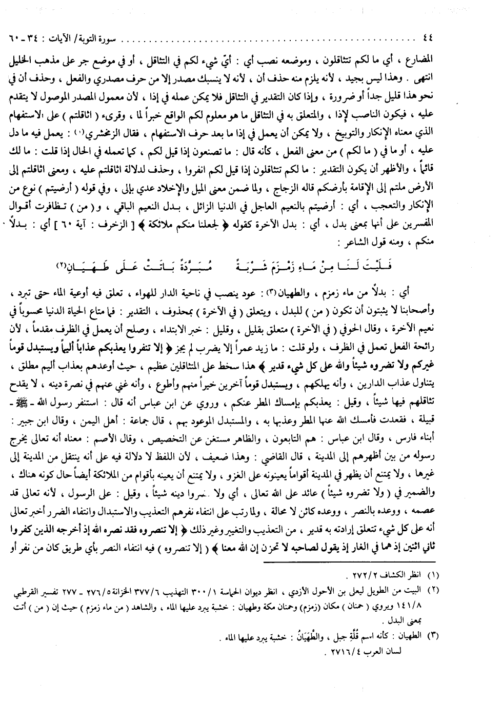 المضارع أي : ما لكم تتثاقلون ، وموضعه نصب . أي : أيُّ شيء لكم في التثاقل ، أو في موضع جر على مذهب الخليل انتهى . وهذا ليس بجيد ، لأنه يلزم منه حذف أنْ ، لأنه لا ينسبك مصدر إلا من حرف مصدري والفعل ، وحذف أنْ في نحو هذا قليل جداً أو ضرورة . وإذا كان التقدير في التثاقل فلا يمكن عمله في إذا ، لأن معمول المصدر الموصول لا يتقدم عليه فيكون الناصب لإذا ، والمتعلق به في التثاقل ما هو معلوم لكم الواقع خبراً لما . وقرىء : اثاقلتم على الاستفهام الذي معناه الإنكار والتوبيخ ، ولا يمكن أن يعمل في إذ ما بعد حرف الاستفهام . فقال الزمخشري : يعمل فيه ما دل عليه ، أو ما في ما لكم من معنى الفعل ، كأنه قال : ما تصنعون إذا قيل لكم ، كما تعمله في الحال إذا قلت : ما لك قائماً . والأظهر أن يكون التقدير : ما لكم تتثاقلون إذا قيل لكم انفروا ، وحذف لدلالة اثاقلتم عليه . ومعنى اثاقلتم إلى الأرض : ملتم إلى شهوات الدنيا حين أخرجت الأرض ثمارها قاله مجاهد وكرهتم مشاق السفر . وقيل ملتم إلى الإقامة بأرضكم قاله : الزجاج . ولما ضمن معنى الميل والإخلاد عدى بإلى . وفي قوله : أرضيتم ، نوع من الإنكار والتعجب أي : أرضيتم بالنعيم العاجل في الدنيا الزائل بدل النعيم الباقي . ومِن تظافرت أقوال المفسرين على أنها بمعنى بدل أي : بدل الآخرة كقوله : ) لَجَعَلْنَا مِنكُمْ مَّلَئِكَةً ( أي بدلاً ، ومنه قول الشاعر : فليت لنا من ماء زمزم شربة