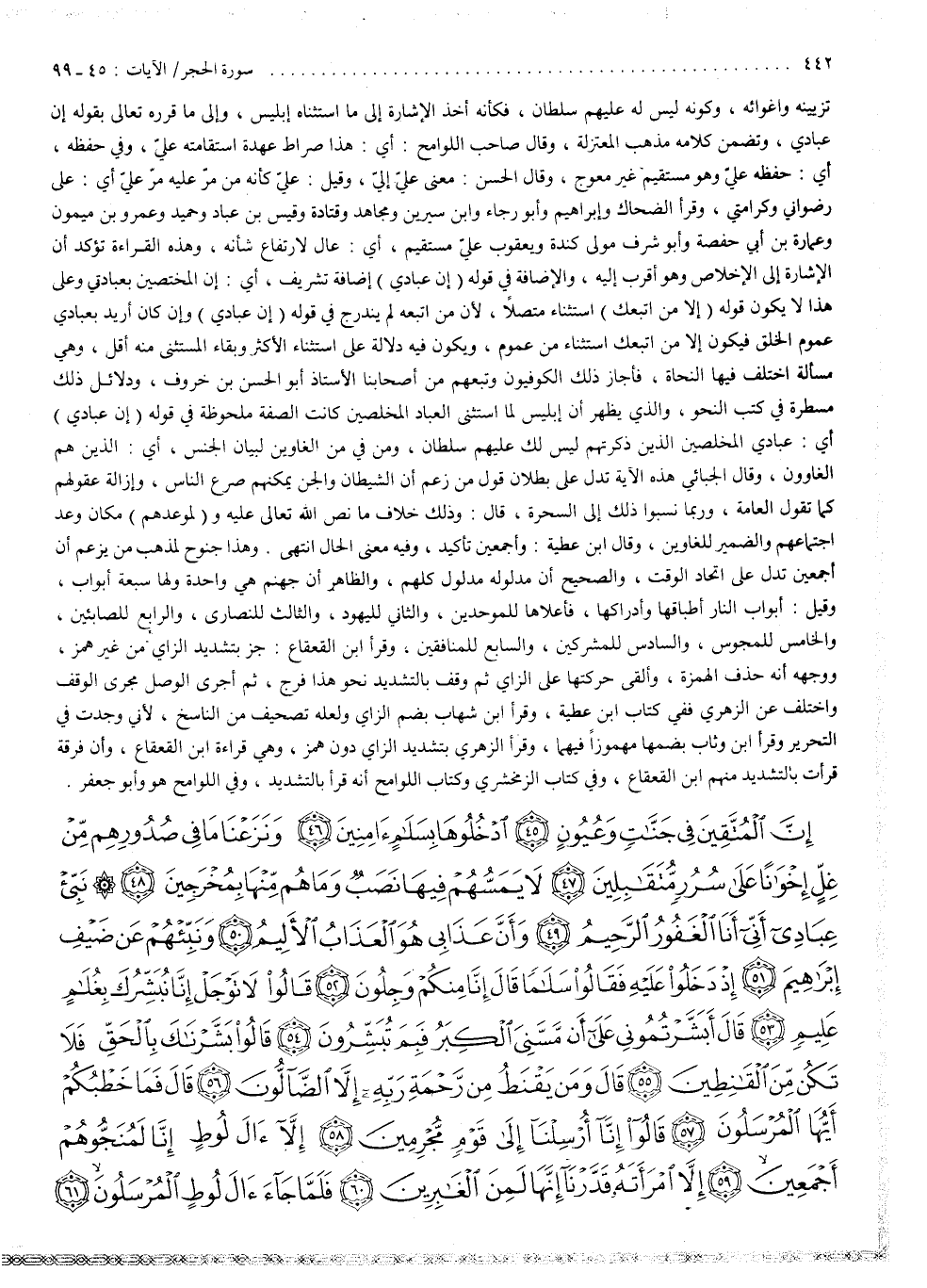 2 ( ) إِنَّ الْمُتَّقِينَ فِى جَنَّاتٍ وَعُيُونٍ ادْخُلُوهَا بِسَلامٍ ءَامِنِينَ وَنَزَعْنَا مَا فِى صُدُورِهِم مِّنْ غِلٍّ إِخْوَانًا عَلَى سُرُرٍ مُّتَقَابِلِينَ لاَ يَمَسُّهُمْ فِيهَا نَصَبٌ وَمَا هُمْ مِّنْهَا بِمُخْرَجِينَ نَبِّىءْ عِبَادِى أَنِّى أَنَا الْغَفُورُ الرَّحِيمُ وَأَنَّ عَذَابِى هُوَ الْعَذَابُ الاٌّ لِيمُ وَنَبِّئْهُمْ عَن ضَيْفِ إِبْرَاهِيمَ إِذْ دَخَلُواْ عَلَيْهِ فَقَالُواْ سَلامًا قَالَ إِنَّا مِنْكُمْ وَجِلُونَ قَالُواْ لاَ تَوْجَلْ إِنَّا نُبَشِّرُكَ بِغُلَامٍ عَلِيمٍ قَالَ أَبَشَّرْتُمُونِى عَلَى أَن مَّسَّنِىَ الْكِبَرُ فَبِمَ تُبَشِّرُونَ قَالُواْ بَشَّرْنَاكَ بِالْحَقِّ فَلاَ تَكُن مِّنَ الْقَانِطِينَ قَالَ وَمَن يَقْنَطُ مِن رَّحْمَةِ رَبِّهِ إِلاَّ الضَّآلُّونَ قَالَ فَمَا خَطْبُكُمْ أَيُّهَا الْمُرْسَلُونَ قَالُواْ إِنَّآ أُرْسِلْنَآ إِلَى قَوْمٍ مُّجْرِمِينَ إِلاَ ءَالَ لُوطٍ إِنَّا لَمُنَجُّوهُمْ أَجْمَعِينَ إِلاَّ امْرَأَتَهُ قَدَّرْنَآ إِنَّهَا لَمِنَ الْغَابِرِينَ فَلَمَّا جَآءَ ءَالَ لُوطٍ الْمُرْسَلُونَ